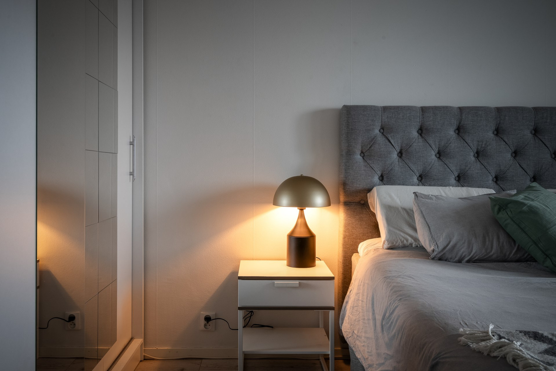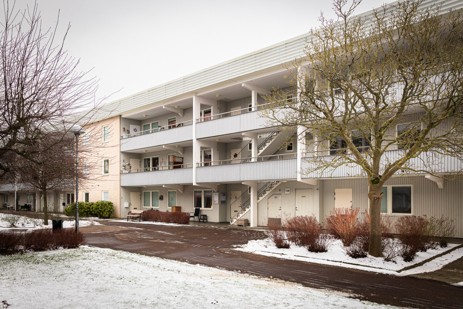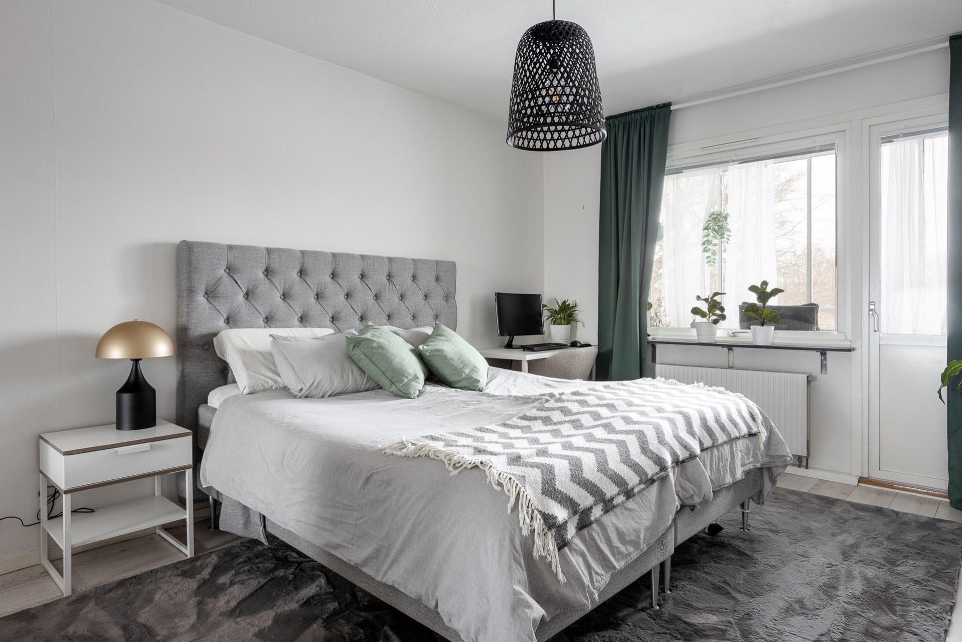 Stort sovrum med plats för dubbelsäng och annat möblemang enligt önskemål. Garderob i ena hörnan som erbjuder plats för kläder. Från sovrummet nås även den inglasade balkongen. På golvet ligger ett ljust laminat och väggarna är vita.