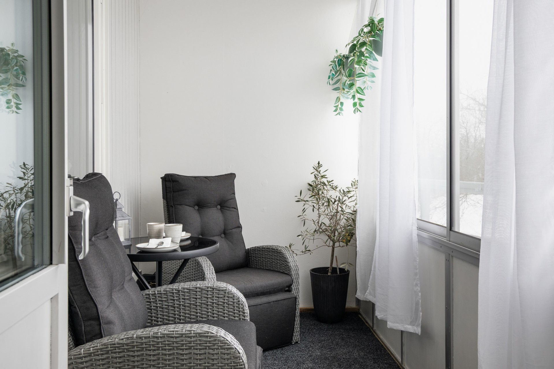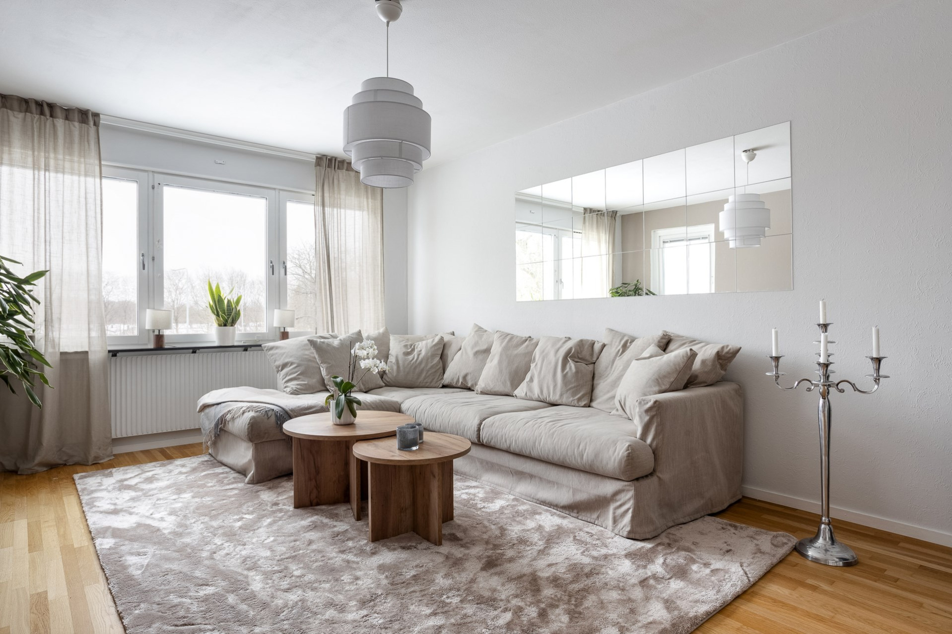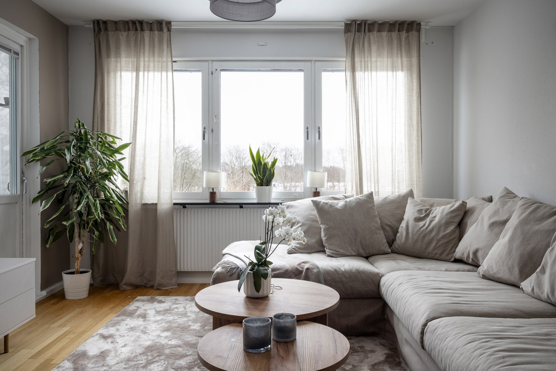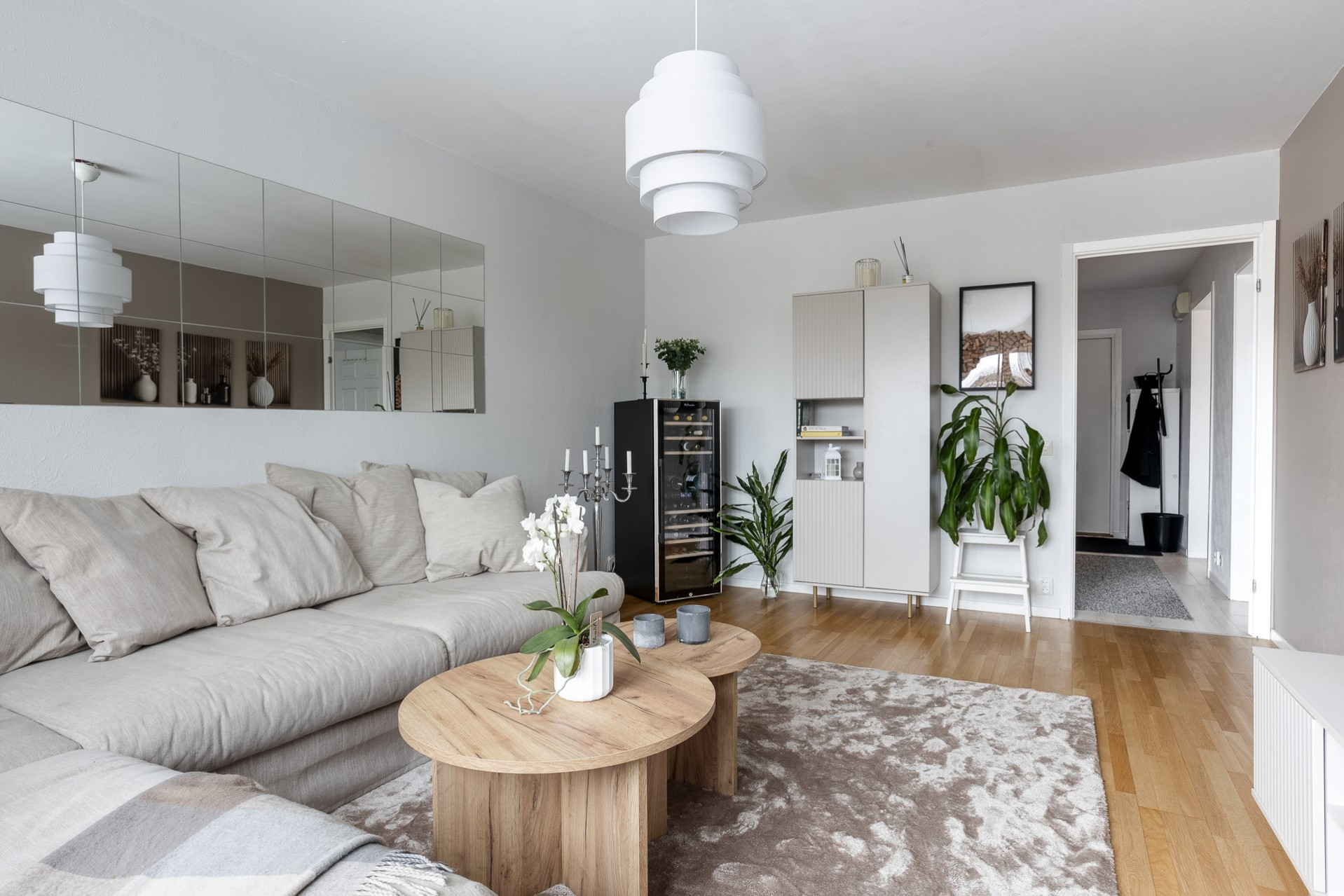 Generöst vardagsrum med plats för stor soffgrupp och annat önskat möblemang. Stora fönsterpartier som släpper in rikligt med ljus. Från vardagsrummet har man direkt utgång till den härliga inglasade balkongen som blir en förlängning av bostaden. Från vardagsrummet nås även sovrummet. På golvet ligger ett fint parkett och väggarna är ljusa varvat med en beige fondvägg som snyggt bryter av mot det ljusa.