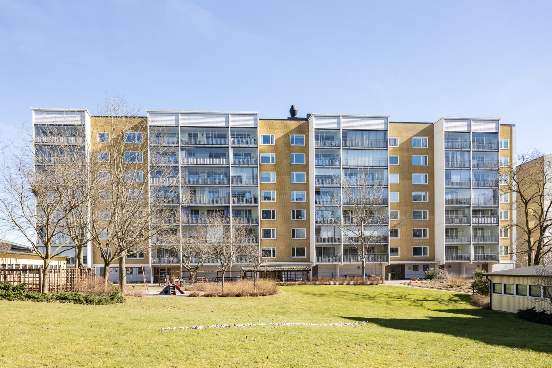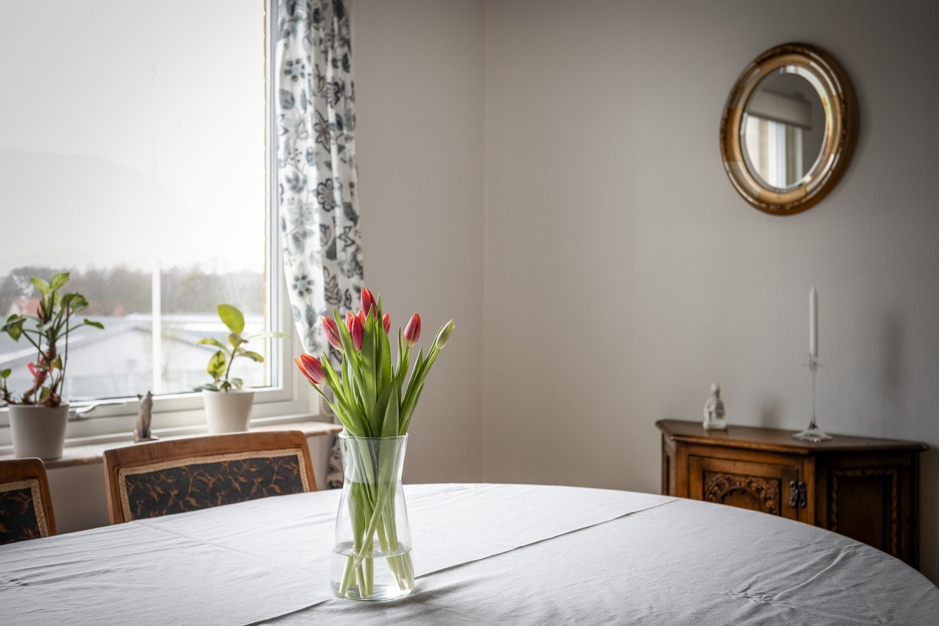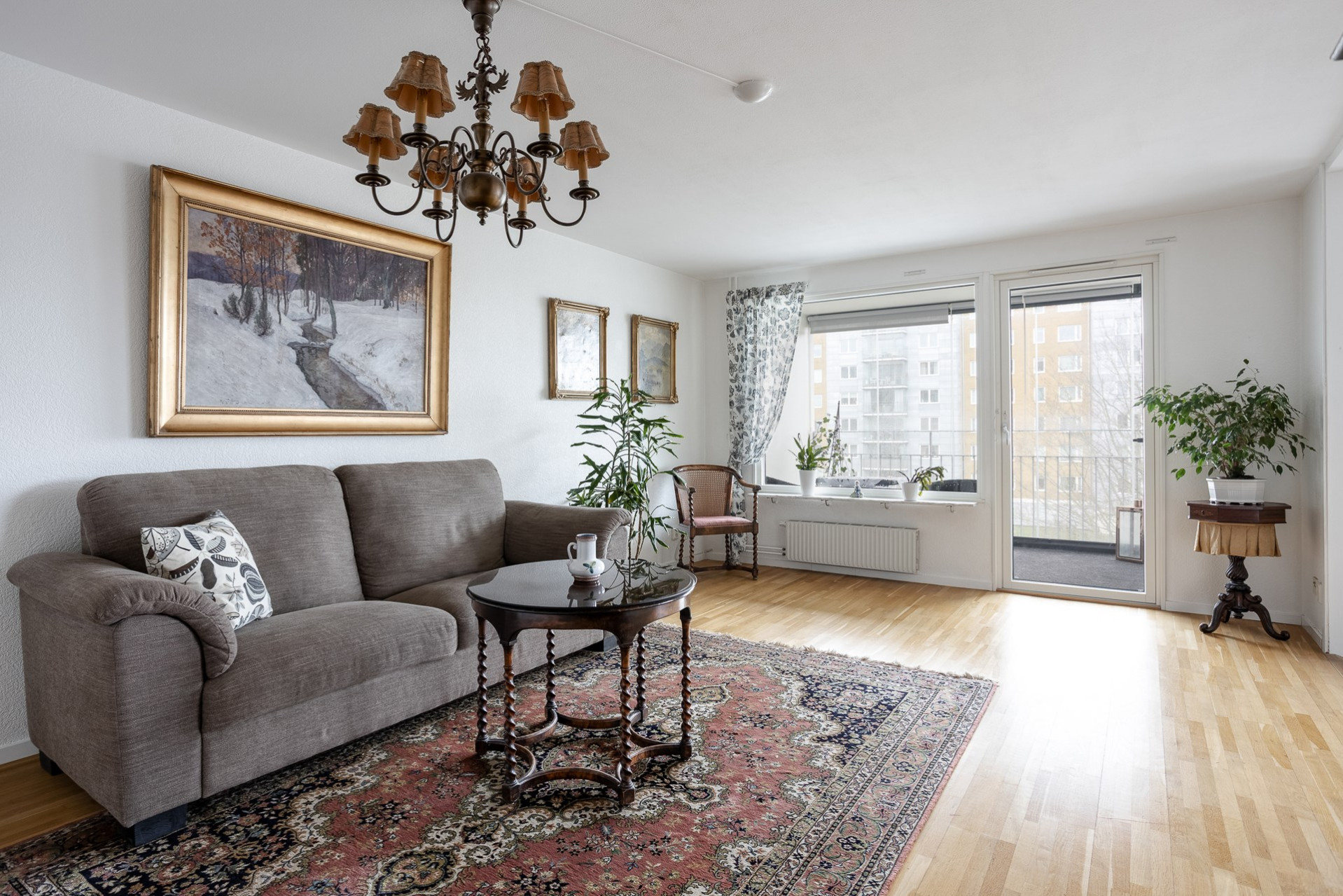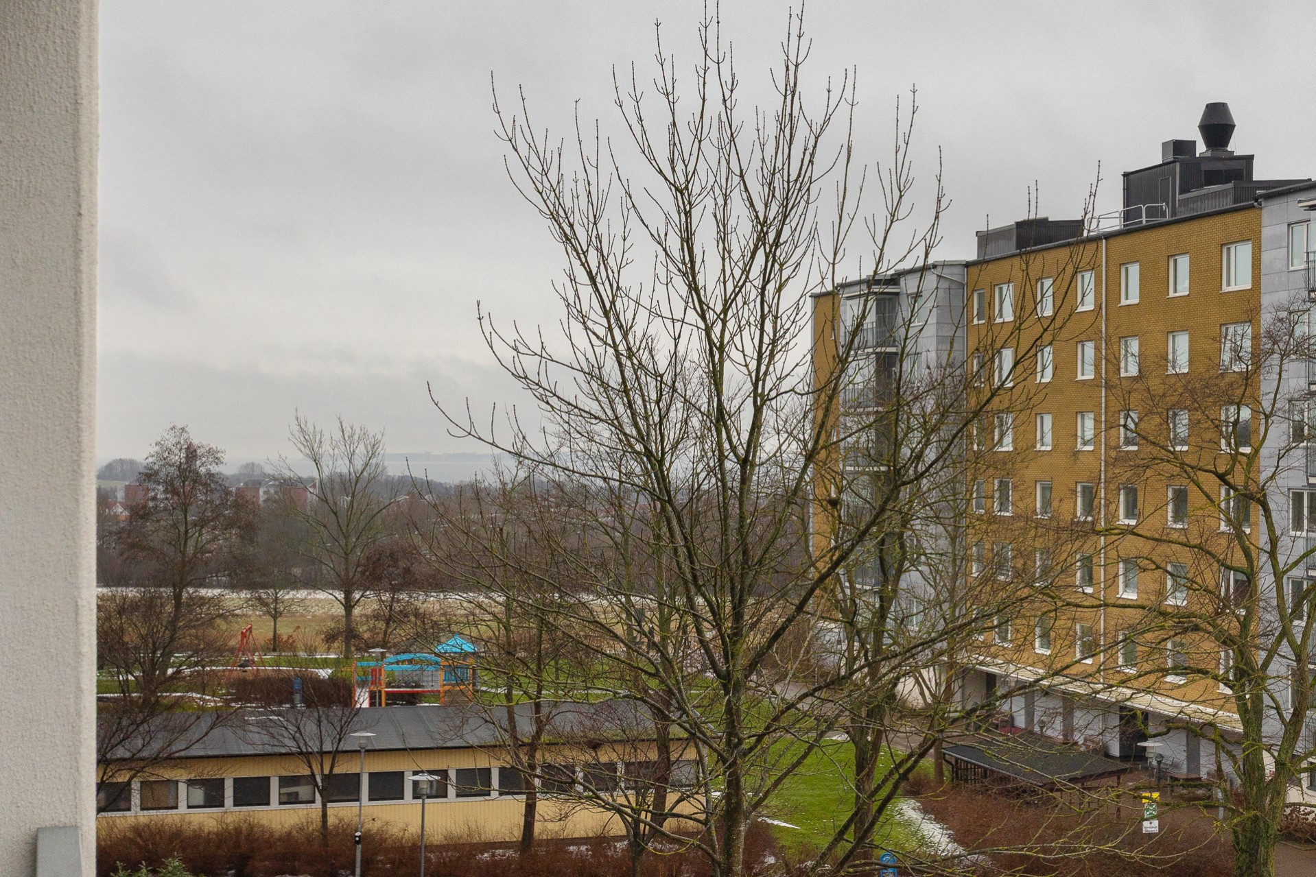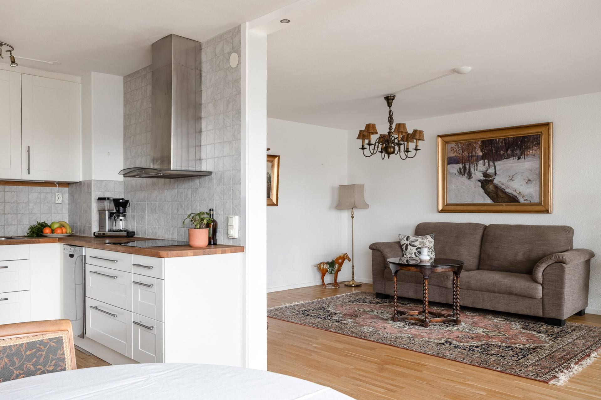 Från vardagsrummet finns utgången till den stora och inglasade balkongen i nordväst med fin vy över gården och vidare ut över omkringliggande grönområden.