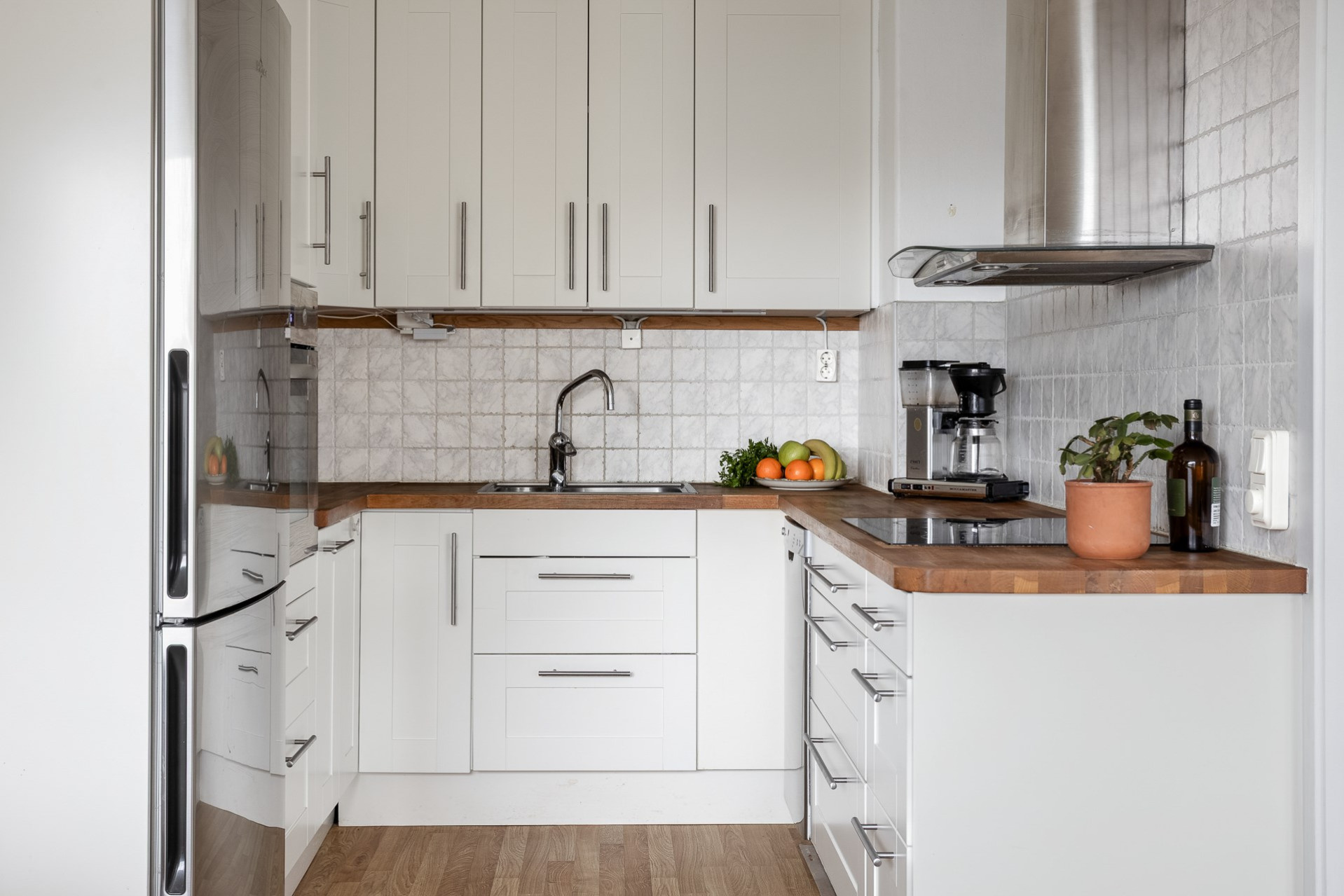 Trevligt arbetskök med vit skåpsinredning och ljus kakel på väggarna.