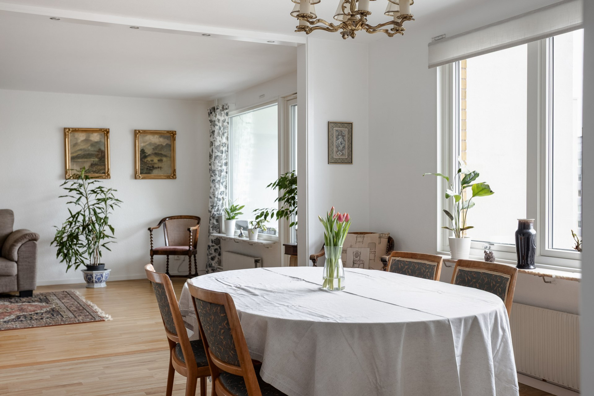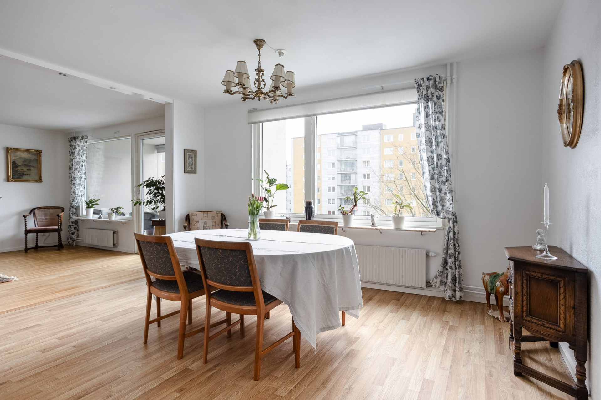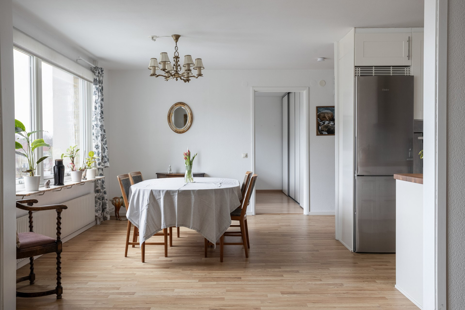 Stor och luftig yta med öppen planlösning in mot både kök och vardagsrum. Här får man plats många sittande runt bordet och utsikt över grönskan utanför erbjuds via de stora fönstren.