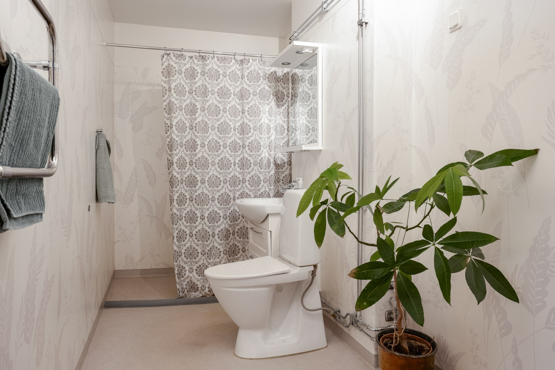 Fräscht renoverat badrum med plastmatta i ljus nyans. Här finns dusch, handfat, wc och gott om plats för den som önskar sätta in tvättmaskin och torktumlare.