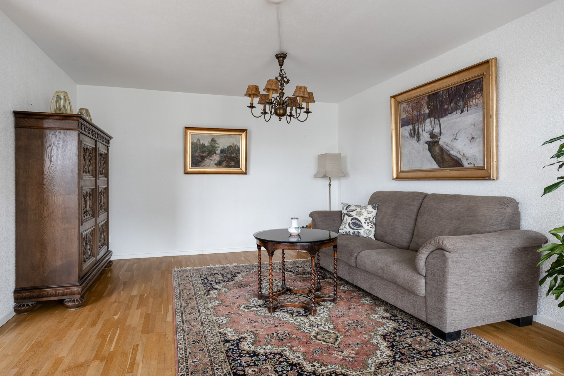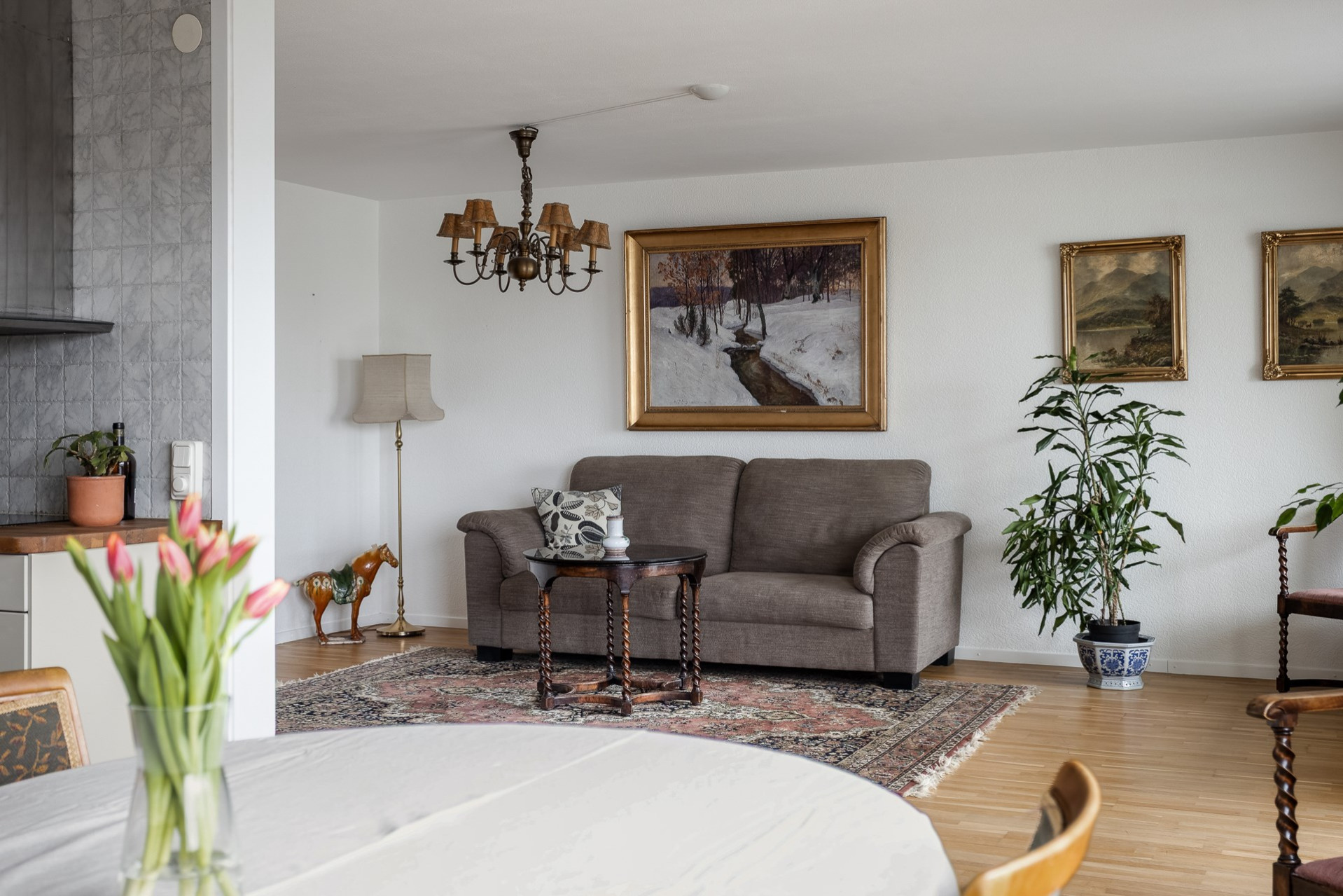 Rymligt vardagsrum med stor plats för både soffa, tv och diverse övrig möblering tack vare att matplatsen har ett eget utrymme.