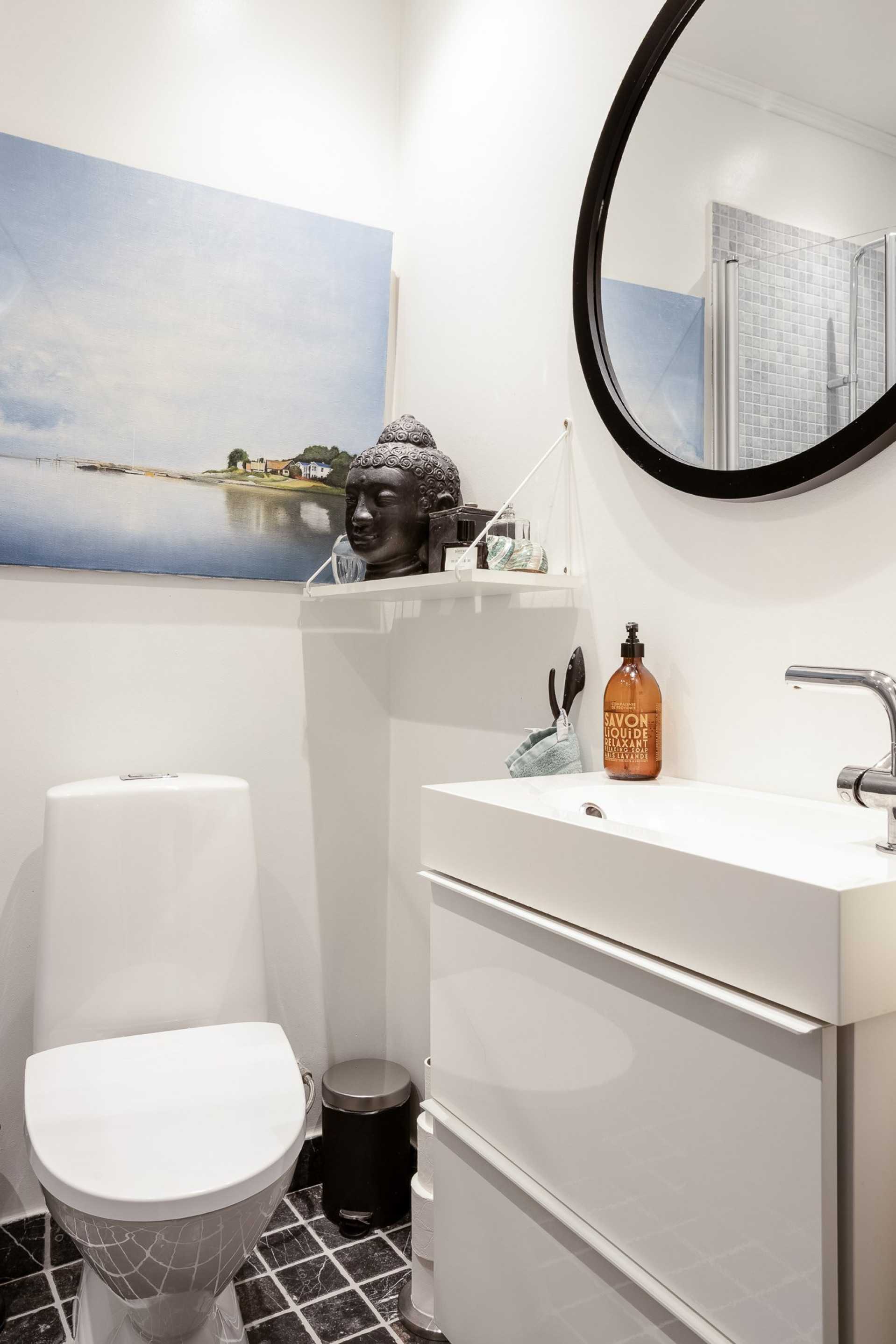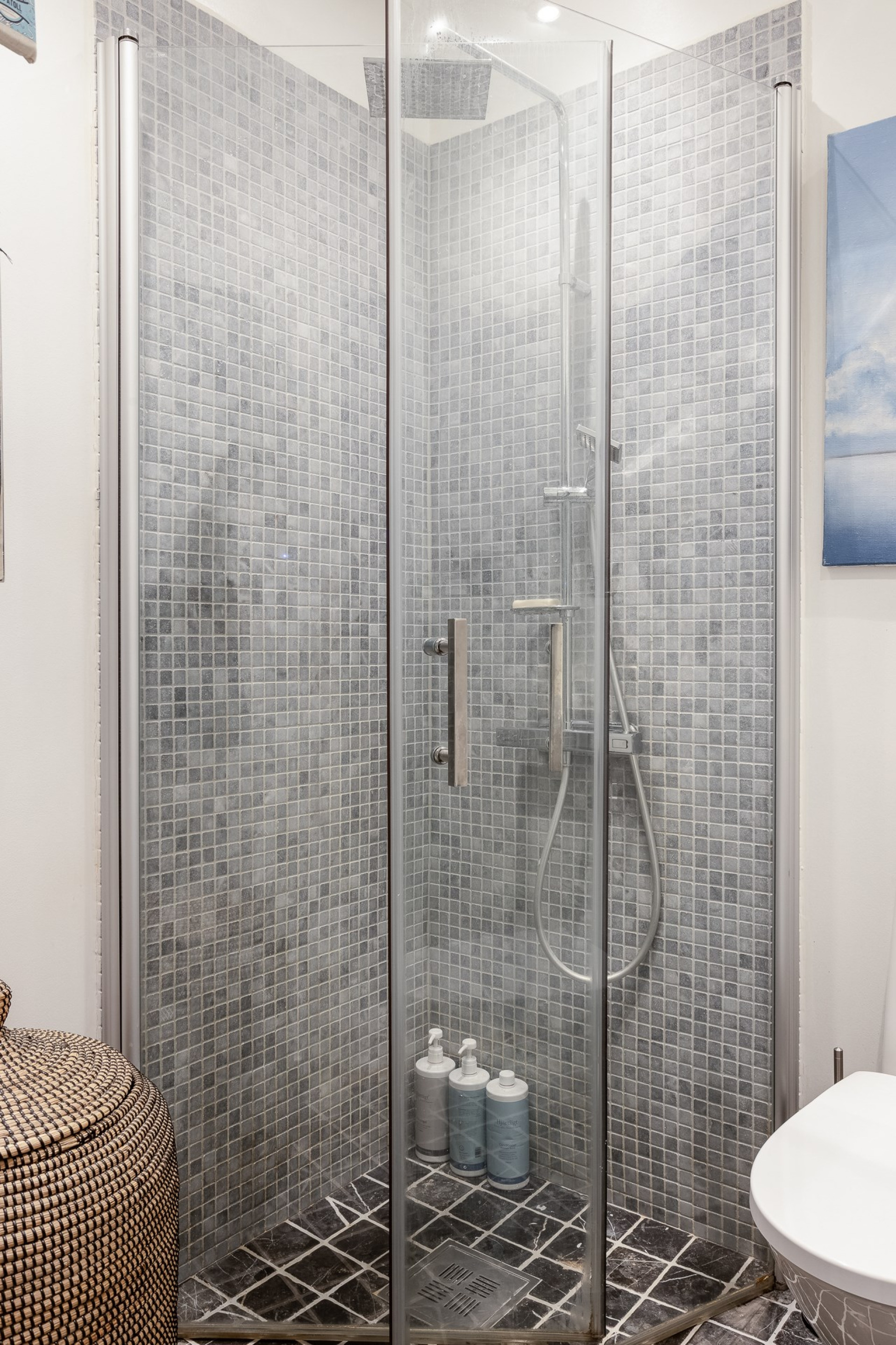 Badrummet är totalrenoverad 2018 med grå mosaik i duschhörna, grått klinkergolv och vita väggarn. WC och handfat med kommod, spegel och spotlights i tak. Duschhörna med glasdörrar samt förberett att stätta in tvättmaskin.