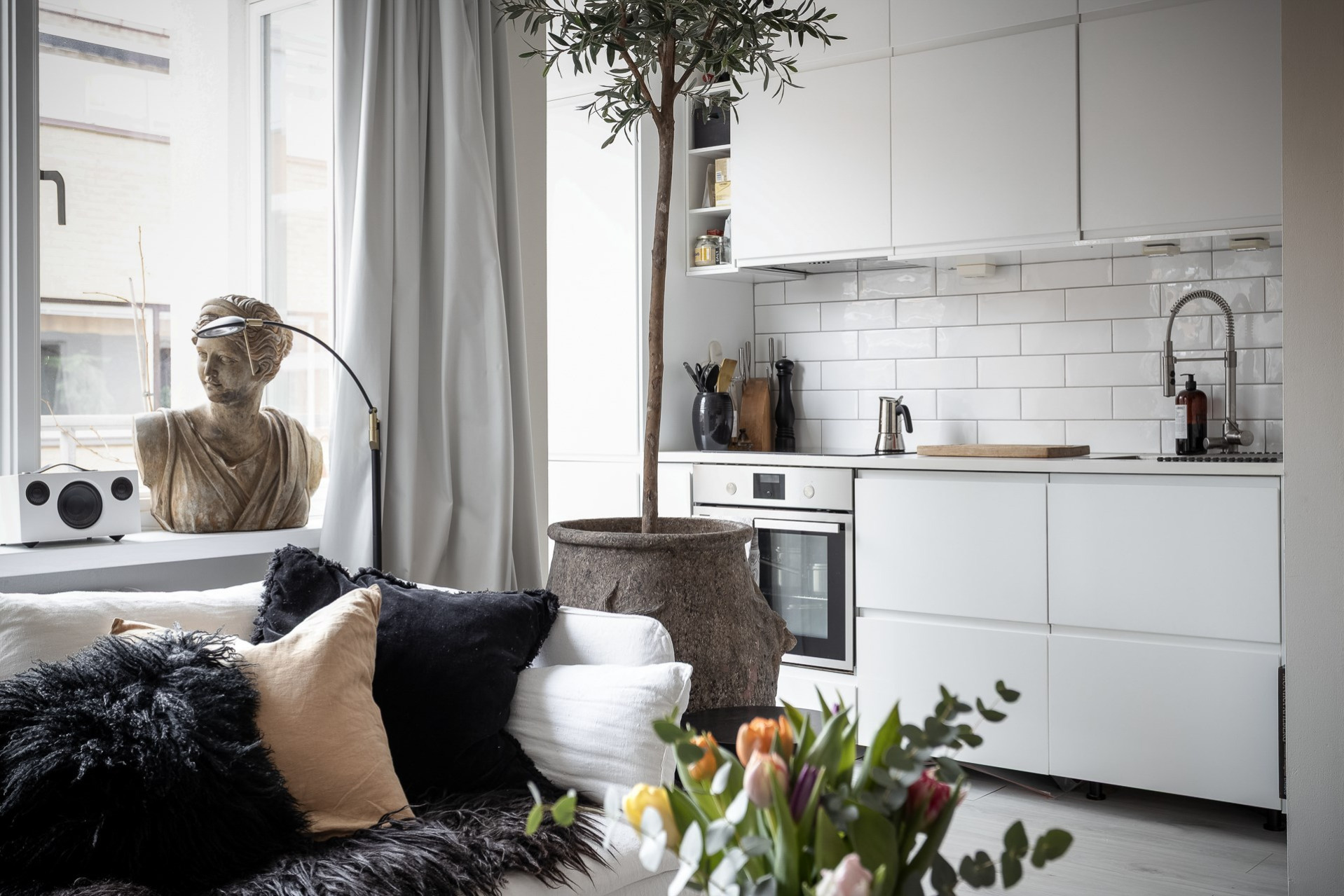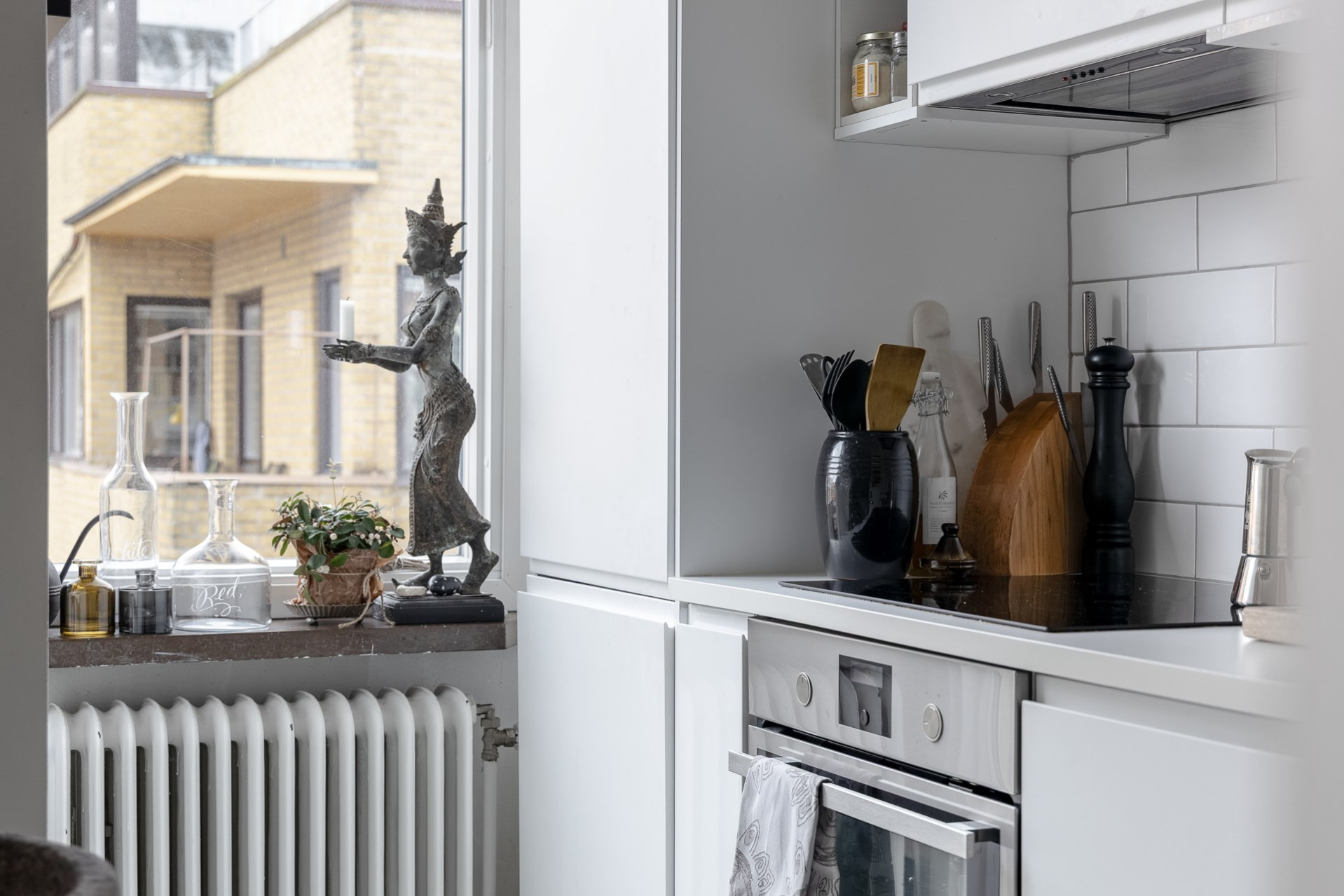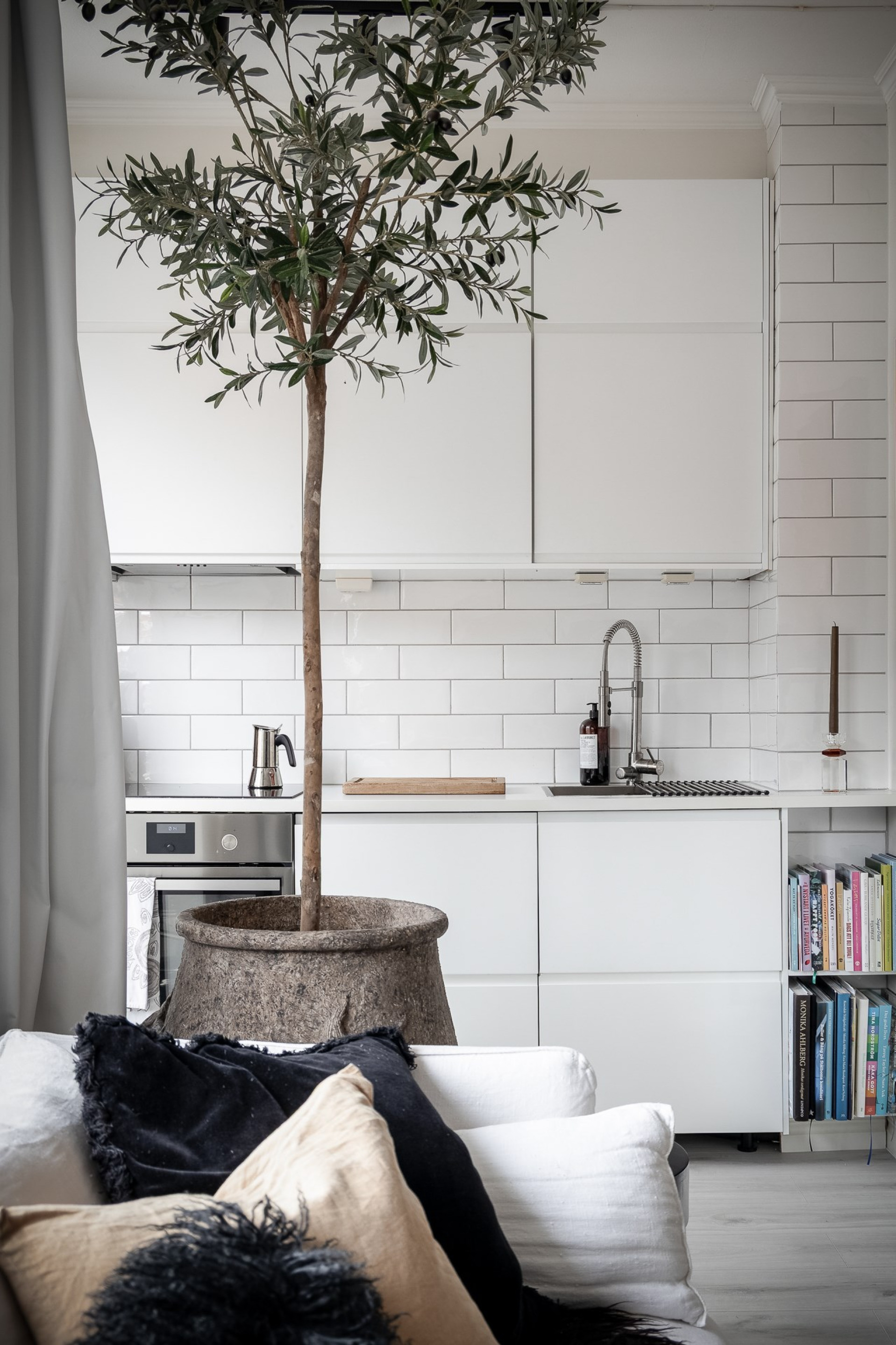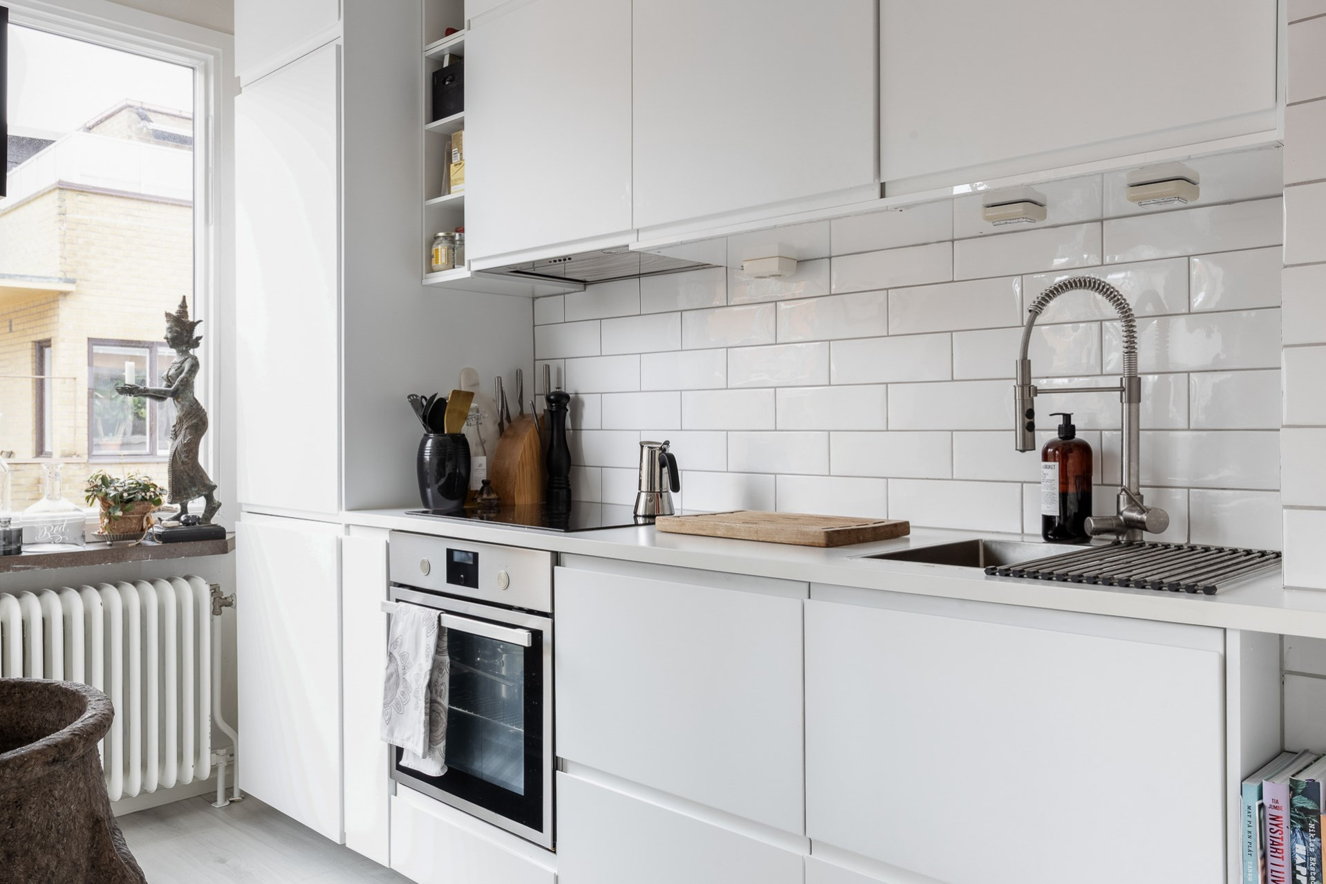 Köket är vitt och stilrent med köksinredning från IKEA, med gott om skåp och förvaring. Vitt kakel och vit bänkskiva. Maskinell utrustning bestående av inbyggds ugn, fläkt, induktionshäll, diskmaskin och kyl/fys.
