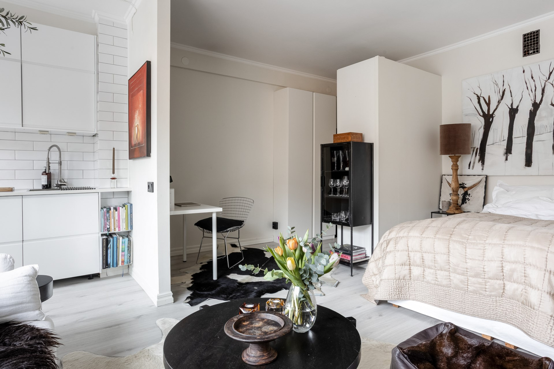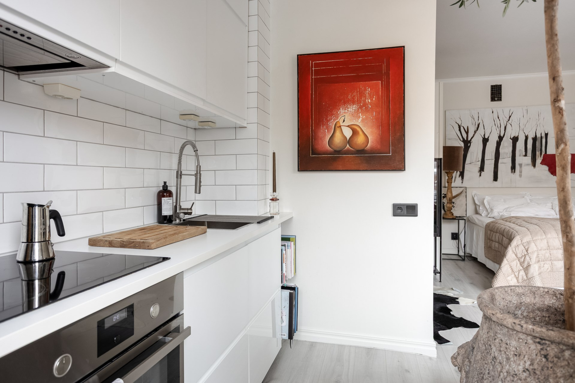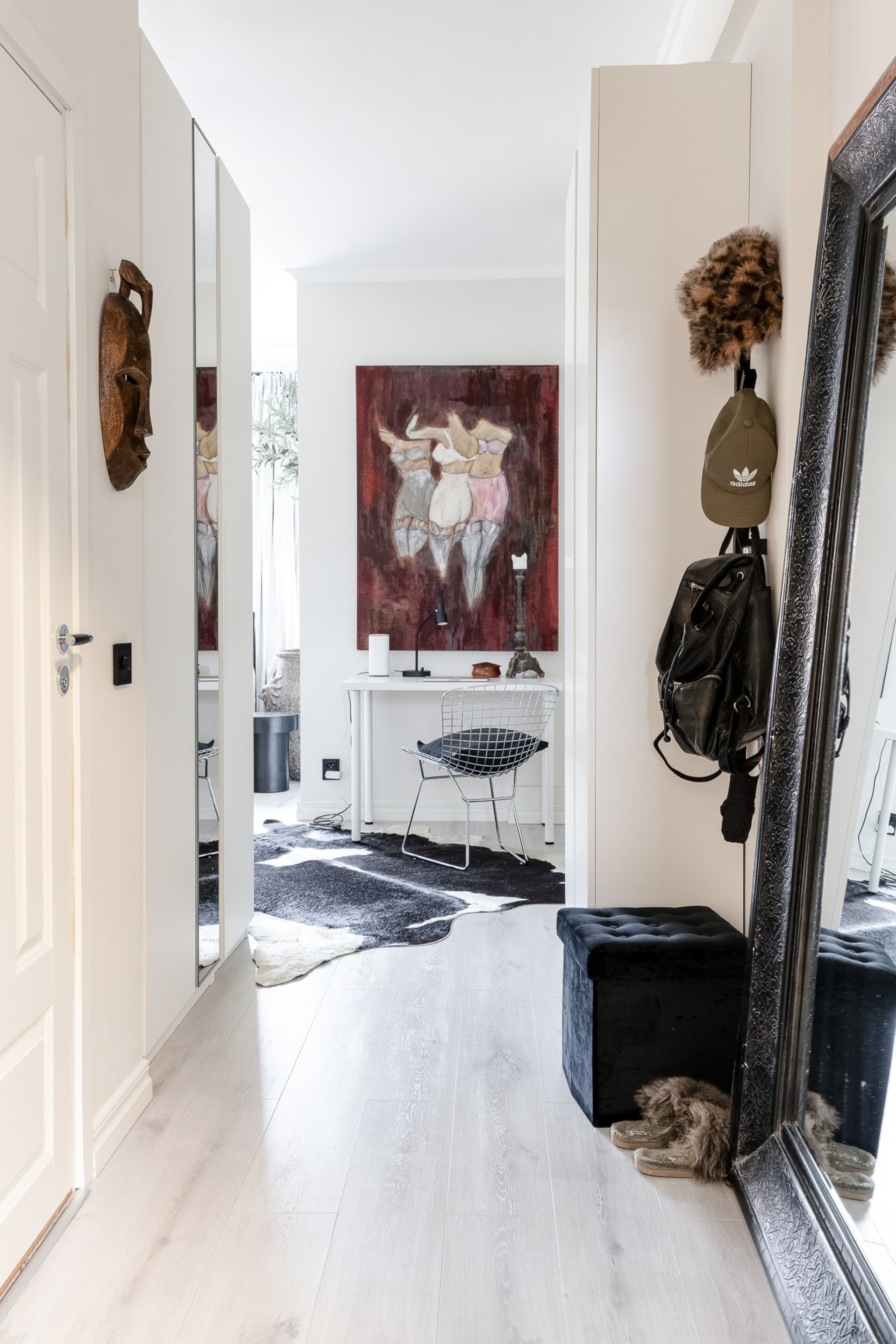 Inbjudande hall med plats för ytterkläder och längre in finner ni garderober som skärmar av rummet till en sovalkov. Det är genomgående ljusa golv och släta vitmålade väggar.