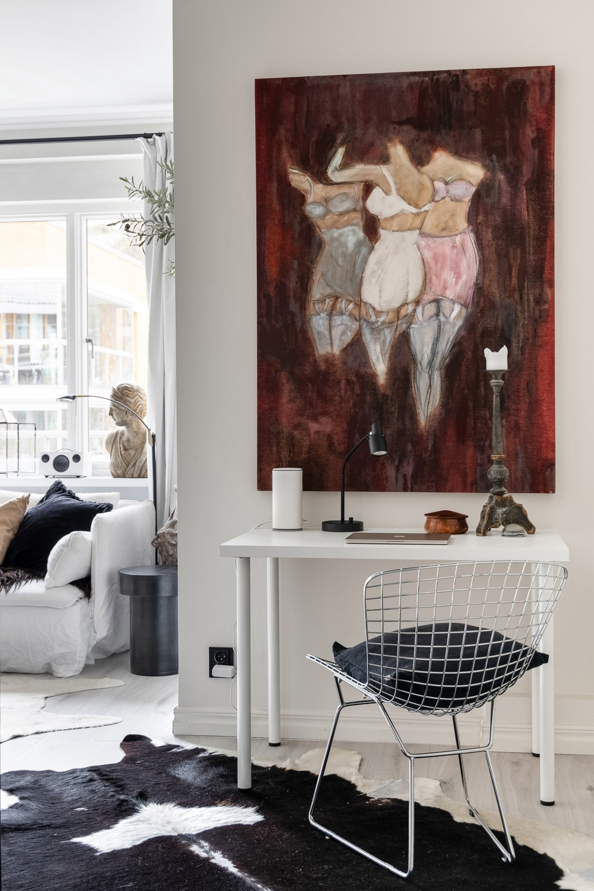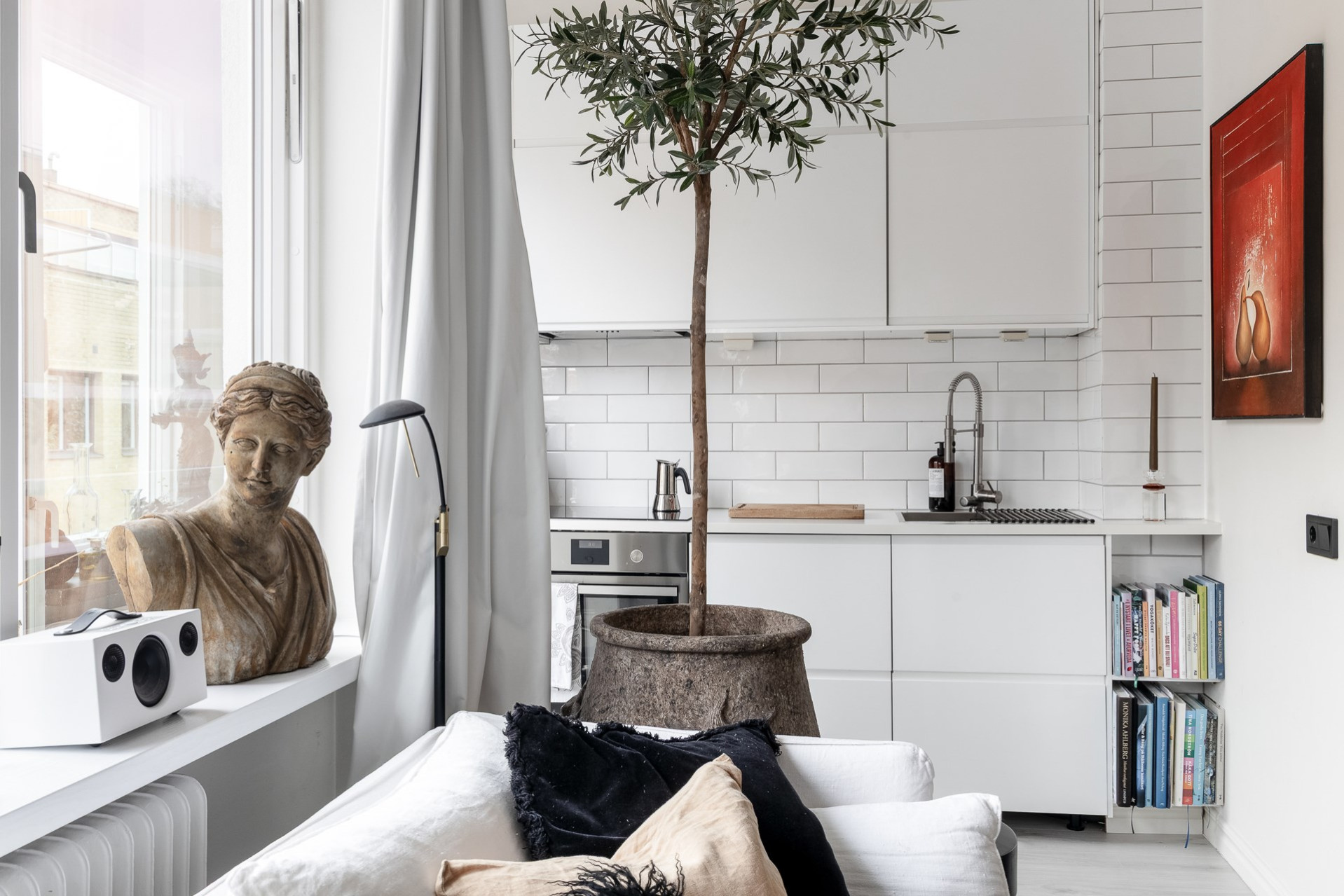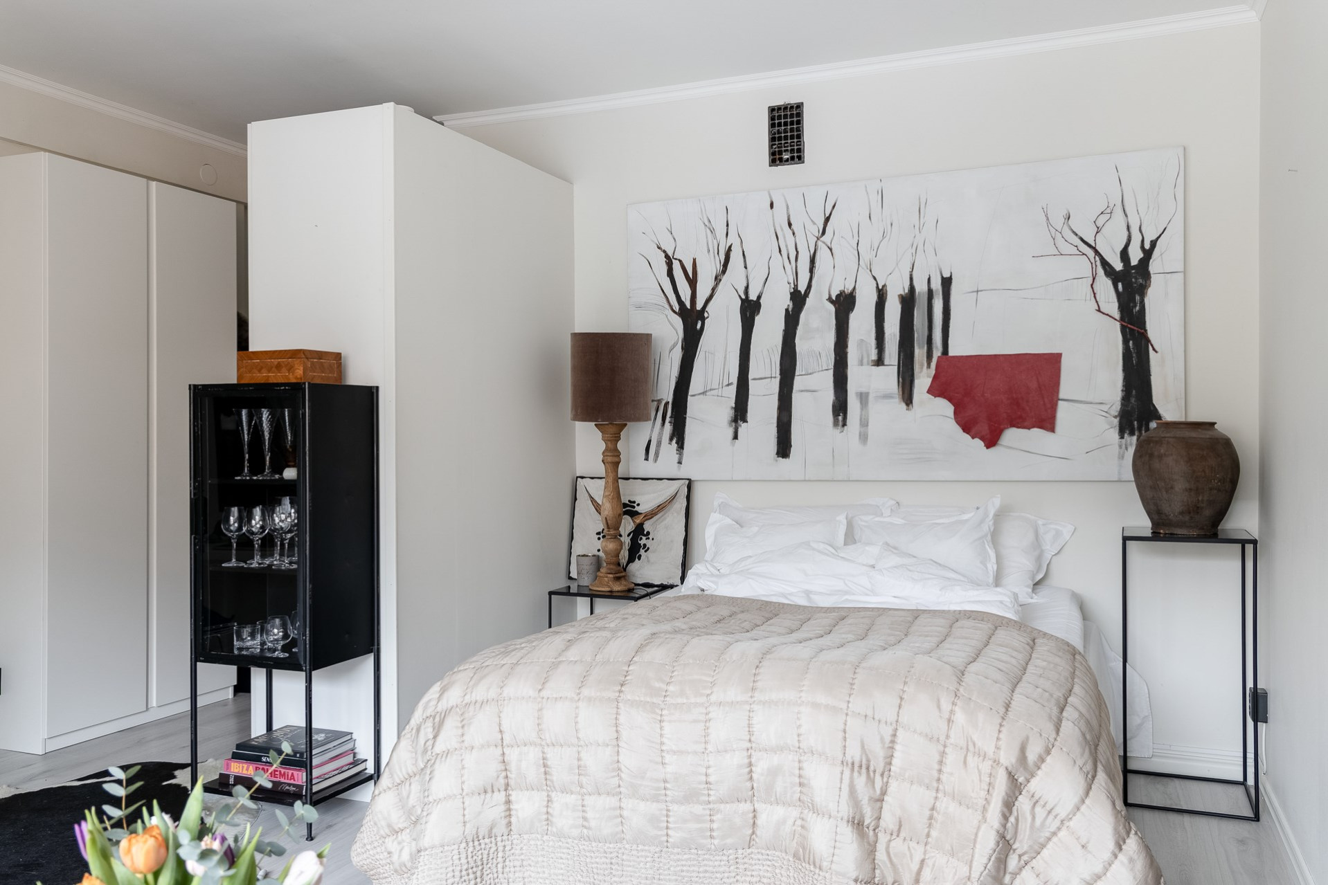 Inbjudande hall med plats för ytterkläder och längre in finner ni garderober som skärmar av rummet till en sovalkov. Det är genomgående ljusa golv och släta vitmålade väggar.