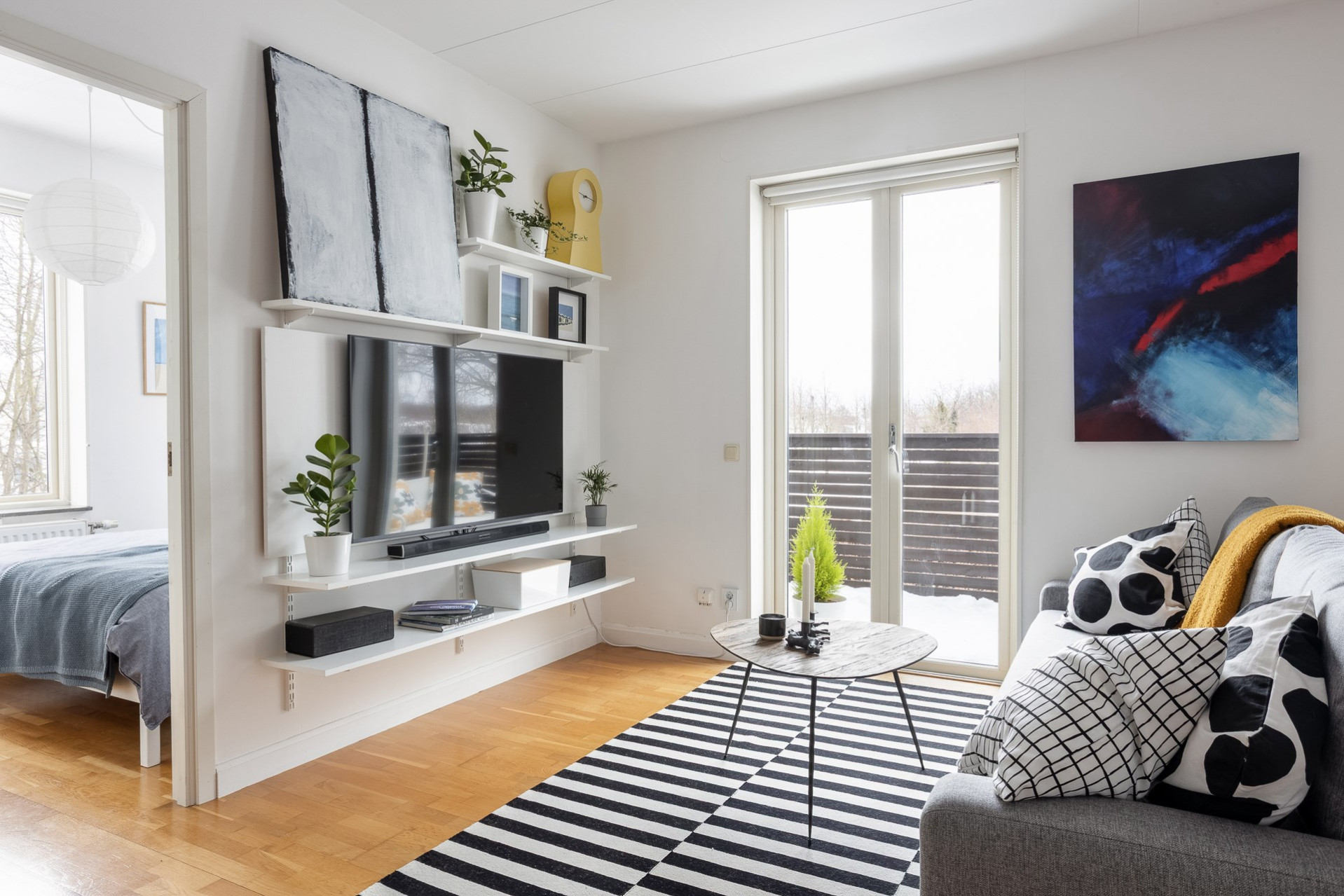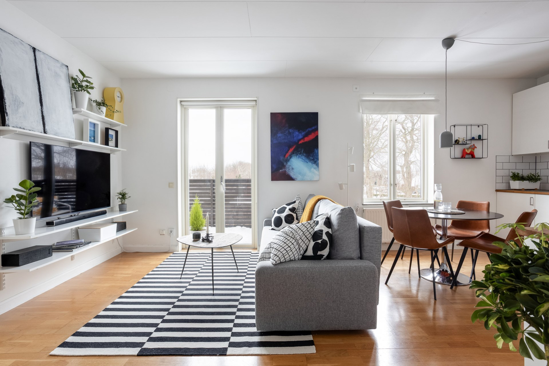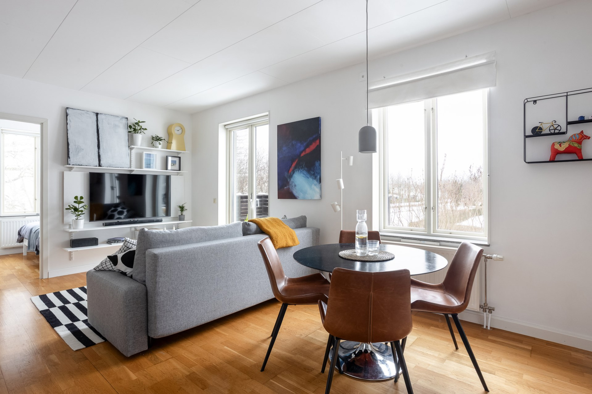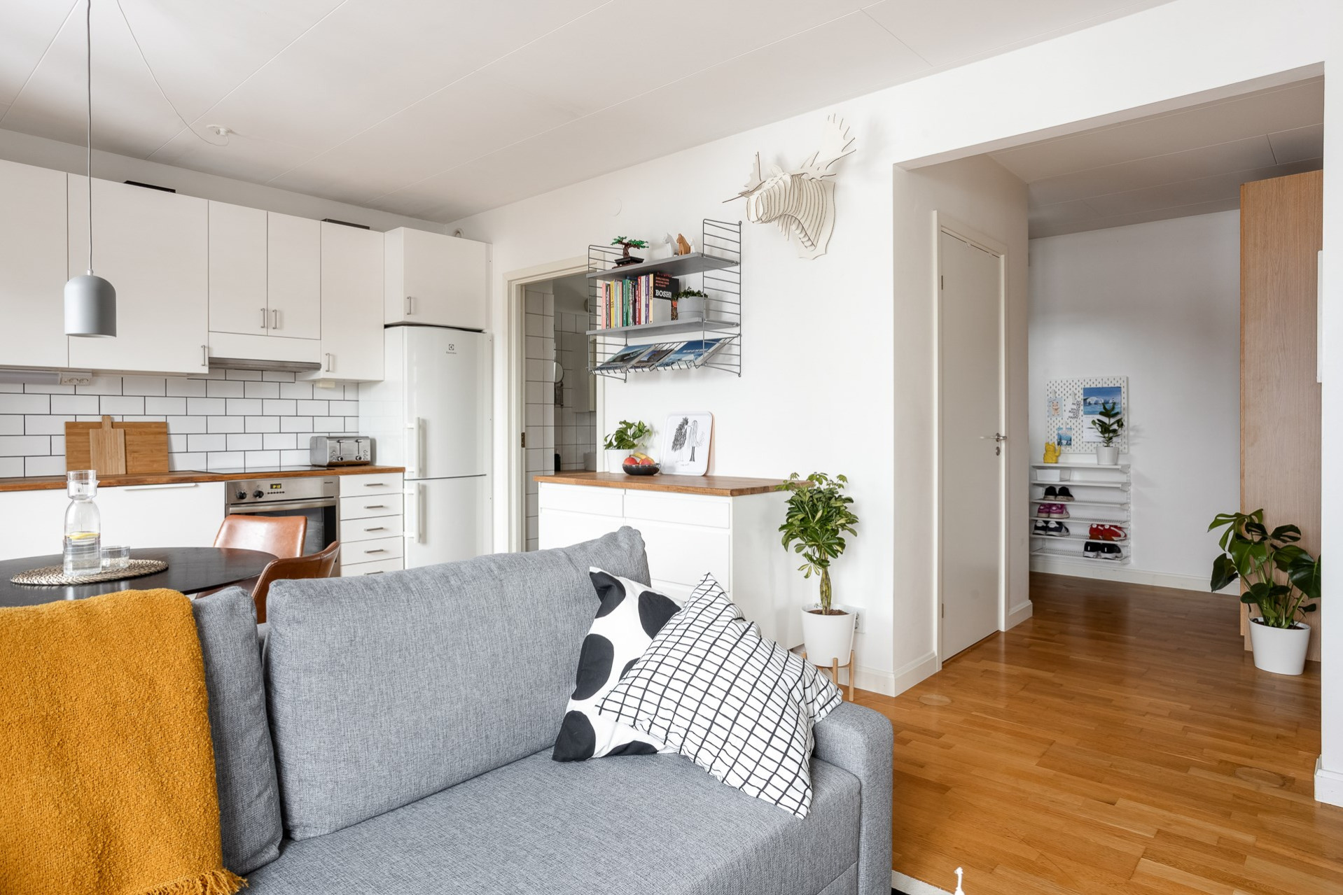 Vi parkerar bilen på p-platsen som dessutom har laddstolpe och sen tar vi oss upp för yttertrappan och in genom ytterdörren. Entrén är välkomnande med bra plats för ytterkläder och mer förvaring fås via en klädkammare. Från hallen når man badrummet som har rymlig duschplats, våtrumsmatta i svart/grå nyans finns på golvet och väggarna är beklädda med vitt kakel. I badrummet finns även handdukstork och fönster samt tvättavdelning med tvättmaskin, torkrumlare, arbetbänk och skåp. Från hallen och rakt fram öppnar vardagsrummet och köket upp sig till ett enda stort och härligt sällskapsrum. Här hittar man även utgången till lägenhetens balkong som vetter åt soligt söderläge. Från balkongen och resten av bostaden har man fri pch trivsam utsikt över näromgivningen. En plats att njuta av. Tack vare den öppna planlösningen får man plats med både soffgrupp och matsalsmöbler utan problem. På golvet vilar ekparkett. Köket går i vitt med maskinpark som består av kyl/frys, ugn, spishäll och diskmaskin. Det mysiga sovrummet som har fönster åt två håll har plats för dubbelsäng samt förvaring via garderober. Det andra sovrummet har byggts om till två mini-rum men kan återställas till sitt ursprungliga utseende.
