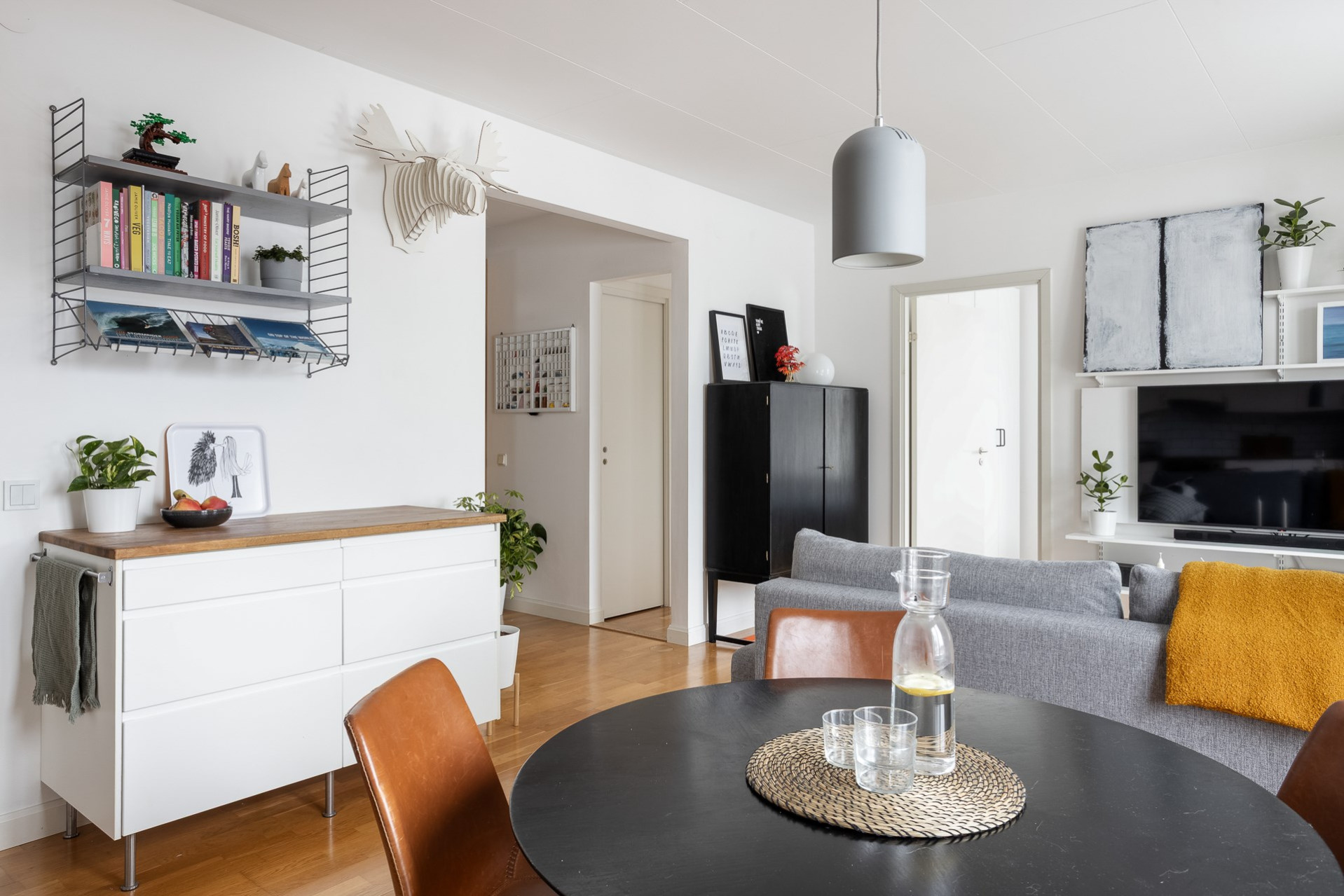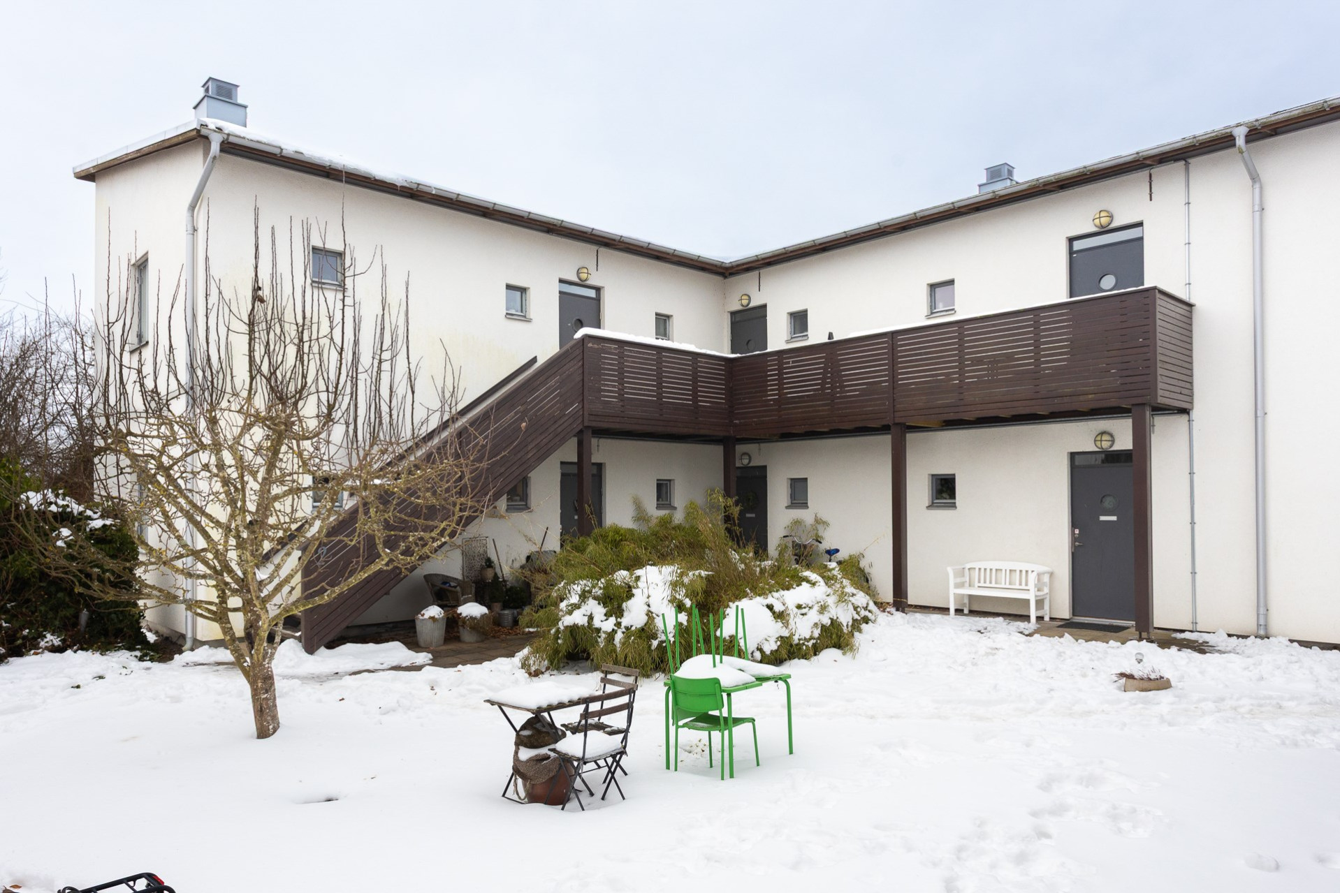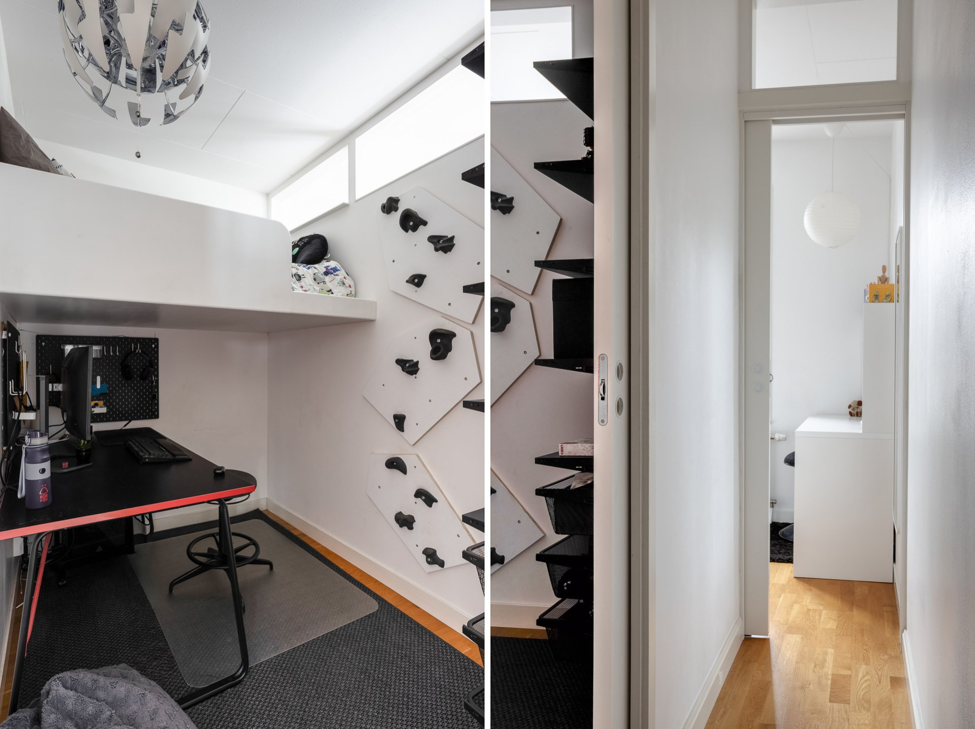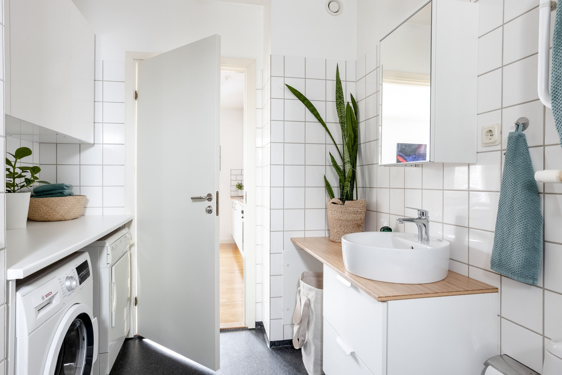 Vi parkerar bilen på p-platsen som dessutom har laddstolpe och sen tar vi oss upp för yttertrappan och in genom ytterdörren. Entrén är välkomnande med bra plats för ytterkläder och mer förvaring fås via en klädkammare. Från hallen når man badrummet som har rymlig duschplats, våtrumsmatta i svart/grå nyans finns på golvet och väggarna är beklädda med vitt kakel. I badrummet finns även handdukstork och fönster samt tvättavdelning med tvättmaskin, torkrumlare, arbetbänk och skåp. Från hallen och rakt fram öppnar vardagsrummet och köket upp sig till ett enda stort och härligt sällskapsrum. Här hittar man även utgången till lägenhetens balkong som vetter åt soligt söderläge. Från balkongen och resten av bostaden har man fri pch trivsam utsikt över näromgivningen. En plats att njuta av. Tack vare den öppna planlösningen får man plats med både soffgrupp och matsalsmöbler utan problem. På golvet vilar ekparkett. Köket går i vitt med maskinpark som består av kyl/frys, ugn, spishäll och diskmaskin. Det mysiga sovrummet som har fönster åt två håll har plats för dubbelsäng samt förvaring via garderober. Det andra sovrummet har byggts om till två mini-rum men kan återställas till sitt ursprungliga utseende.
