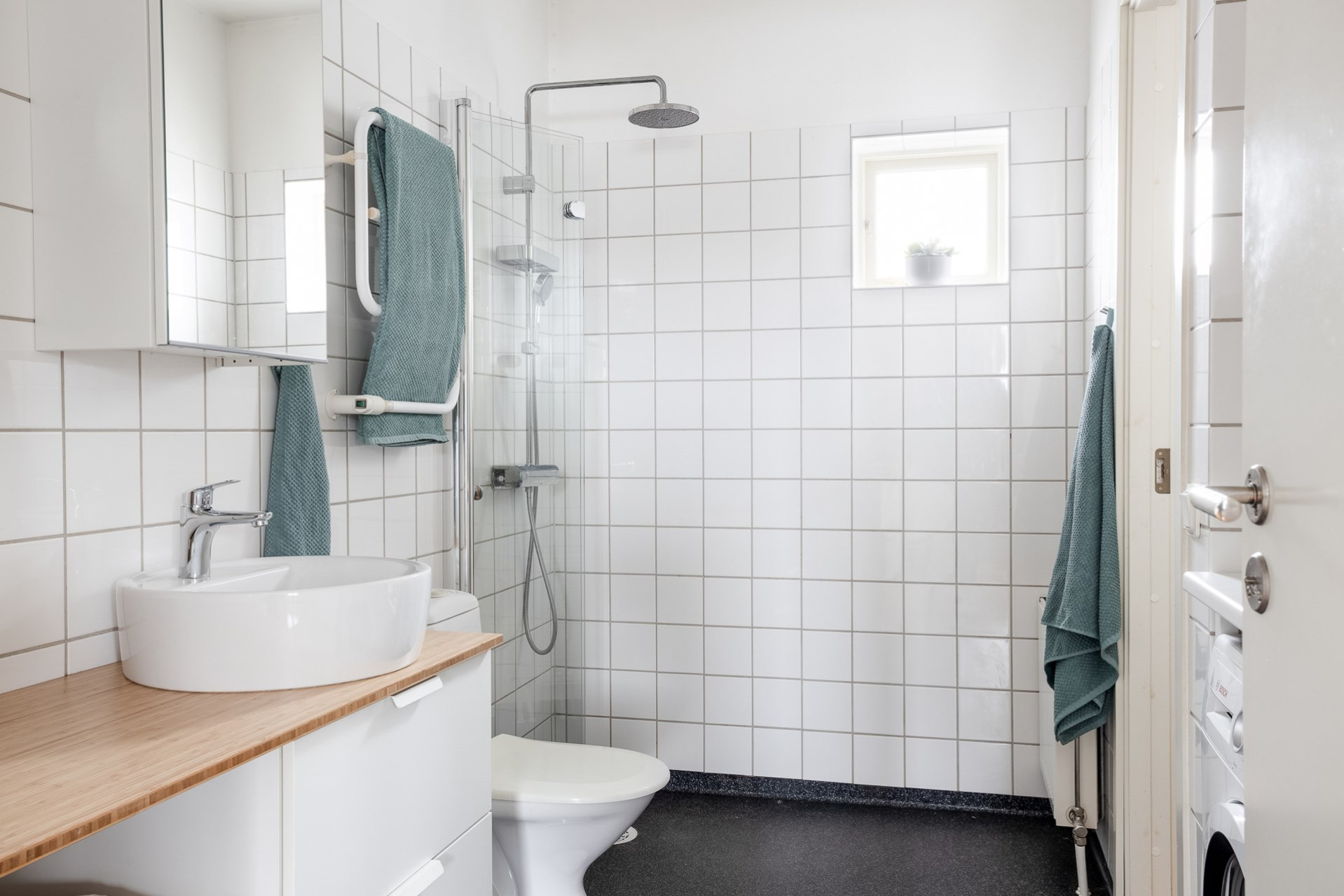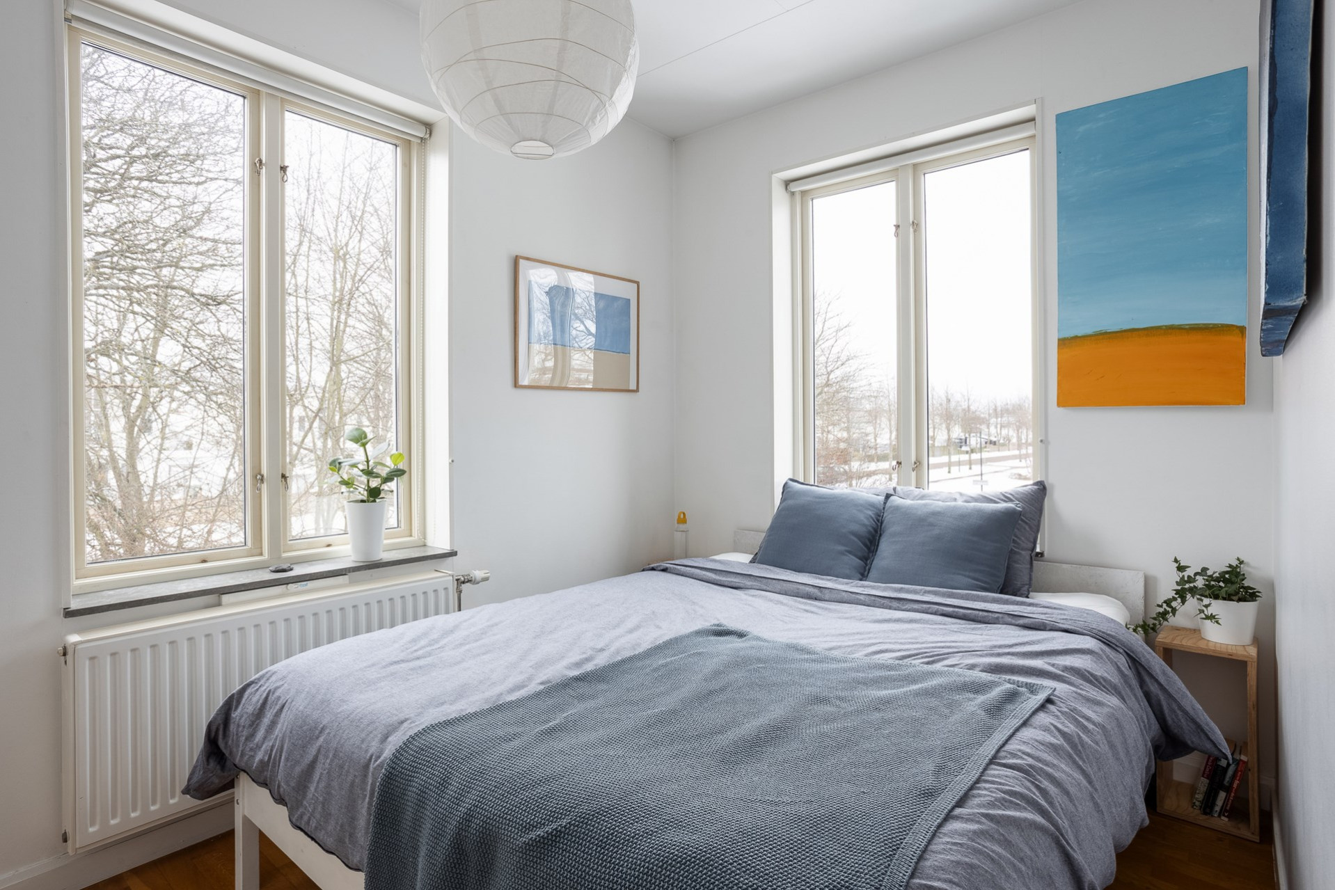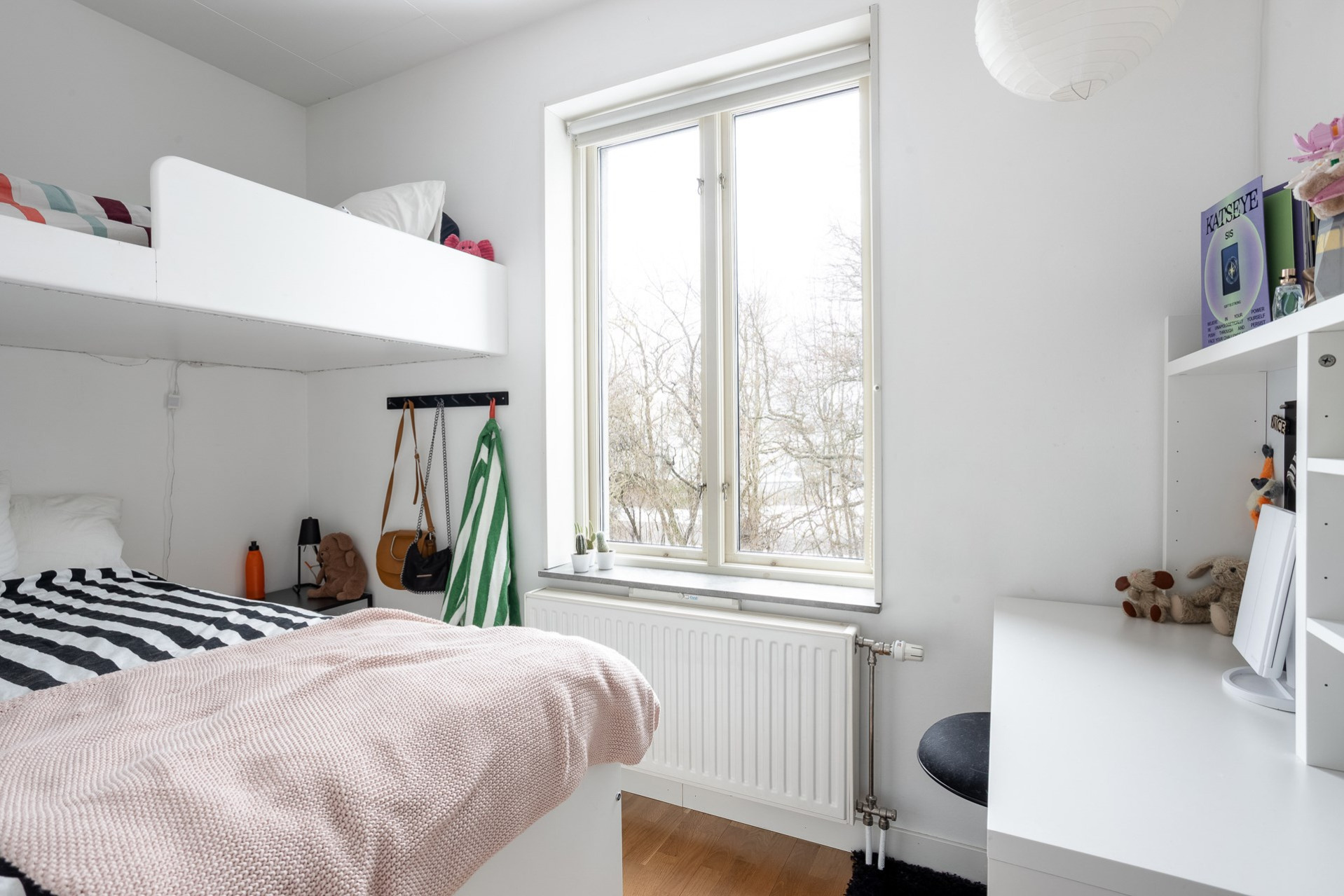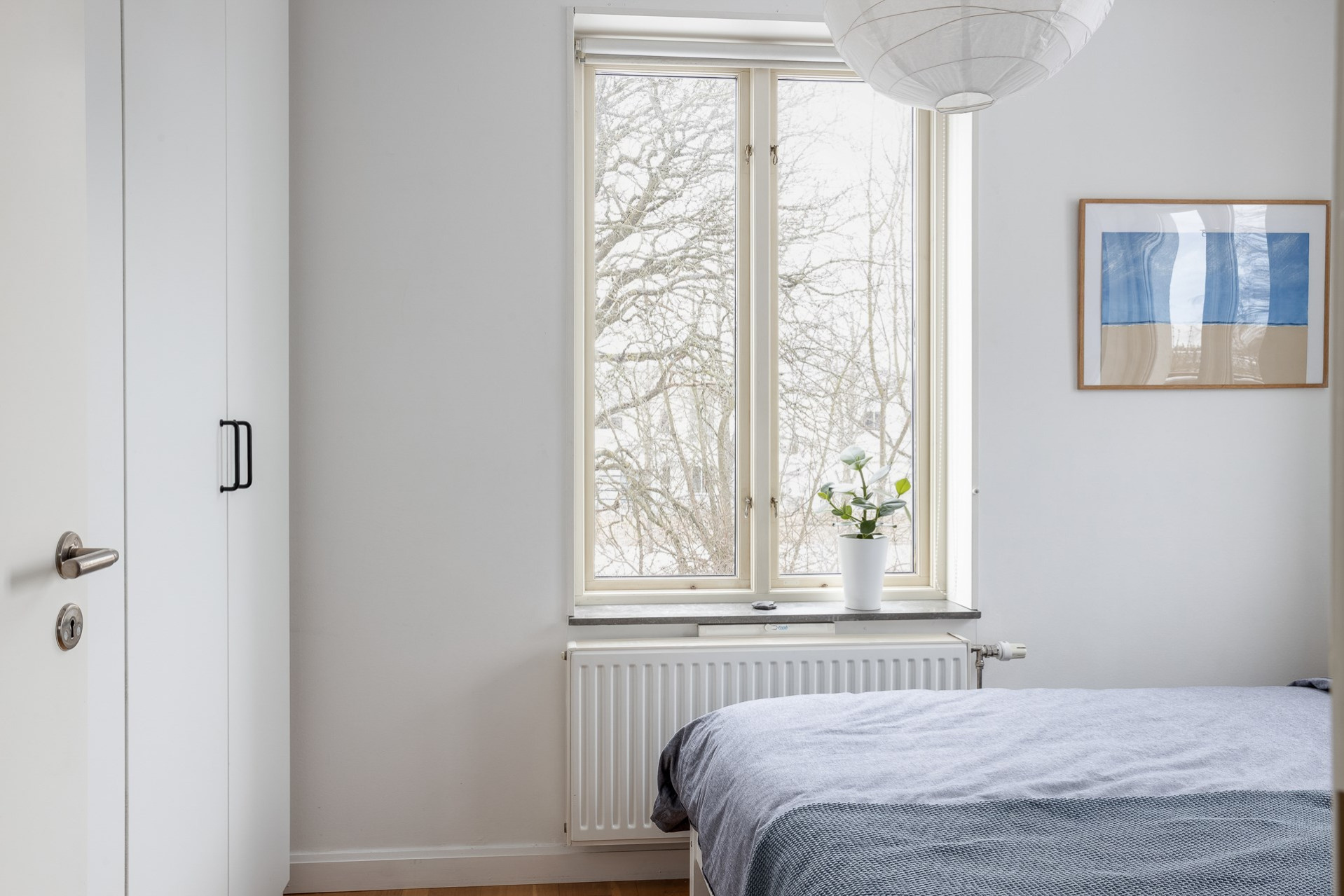 Vi parkerar bilen på p-platsen som dessutom har laddstolpe och sen tar vi oss upp för yttertrappan och in genom ytterdörren. Entrén är välkomnande med bra plats för ytterkläder och mer förvaring fås via en klädkammare. Från hallen når man badrummet som har rymlig duschplats, våtrumsmatta i svart/grå nyans finns på golvet och väggarna är beklädda med vitt kakel. I badrummet finns även handdukstork och fönster samt tvättavdelning med tvättmaskin, torkrumlare, arbetbänk och skåp. Från hallen och rakt fram öppnar vardagsrummet och köket upp sig till ett enda stort och härligt sällskapsrum. Här hittar man även utgången till lägenhetens balkong som vetter åt soligt söderläge. Från balkongen och resten av bostaden har man fri pch trivsam utsikt över näromgivningen. En plats att njuta av. Tack vare den öppna planlösningen får man plats med både soffgrupp och matsalsmöbler utan problem. På golvet vilar ekparkett. Köket går i vitt med maskinpark som består av kyl/frys, ugn, spishäll och diskmaskin. Det mysiga sovrummet som har fönster åt två håll har plats för dubbelsäng samt förvaring via garderober. Det andra sovrummet har byggts om till två mini-rum men kan återställas till sitt ursprungliga utseende.