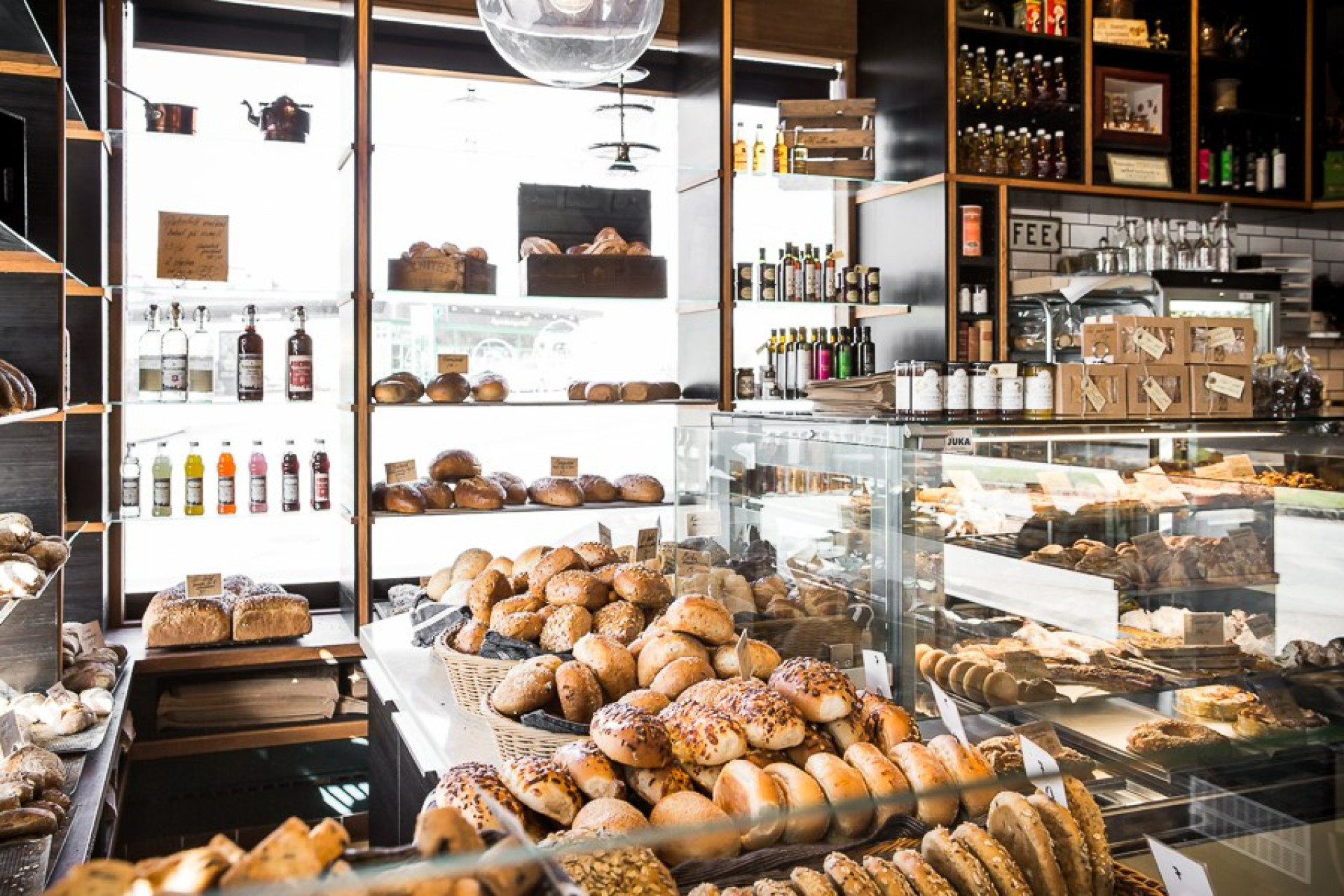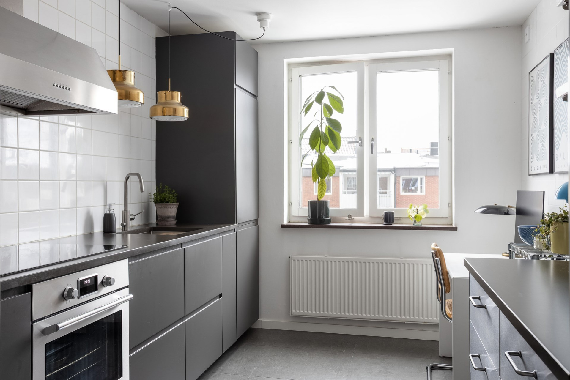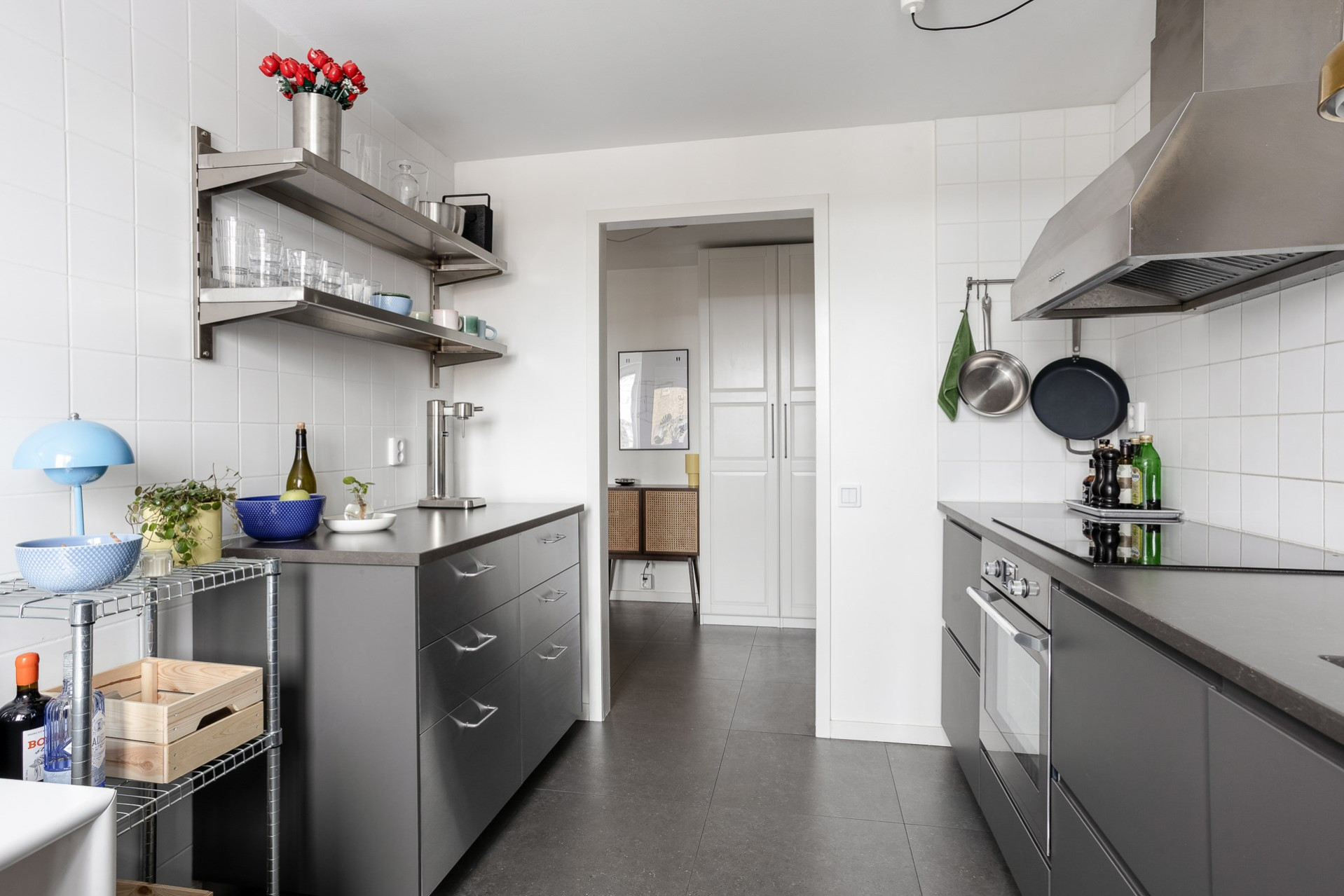Direkt till vänster ligger det nyligen installerade köket i en modern grå ton. Här erbjuds generöst med förvaring och en tydlig restaurangkänsla tack vare helkaklade väggar som ger både karaktär och lättskött yta.
