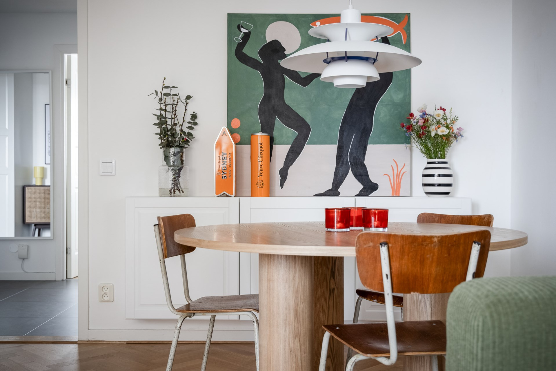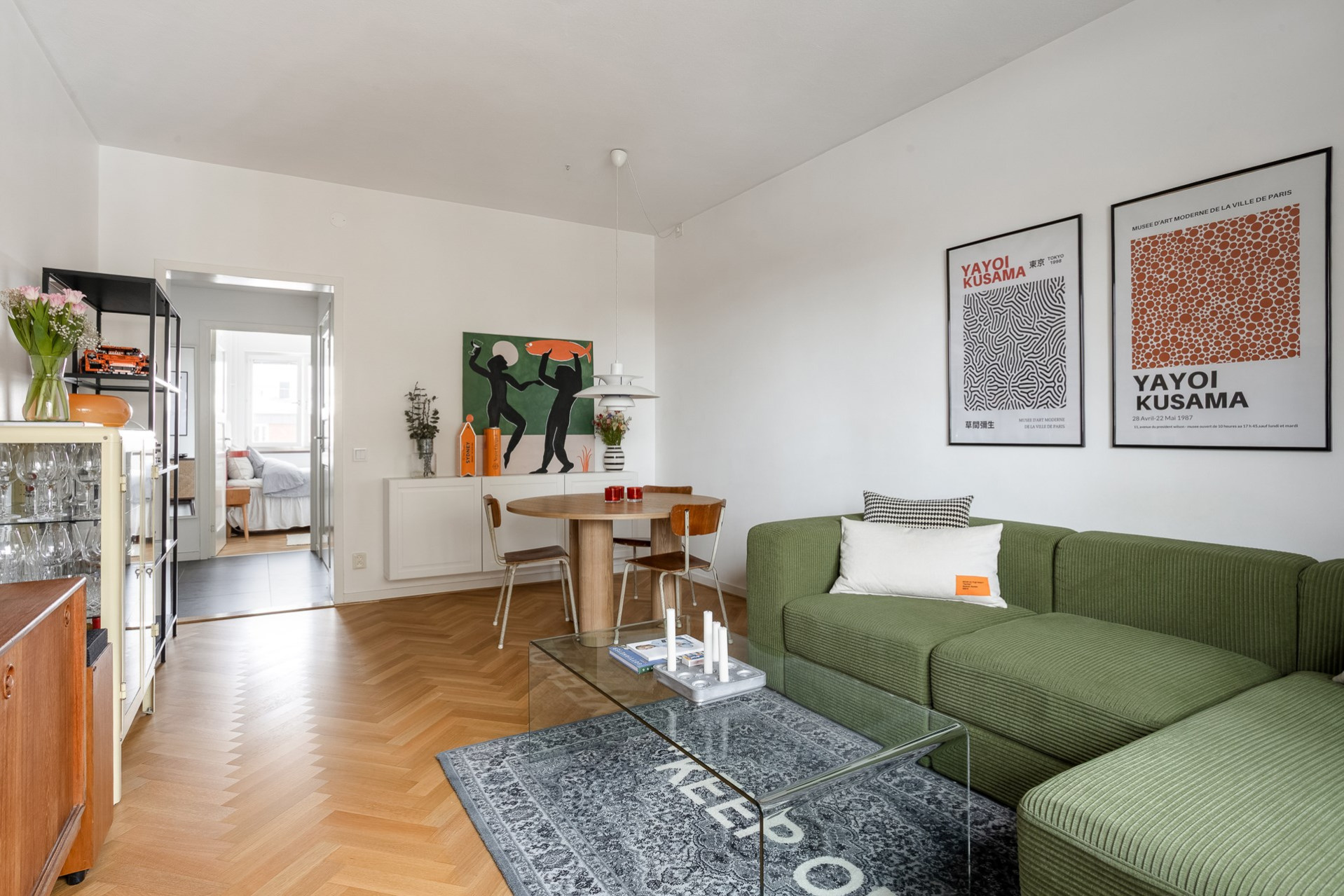 På andra sidan hallen öppnar bostaden upp sig mot det ljusa och luftiga vardagsrummet. Med sitt exklusiva golv, ljusa väggar och stora fönsterpartier tillsammans med altandörr badar rummet i naturligt ljus. Här finns gott om plats för både soffgrupp och matsalsmöblemang. Från vardagsrummet når du balkongen i nordvästläge – perfekt för att njuta av soliga eftermiddagar och kvällar.
