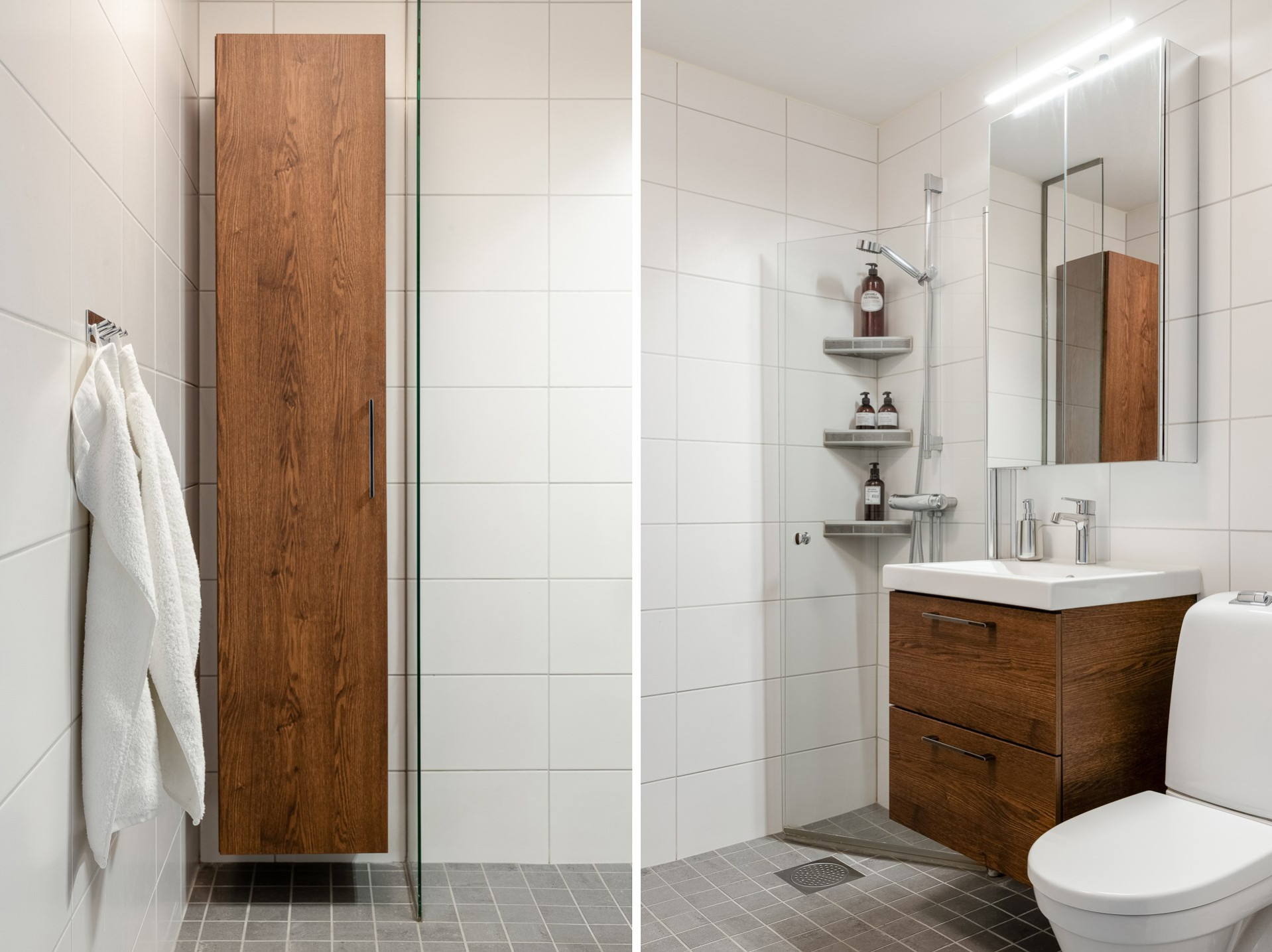 Vidare in i hallen nås det smakfulla och helkaklade badrummet med grå klinker på golvet och vitt kakel på väggarna. Badrummet är utrustat med dusch med glasvägg, handfat med kommod, spegelskåp, högskåp samt WC – allt i ett stilrent och funktionellt utförande.
