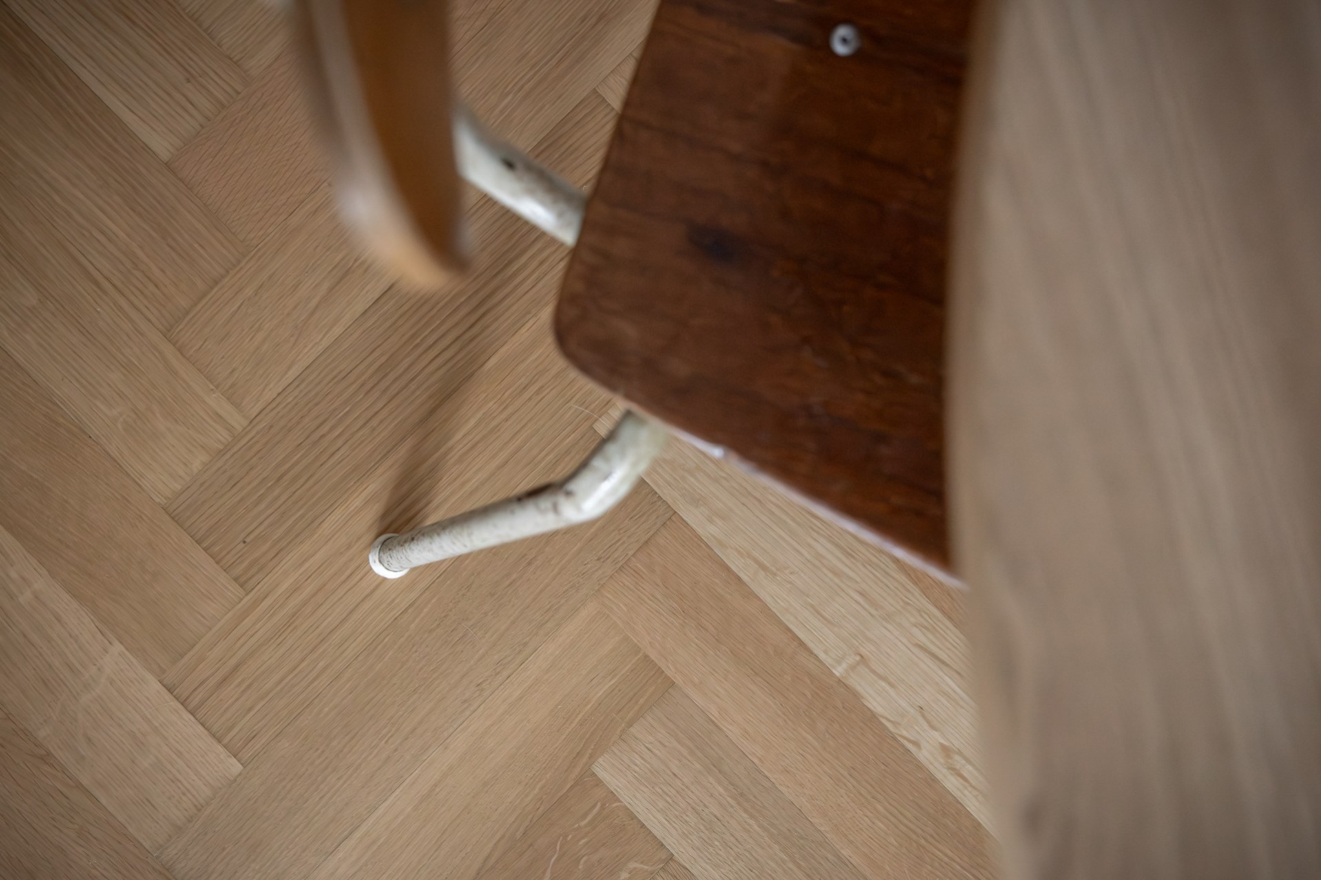 Fiskbensparkett Ek: Bjelin, Ligger i både vardagsrum och sovrum.