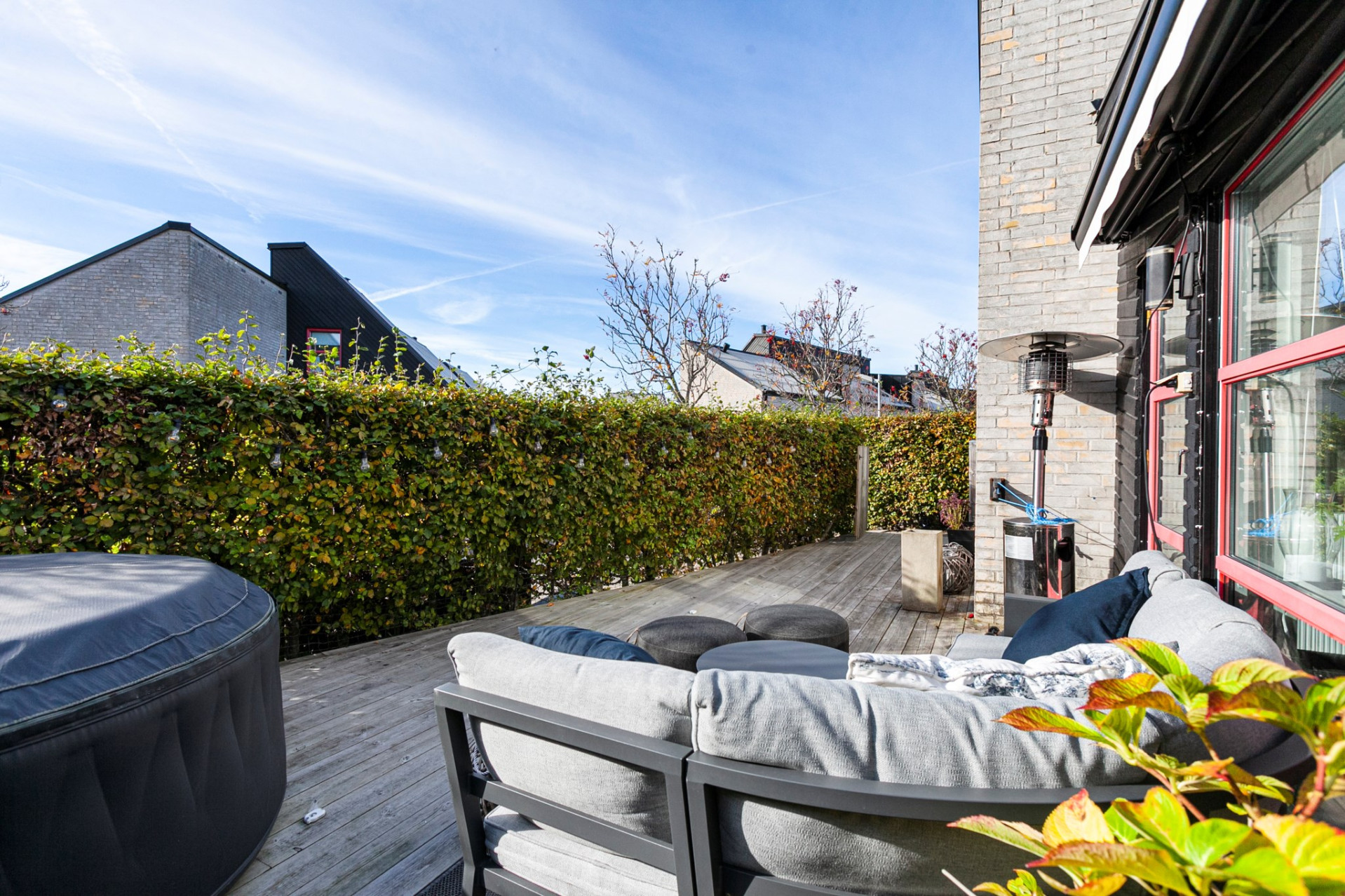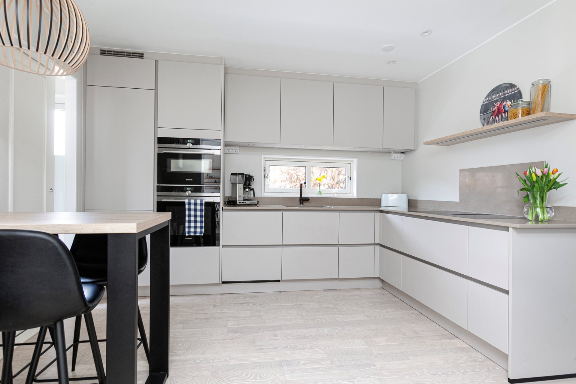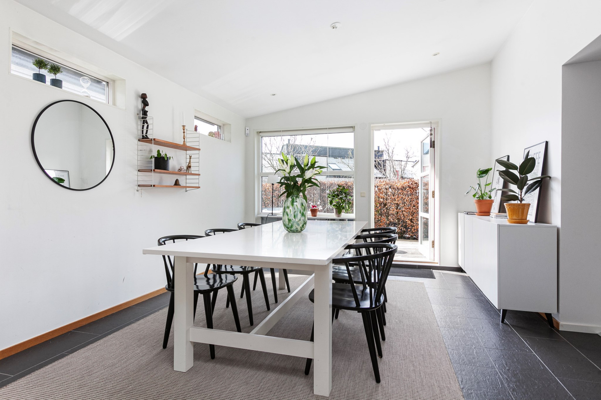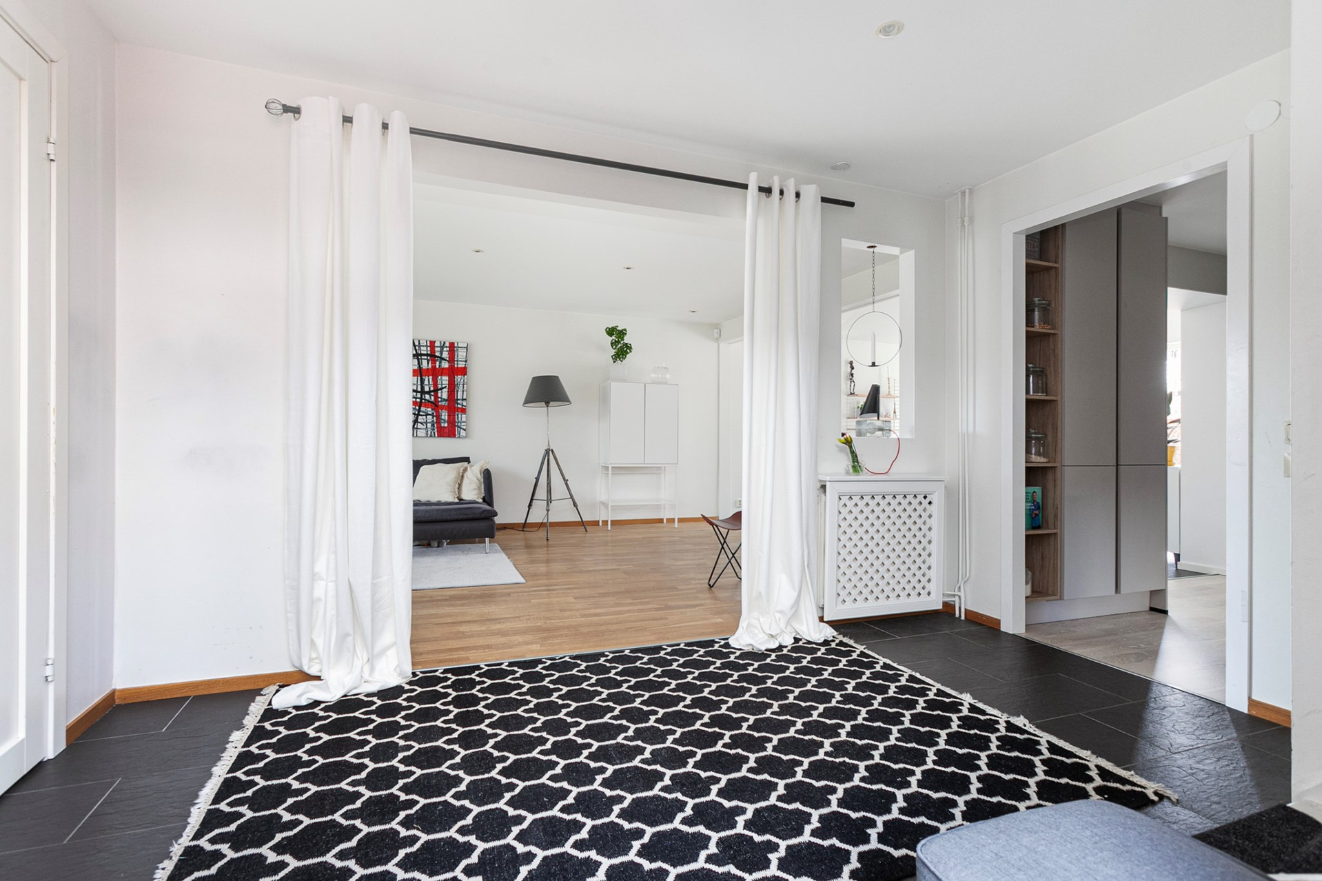 Ljust och inbjudande vardagsrum med oljat parkettgolv och öppen planlösning mot matrummet, vilket skapar härliga sällskapsytor. För den som önskar finns möjlighet att enkelt dela av matrummet och skapa ett fjärde sovrum. Matrum med elegant granitskiffergolv, behaglig elektrisk golvvärme och infällda spotlights som ger ett stämningsfullt ljus. Härifrån nås bostadens trädäck – en naturlig förlängning av hemmet under årets varmare månader. Smakfullt kök med oljad ekparkett och vita skåpluckor i modern stil. Köket renoverades 2022 med ny skåpsinredning och samtliga vitvaror utbytta samma år. Den maskinella utrustningen i rostfritt utförande består av fullhöjd kyl och frys, spis med glaskeramikhäll, fläkt samt diskmaskin – ett välutrustat och funktionellt kök för både vardag och fest. Tvättstuga med groventré och slitstarkt granitskiffergolv – praktiskt för barnfamiljen eller den trädgårdsintresserade. Här finns tvättmaskin, torktumlare (2017) och utslagsvask. I utrymmet finns även fjärrvärmeväxlare och ventilationsanläggning.
