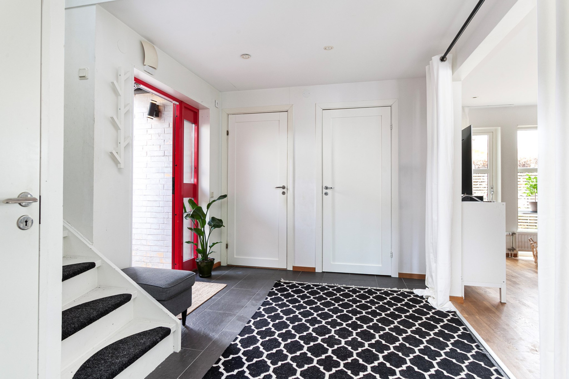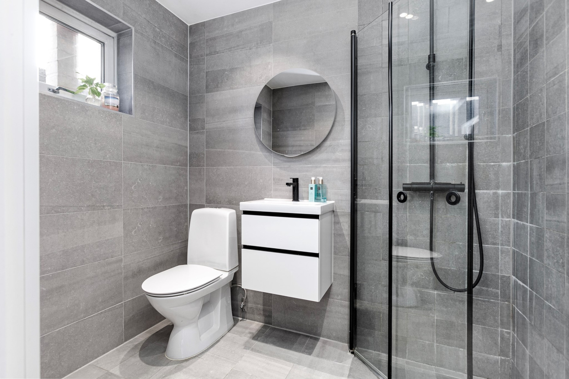 Välkomnande hall med stilrent granitskiffergolv som direkt sätter tonen för bostadens genomgående fina standard. Härifrån nås trappan till övre plan. Helkaklad WC/dusch med klinkergolv och fönster för naturligt ljusinsläpp. Smakfullt renoverat 2021 och utrustad med wc, handfat och dusch – ett fräscht och modernt badrum i tidlös design. Praktisk klädkammare/förråd erbjuder goda förvaringsmöjligheter.