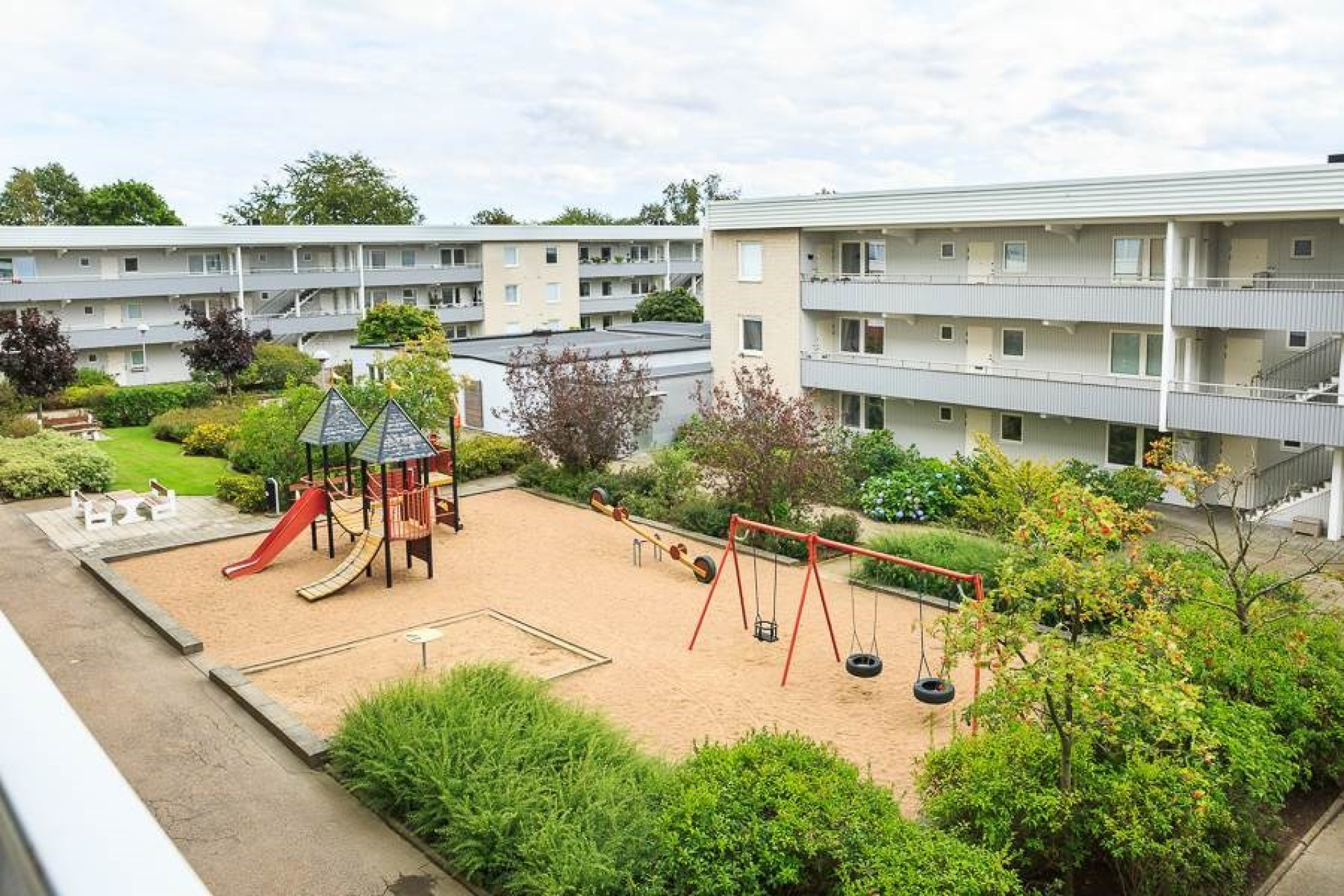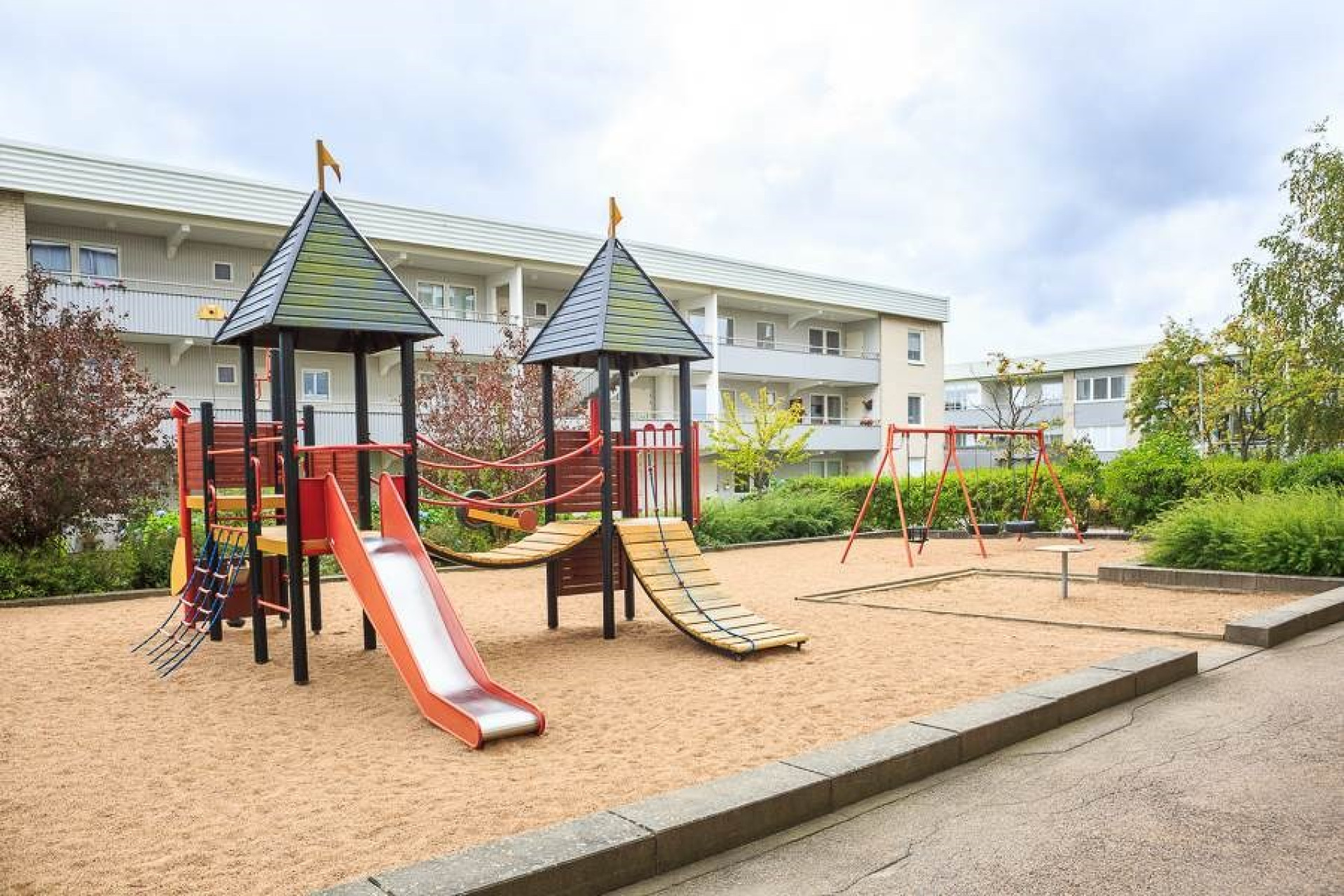 Gemensam grillplats, boulebana, flera lekplatser och ett utegym. Fina gröna ytor runtomkring.