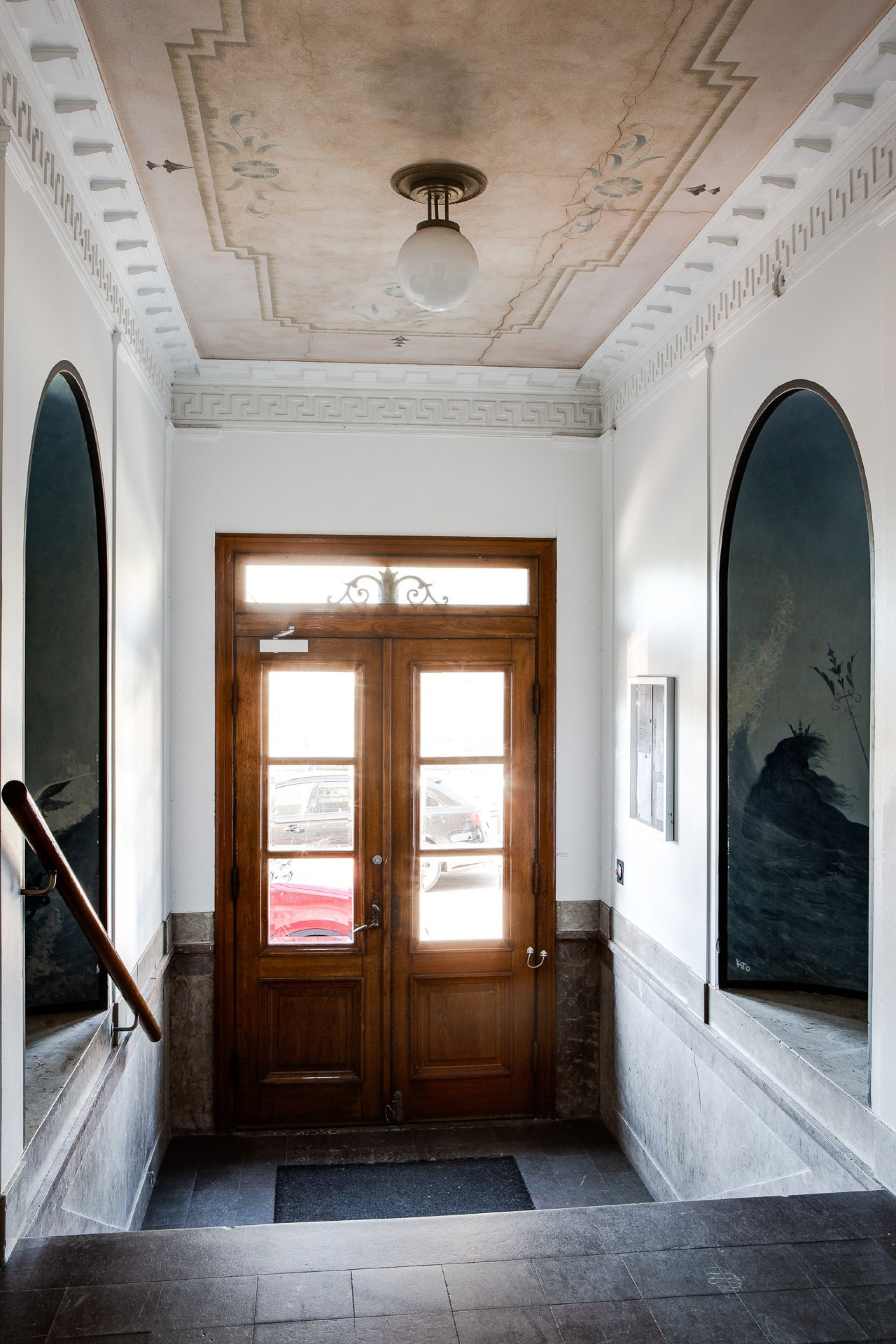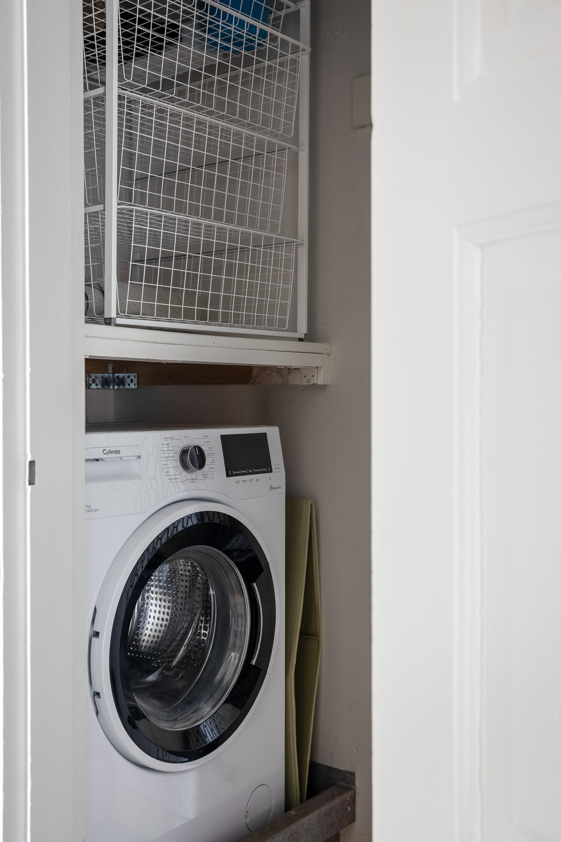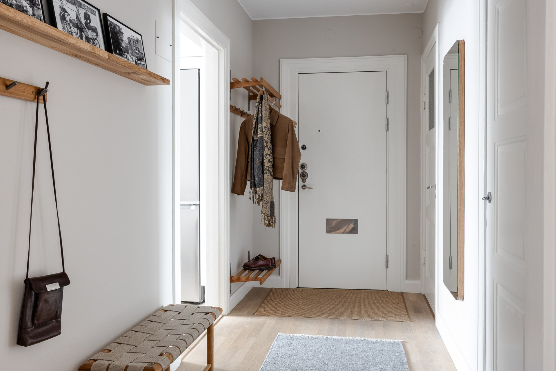 Plats för avhängning, ekparkett och spotlights i taket. Förråd med installerad tvättmaskin.