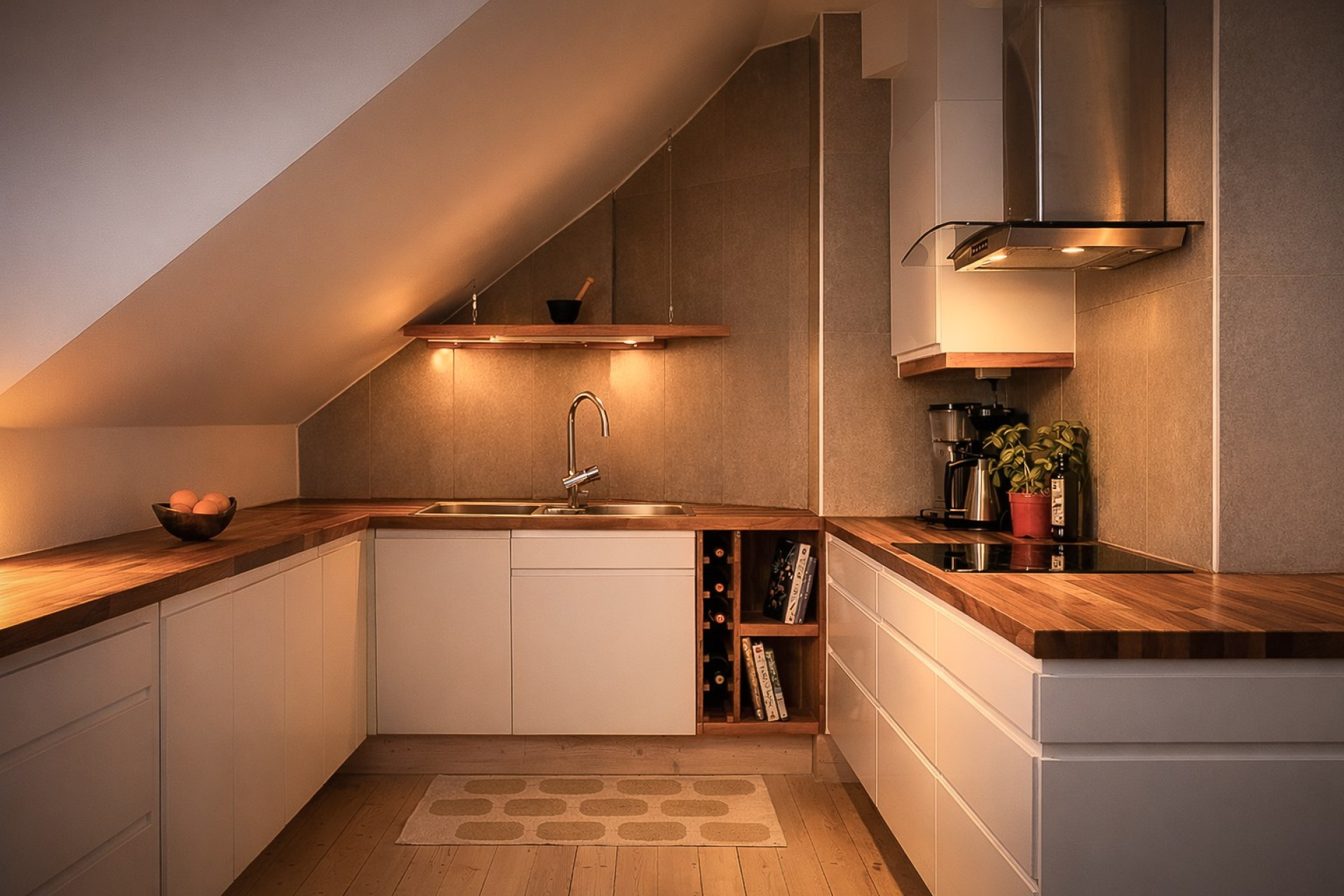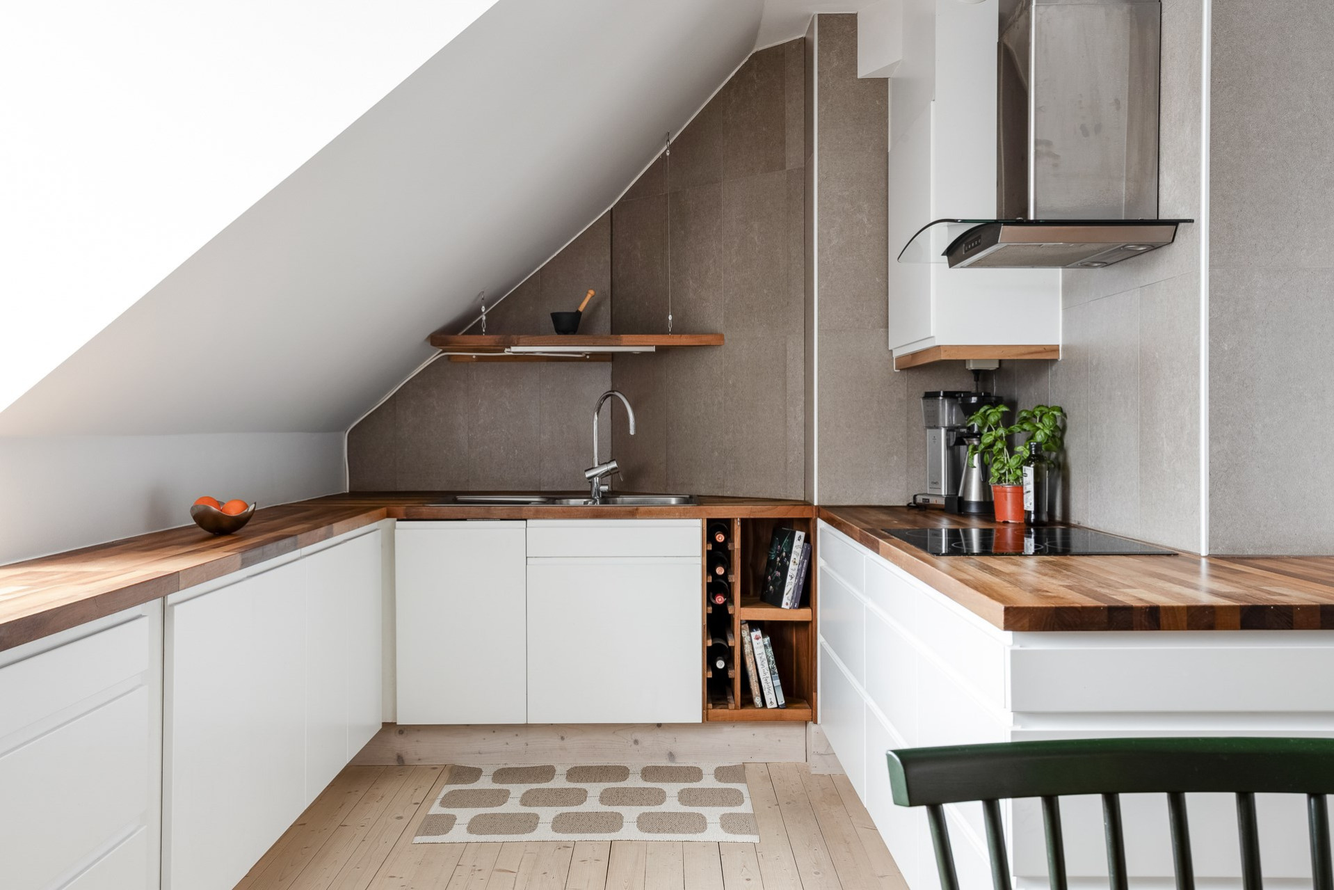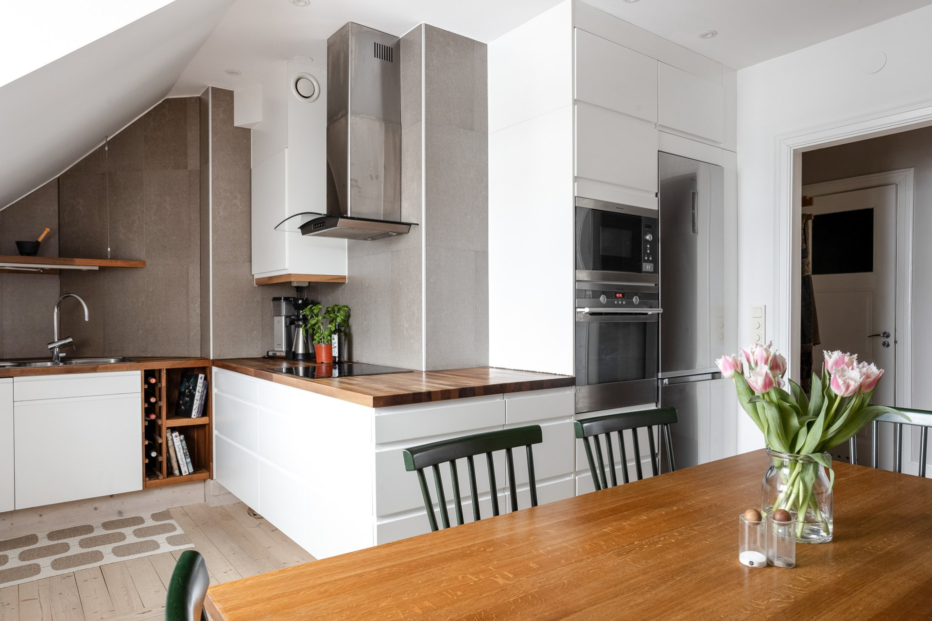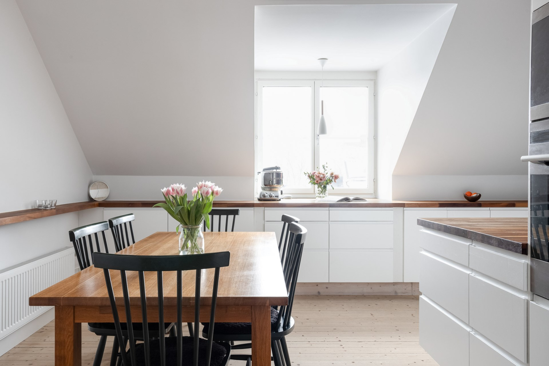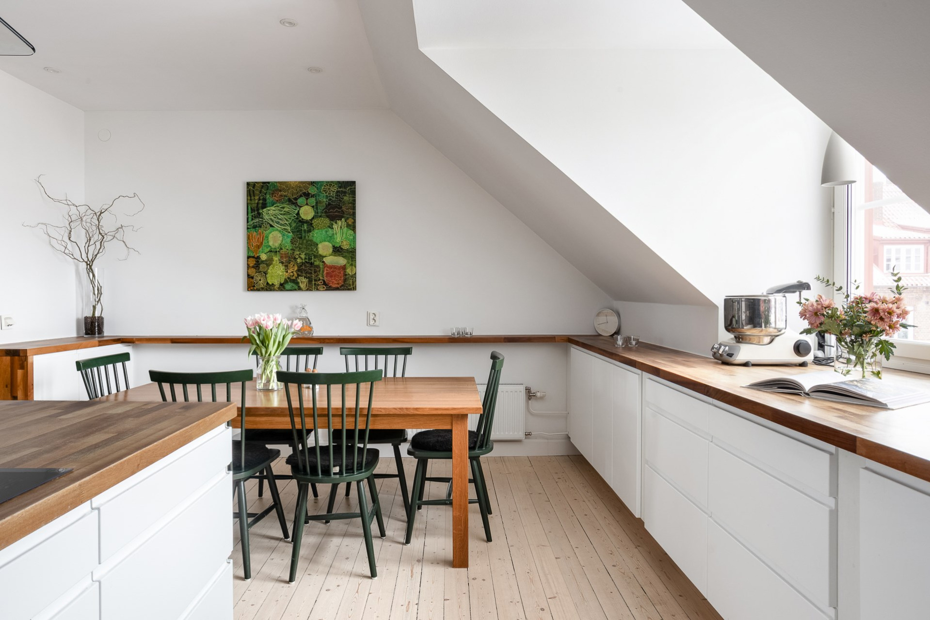 Mycket rymligt kök med stor matplats för 8-10 personer. Vita skåpsluckor med integrerade handtag, generöst med förvaring och enorma arbetsytor på träbänkskivan som vandrar runt hela rummet. Varmluftsugn, micro, integrerad kyl/frys, diskmaskin, induktionshäll och fläkt. Spotlights i taket och läckert brädgolv.
