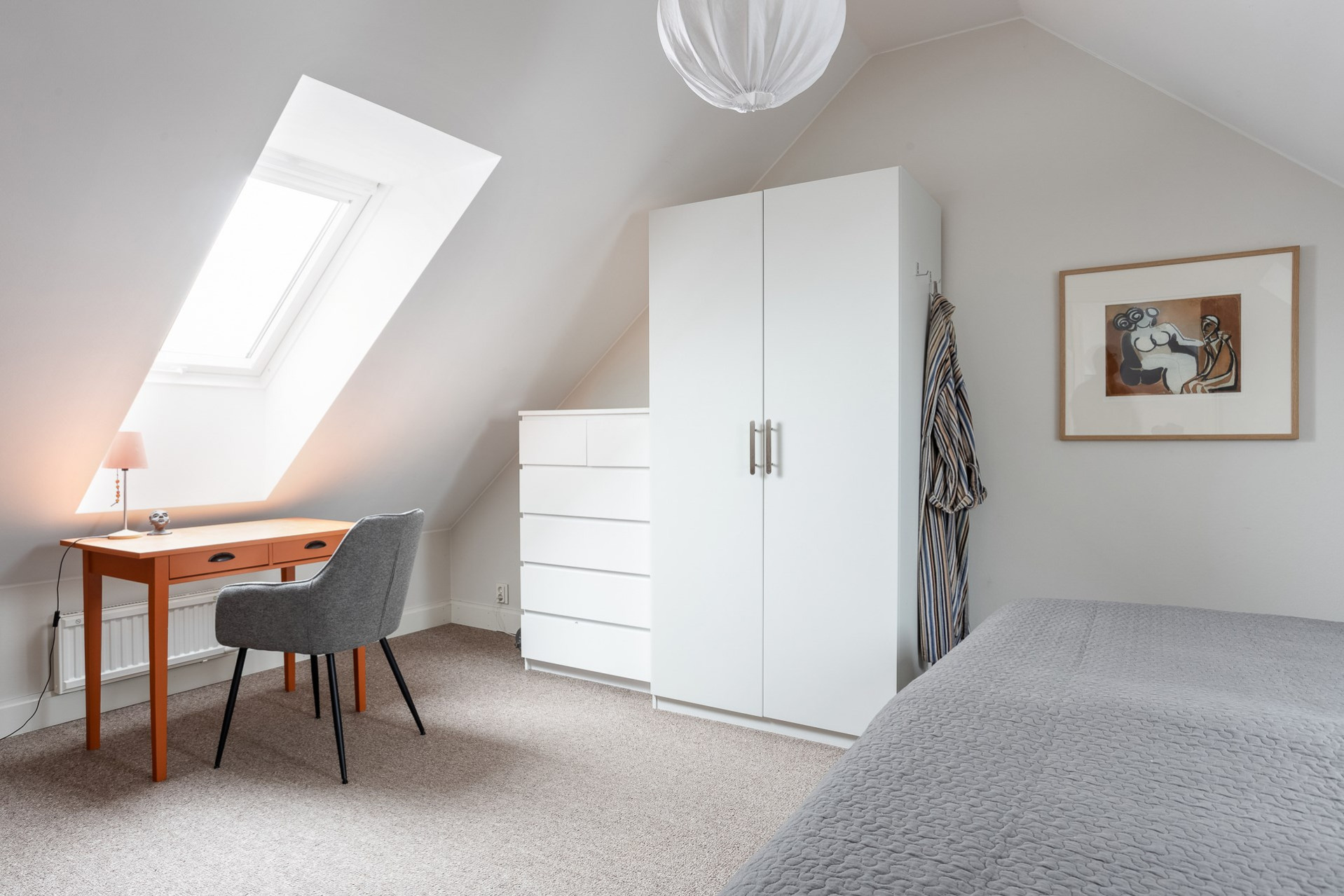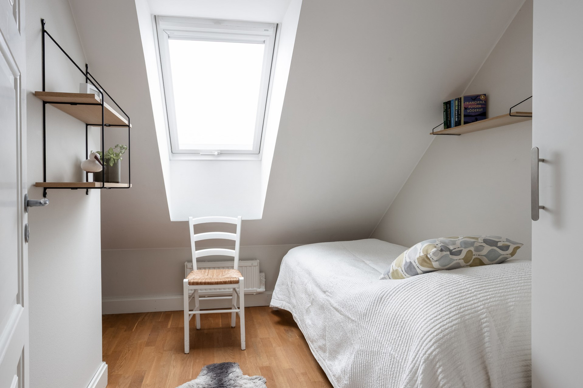 Minsta av de tre, men rymmer säng och skrivbord/mysigt kryp in för de små. Garderob.