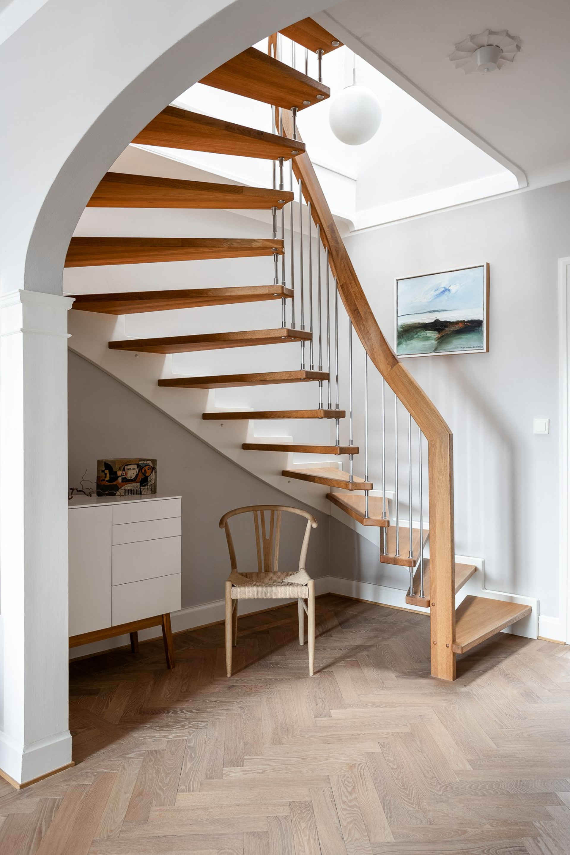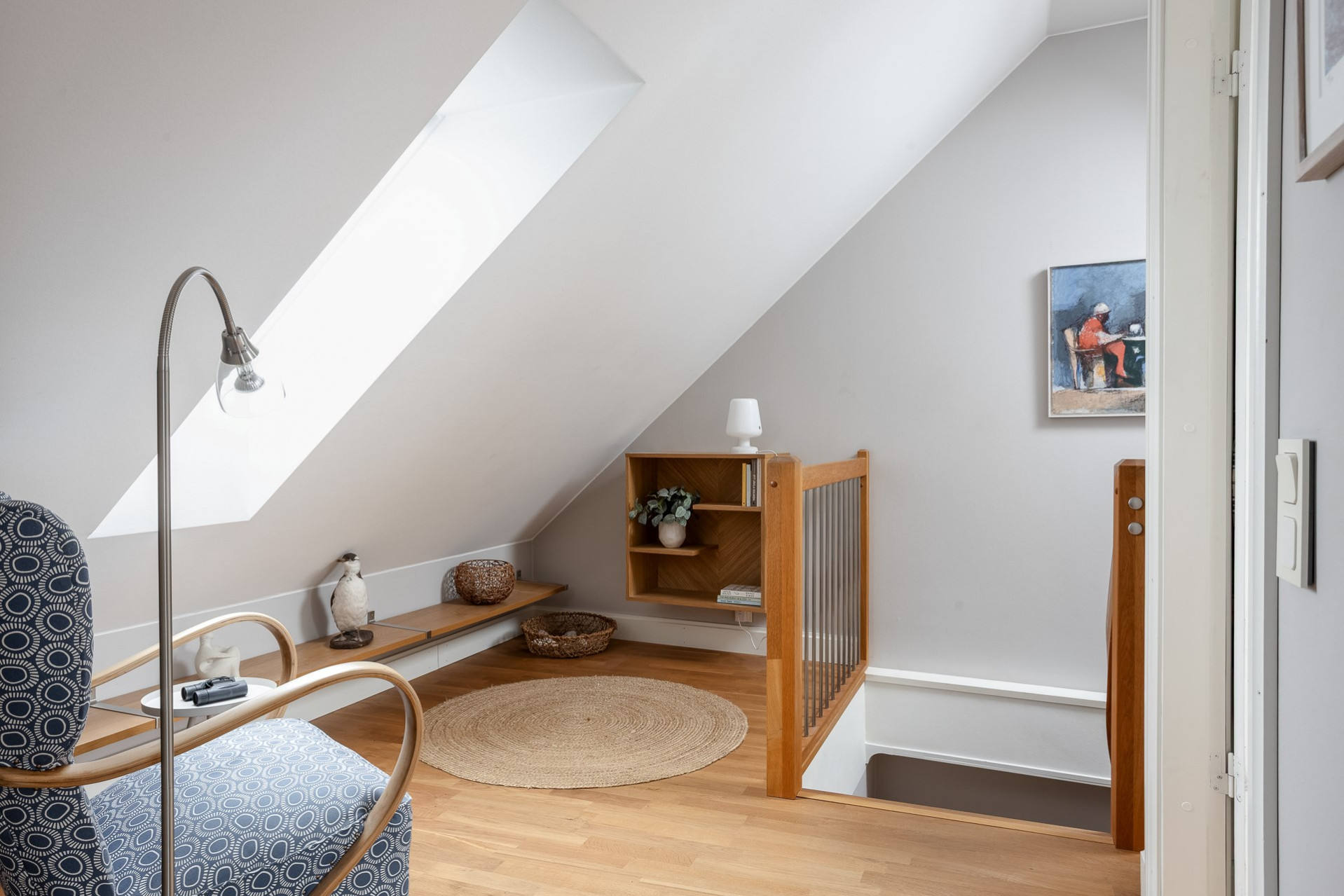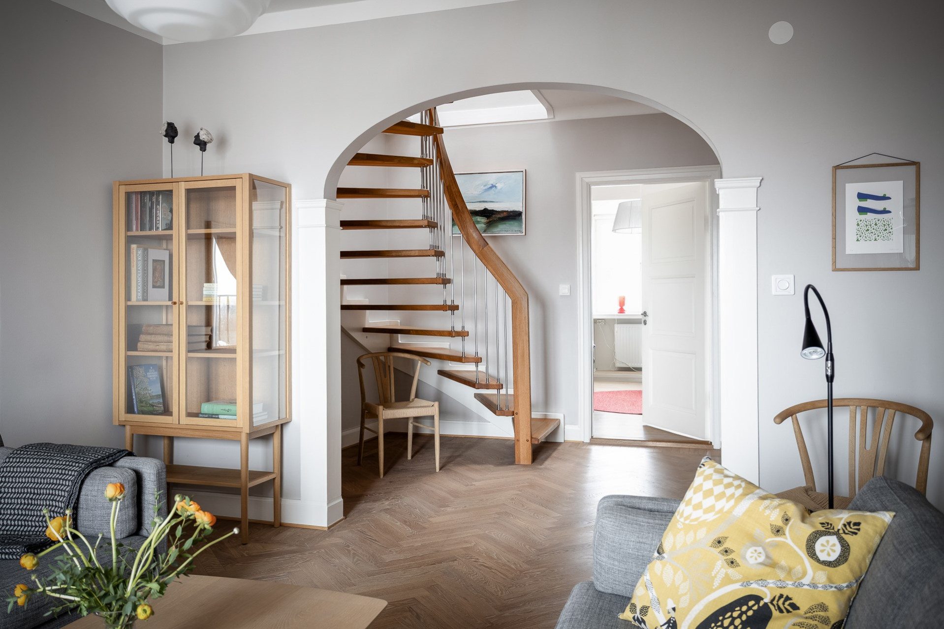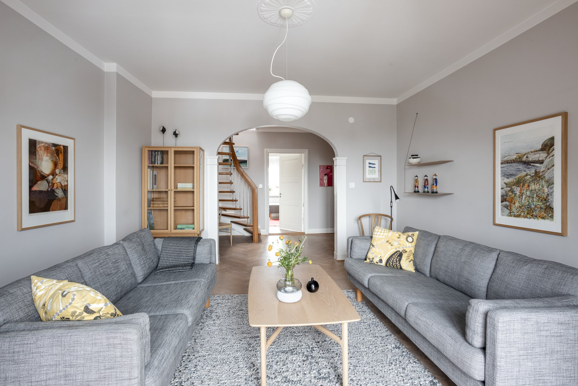 I centrum av bostaden ligger den vackra ek-trappan och intill ligger bostadens vardagsrum. Här flyter den hårdvaxade fiskbensparketten mellan rummen. En läcker detalj är det rundade pelarvalv som avgränsar de två rummen. Vid trappan kan man ha en mysig läshörna och i vardagsrummet ryms rejäl sittgrupp. Härifrån nås balkongen och man har en magnifik utsikt!