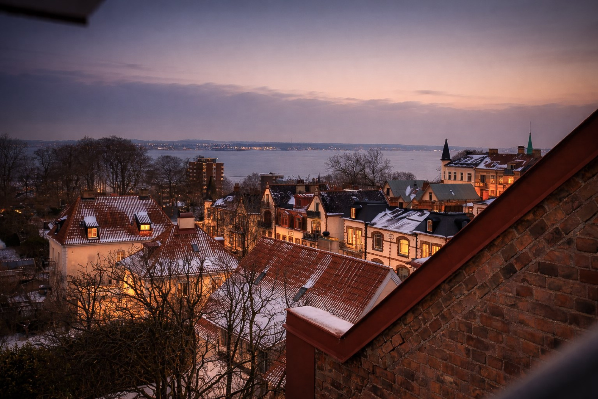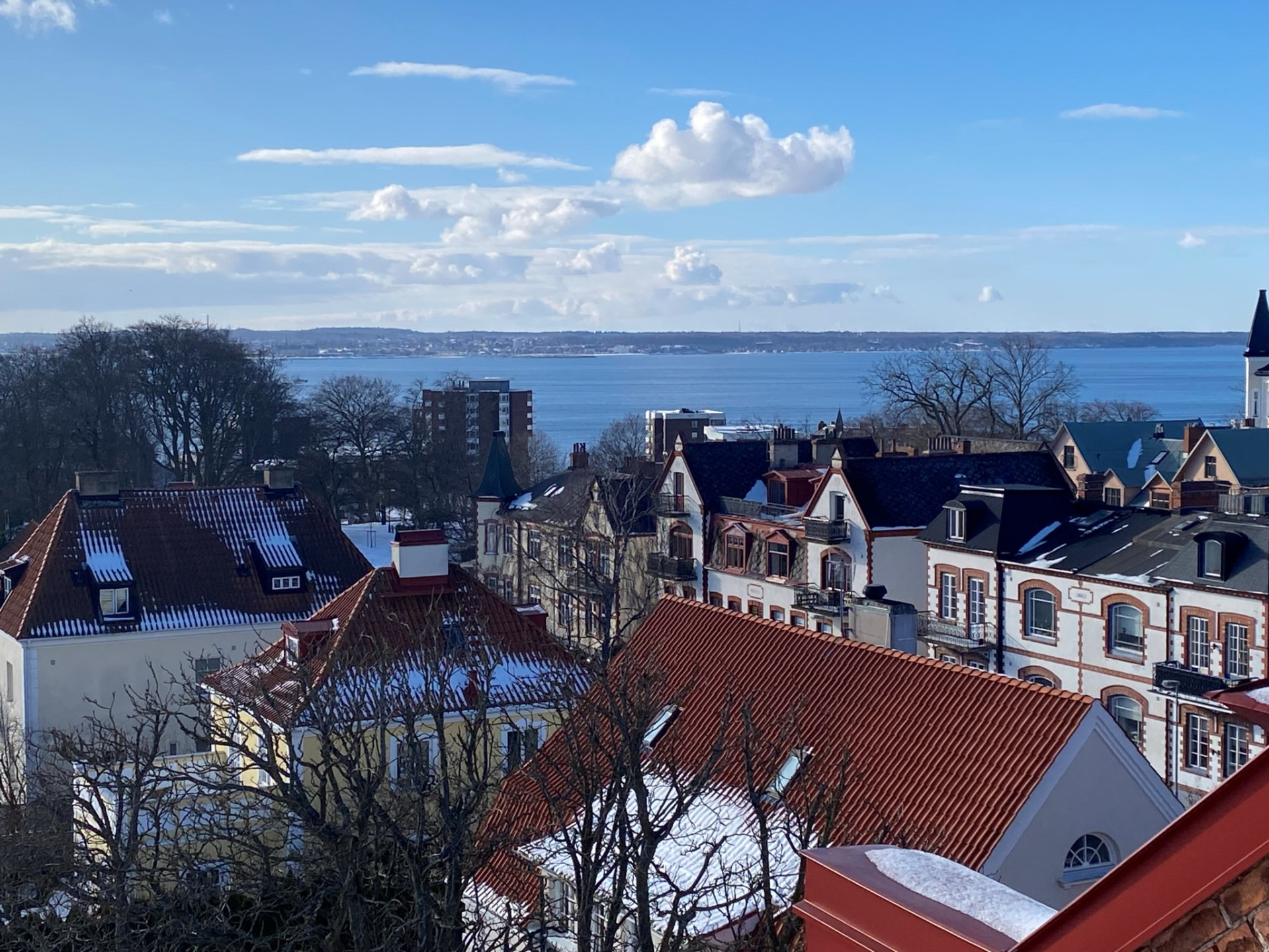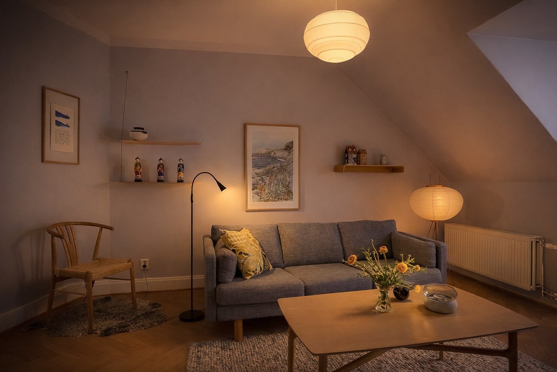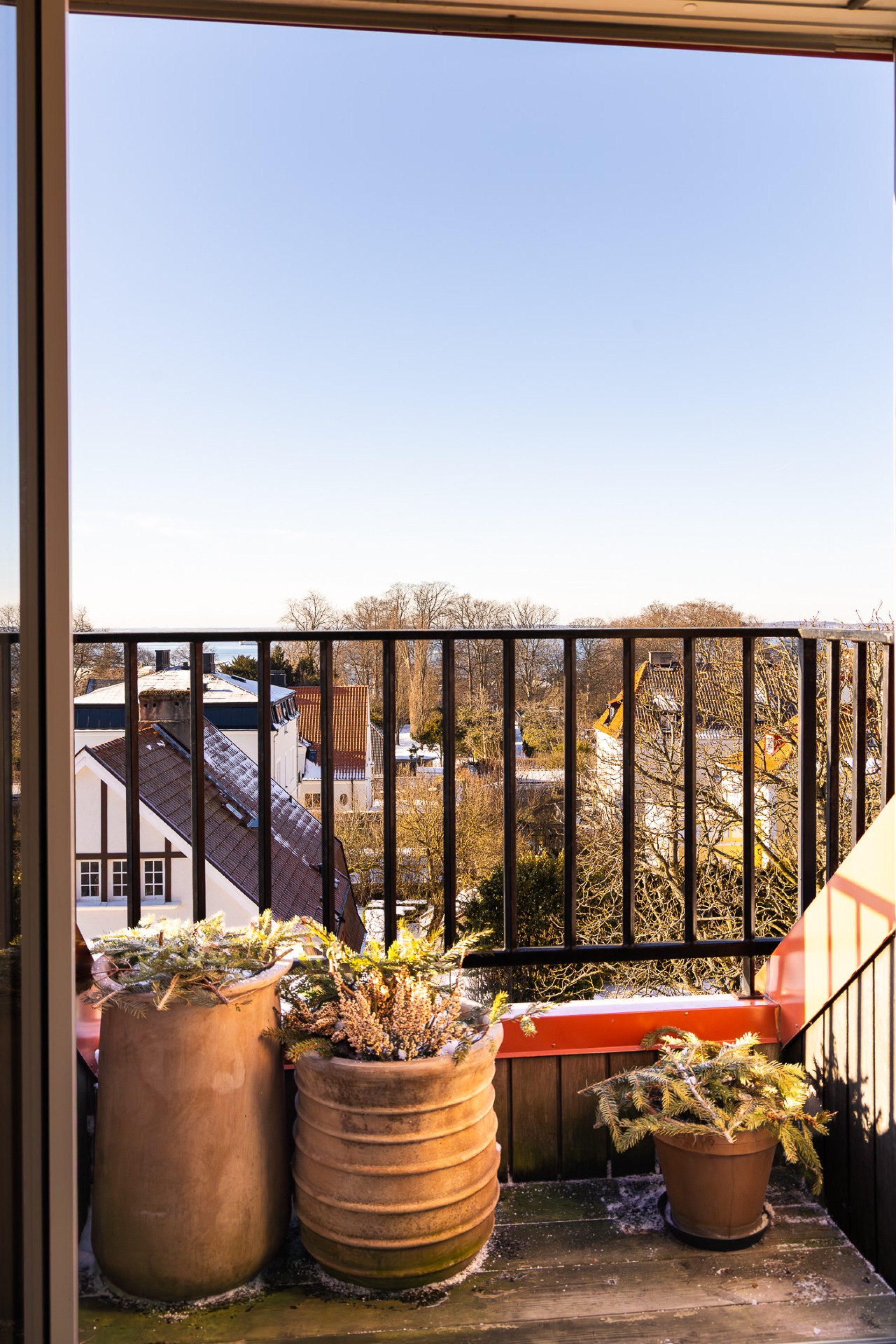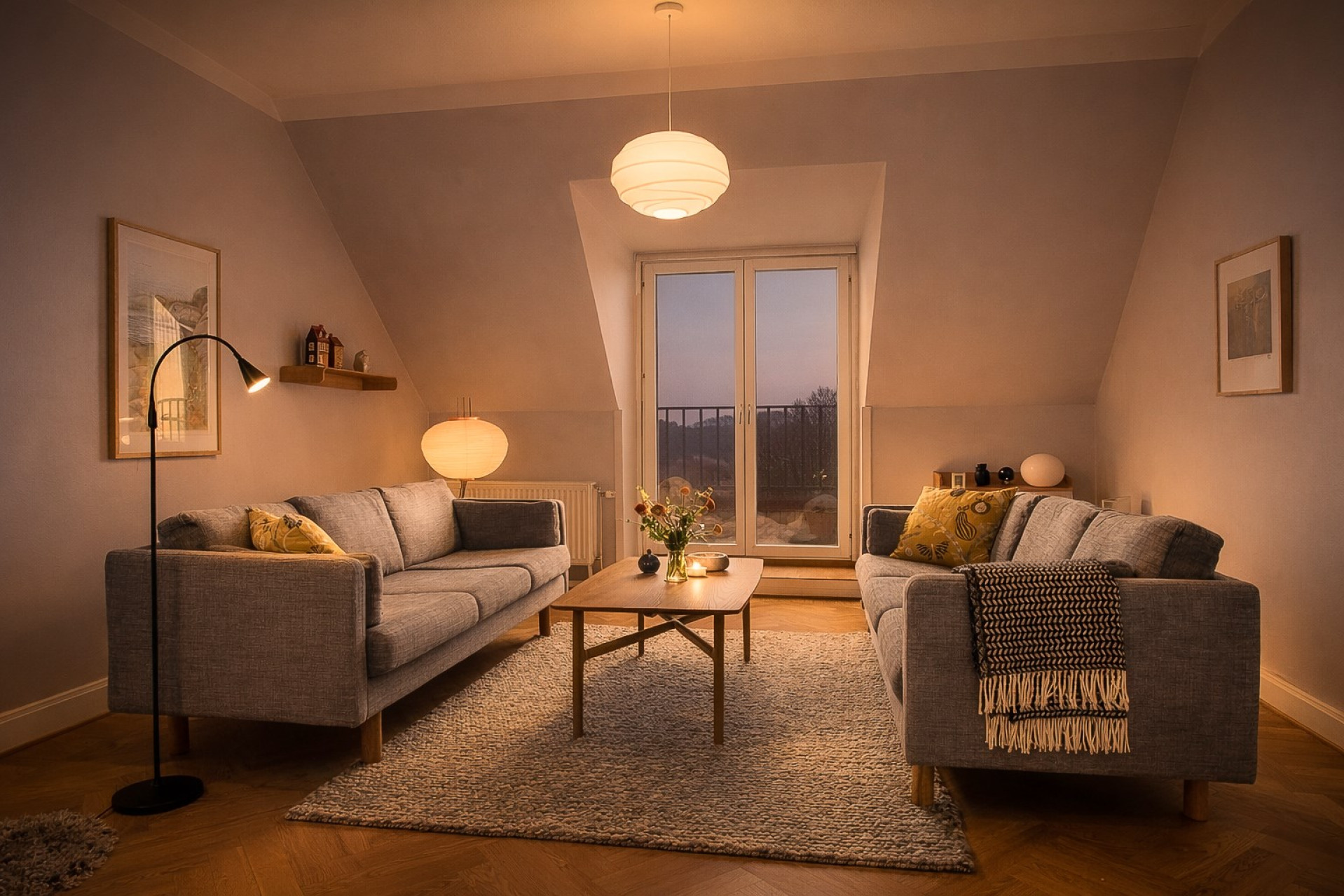 I centrum av bostaden ligger den vackra ek-trappan och intill ligger bostadens vardagsrum. Här flyter den hårdvaxade fiskbensparketten mellan rummen. En läcker detalj är det rundade pelarvalv som avgränsar de två rummen. Vid trappan kan man ha en mysig läshörna och i vardagsrummet ryms rejäl sittgrupp. Härifrån nås balkongen och man har en magnifik utsikt!