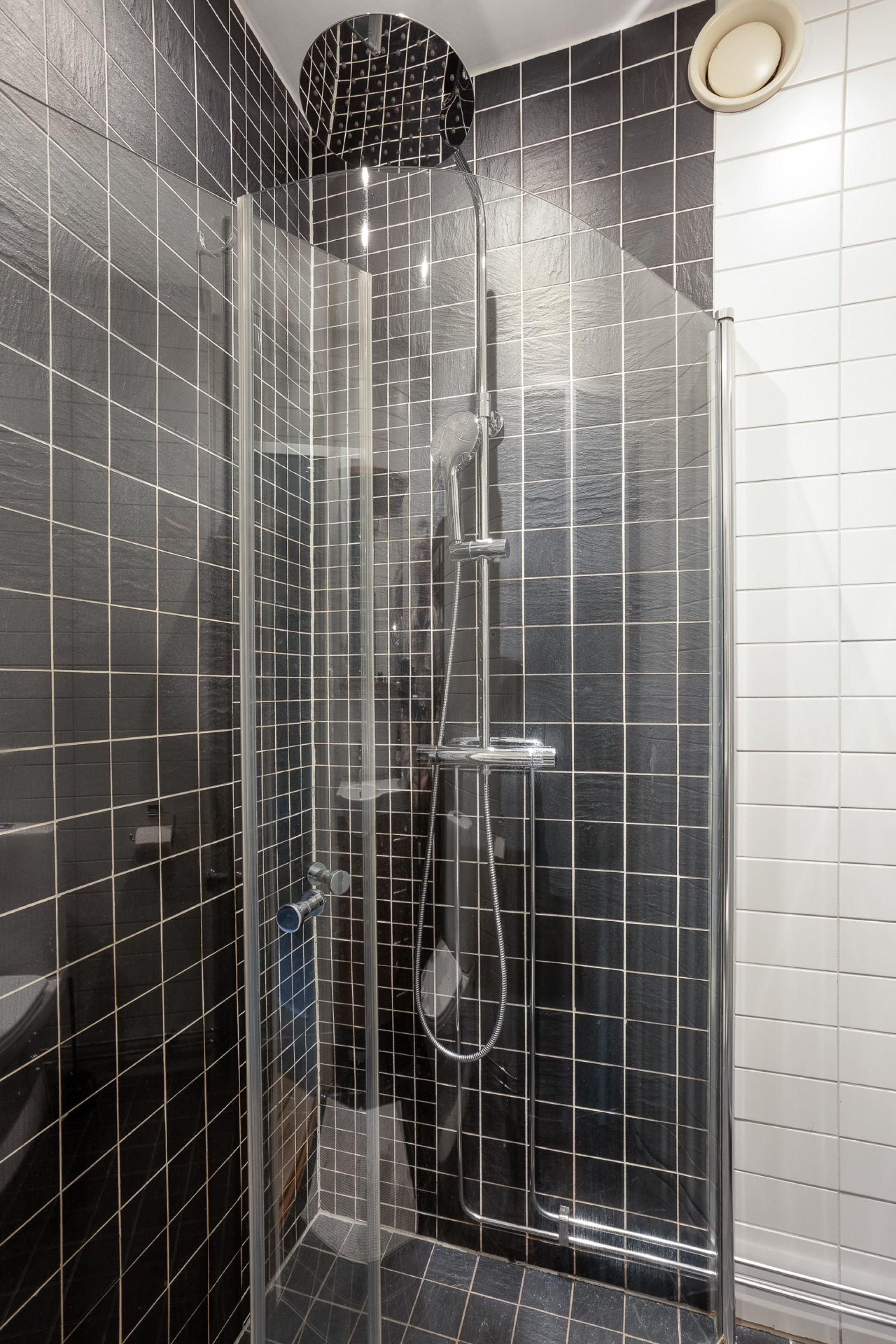 Helkaklat och snyggt badrum i grått och vitt. Golvvärme, spotlights i taket, duschhörna med glasdörrar, handfat med kommod, handdukstork, wc och högskåp.