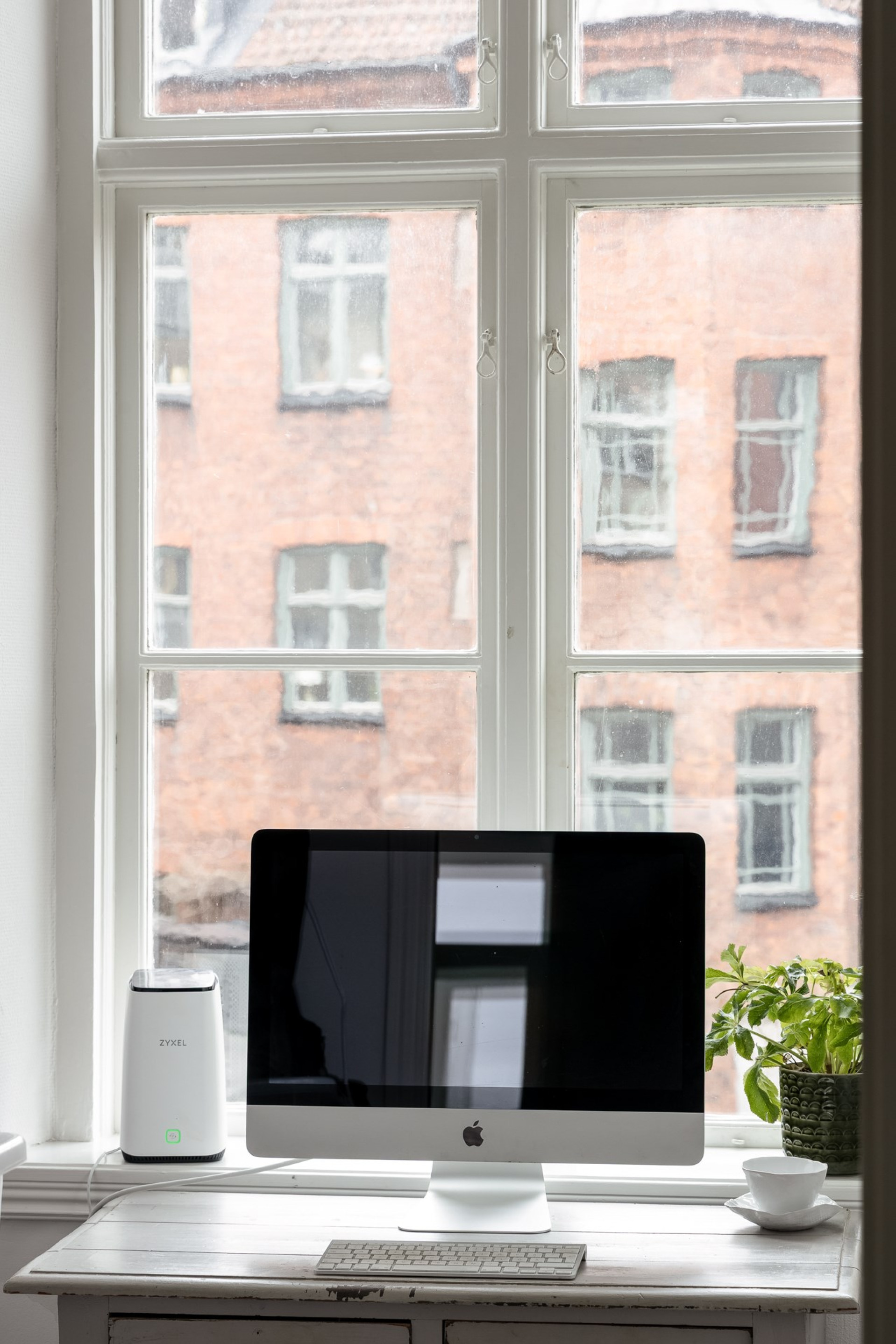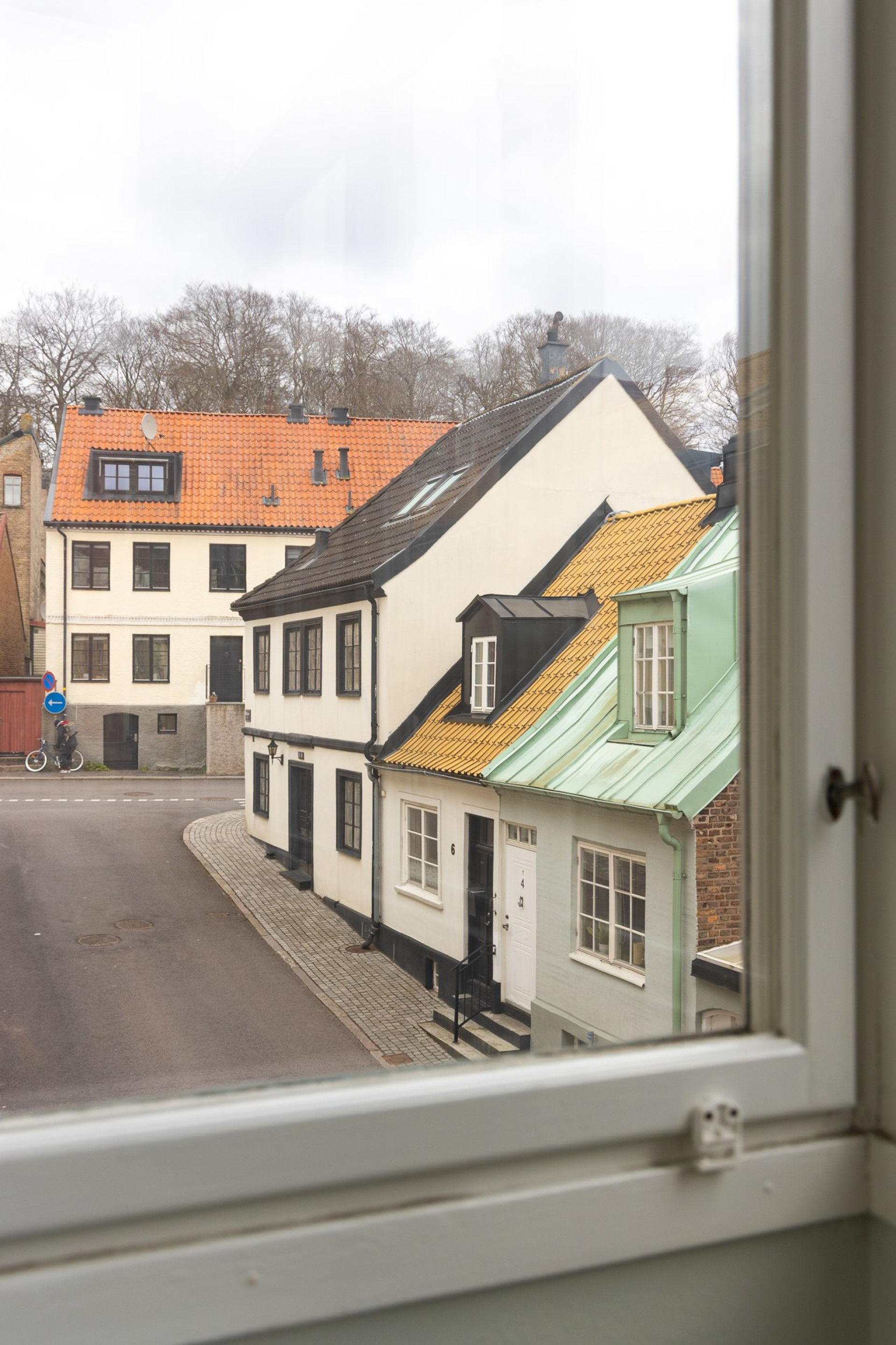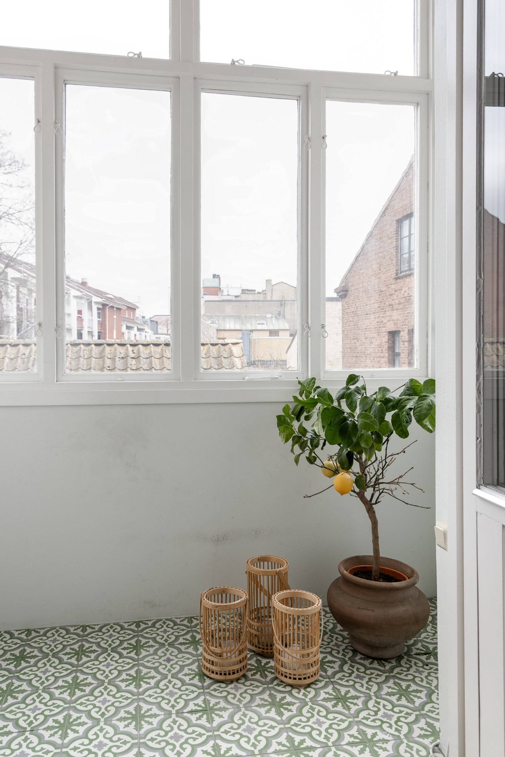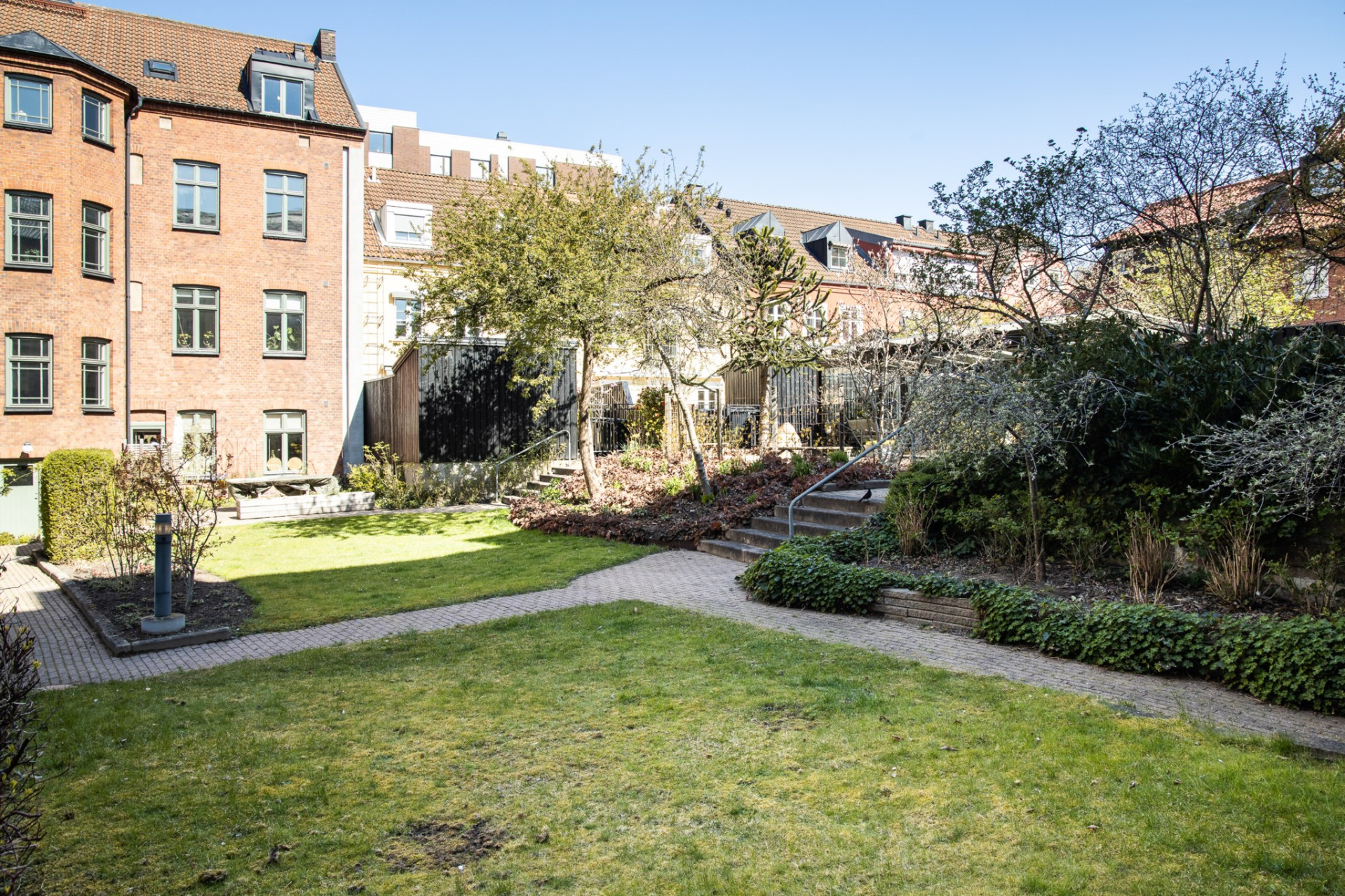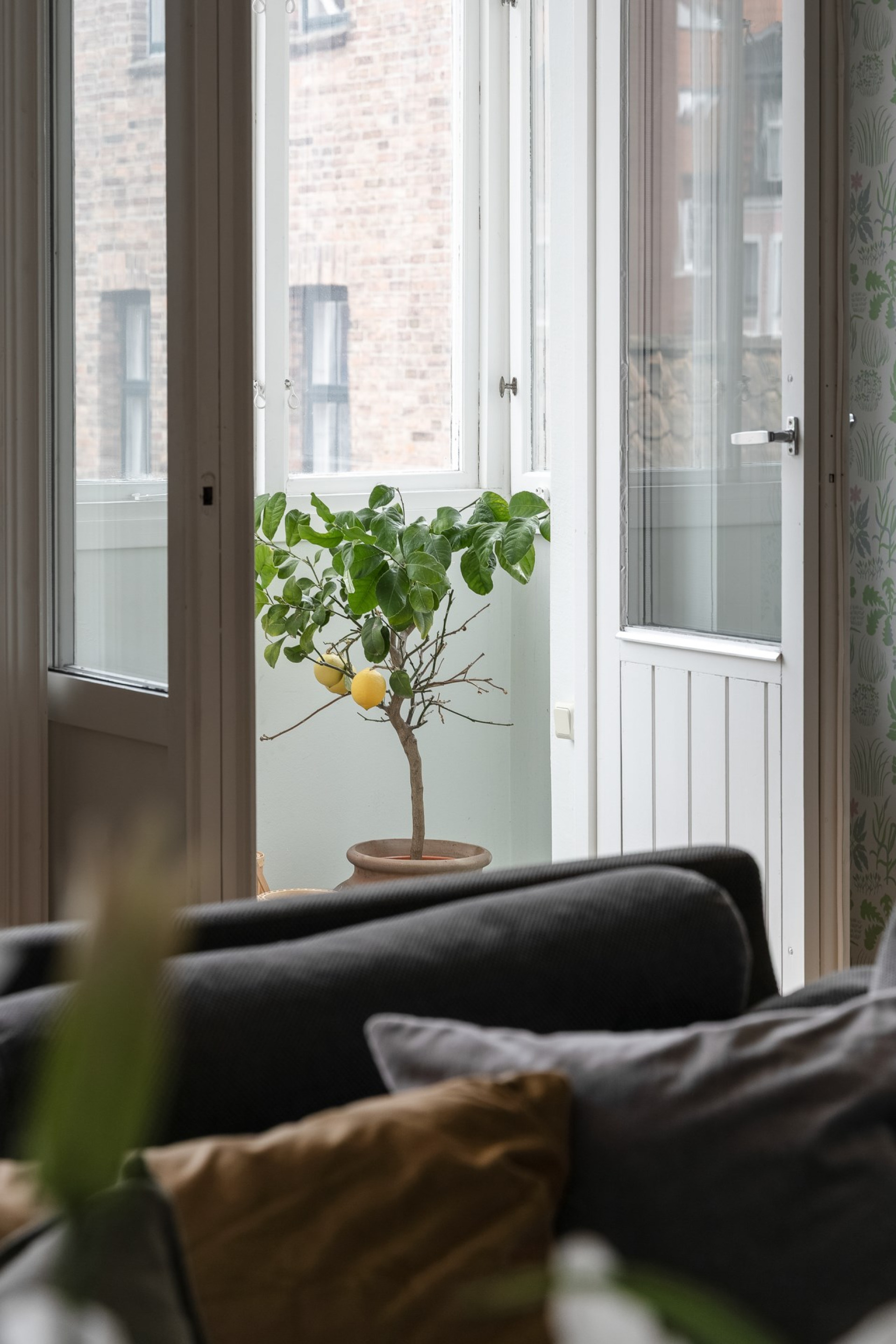 Insynsskyddad balkong med plats för cafébord och stolar, med utsikt över föreningens grönskande innergård.