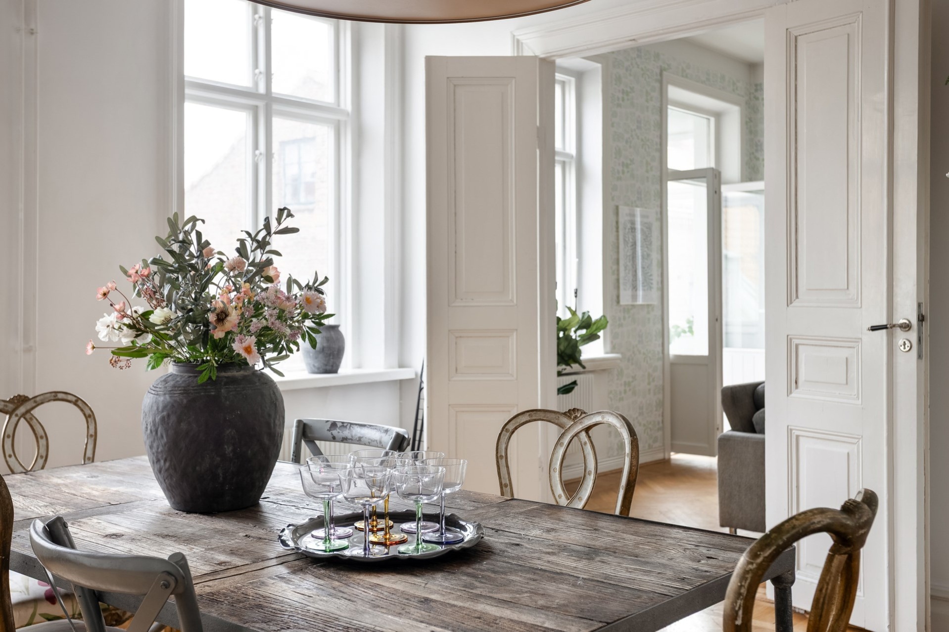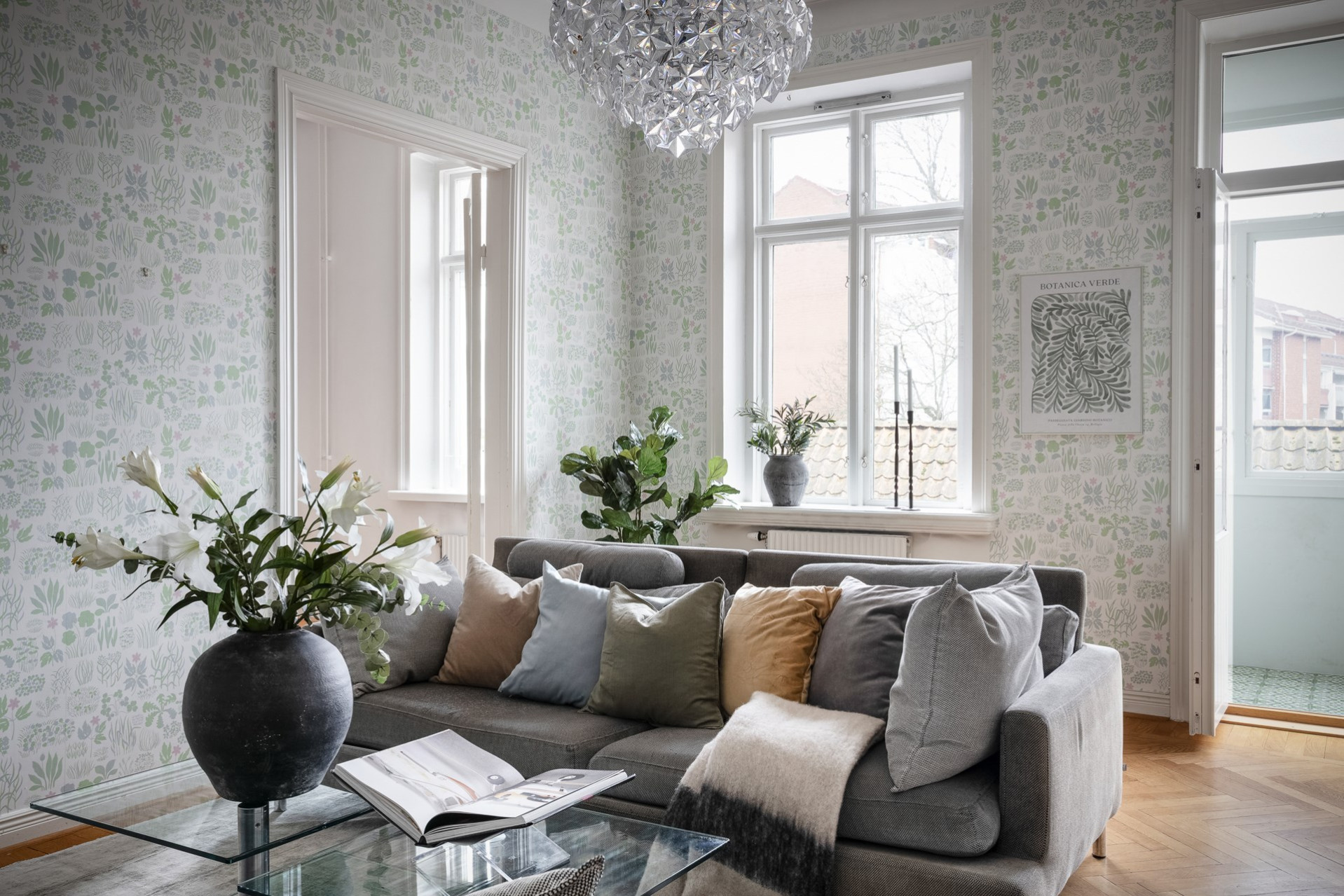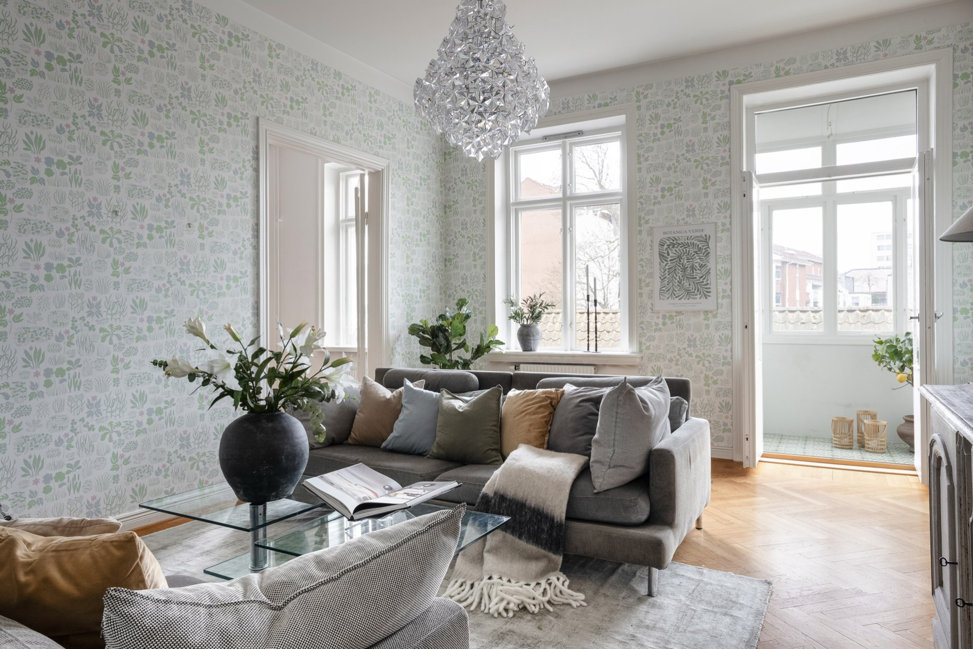Luftigt vardagsrum nås via eleganta pardörrar och bjuder på generös yta. Fiskbensparketten fortsätter in här och tillsammans med möjligheten att öppna mot blomsterrummet förstärks känslan av ljus och rymd.