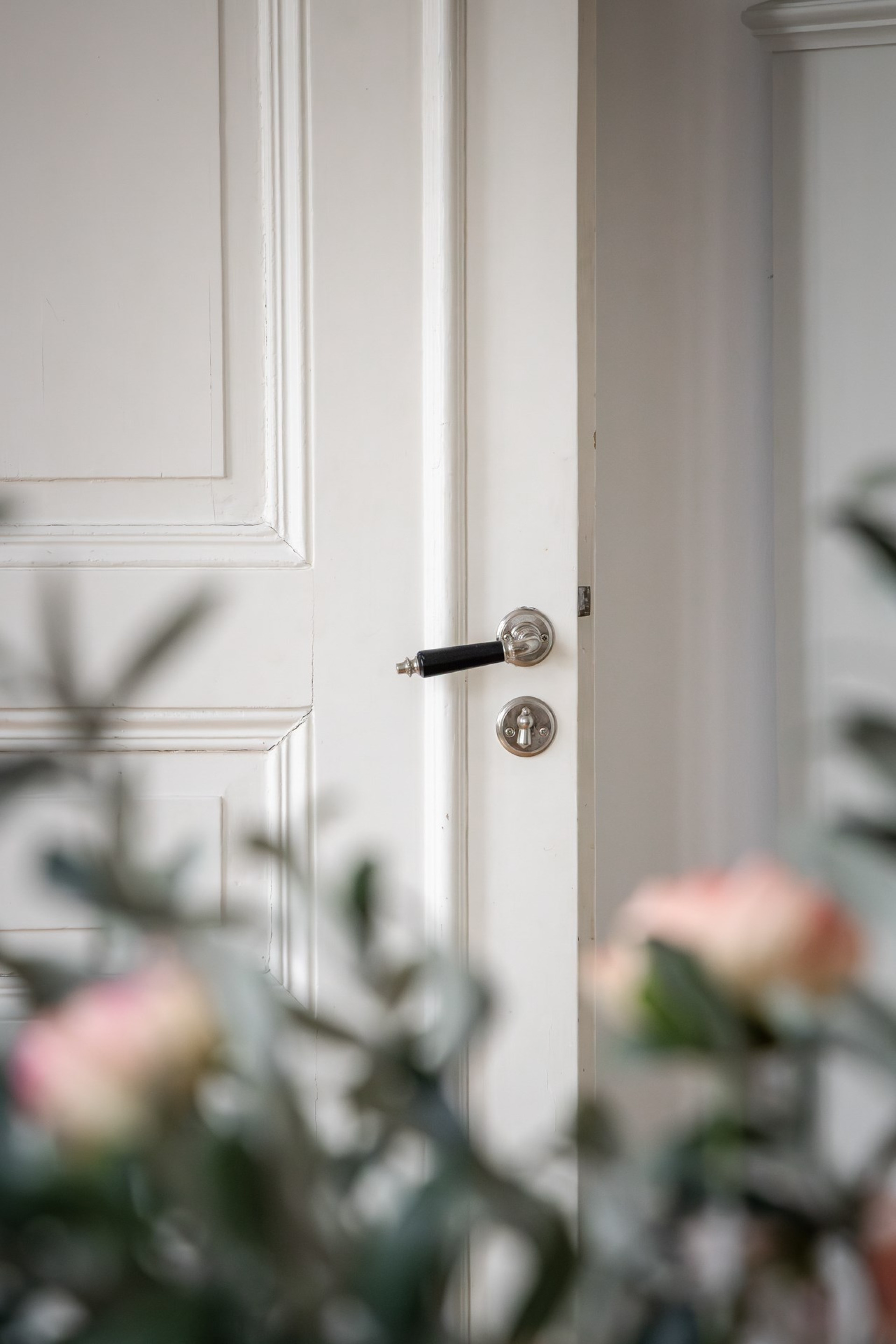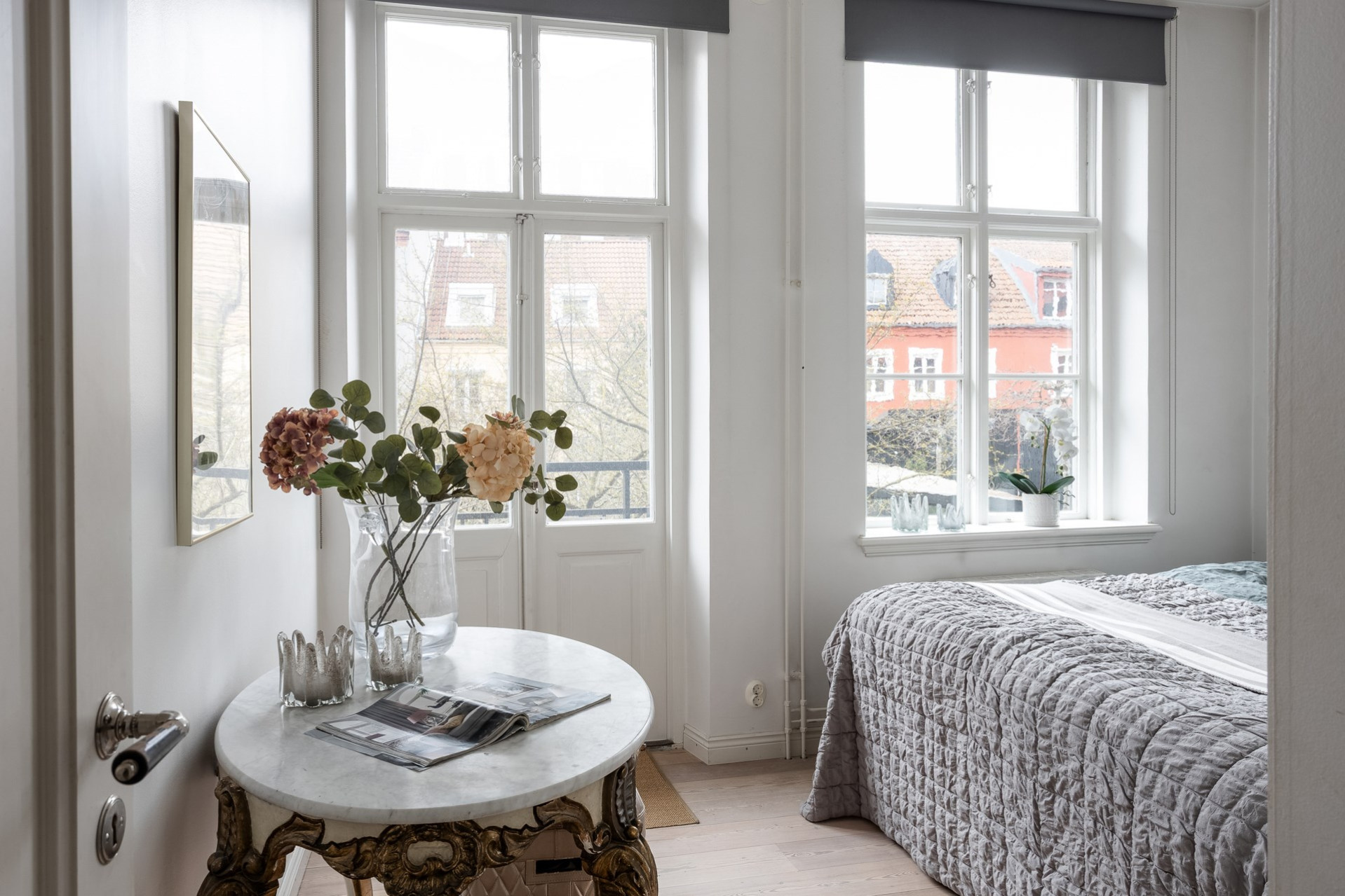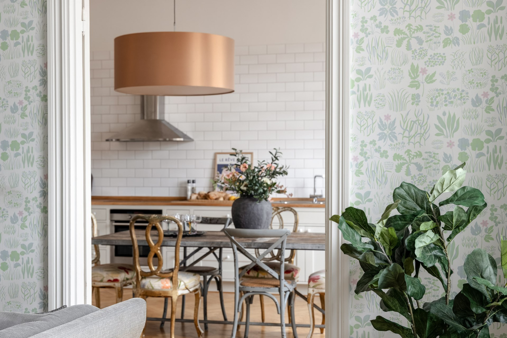 Luftigt vardagsrum nås via eleganta pardörrar och bjuder på generös yta. Fiskbensparketten fortsätter in här och tillsammans med möjligheten att öppna mot blomsterrummet förstärks känslan av ljus och rymd.
