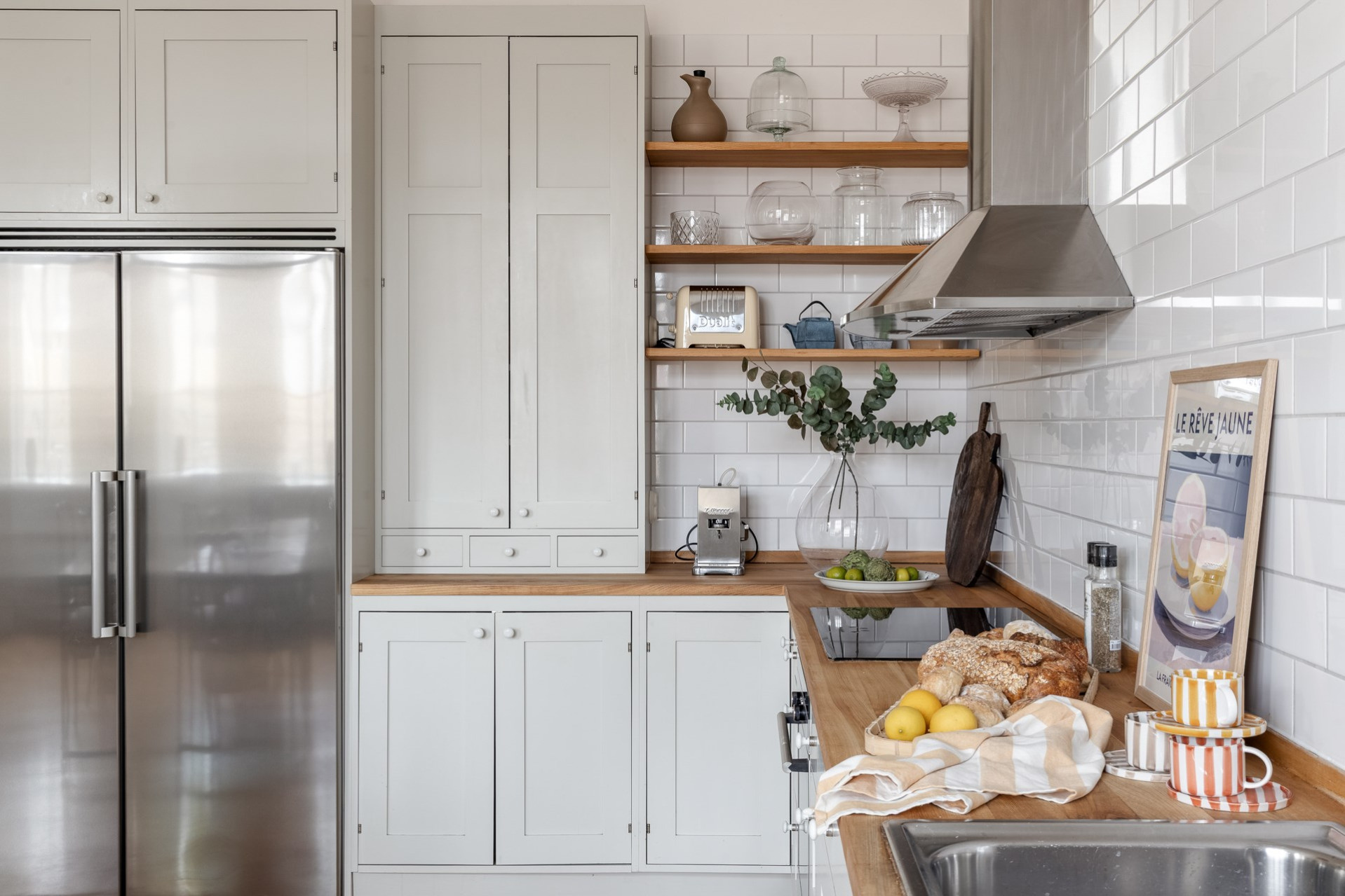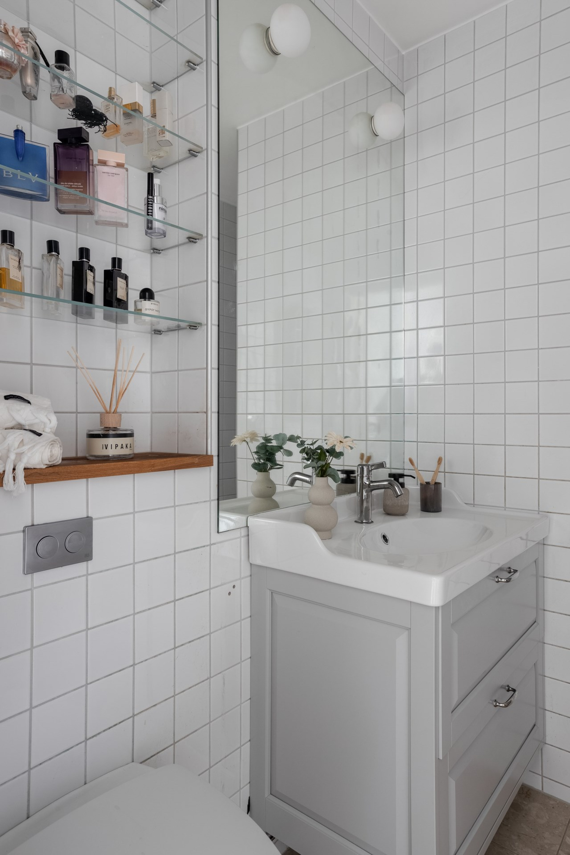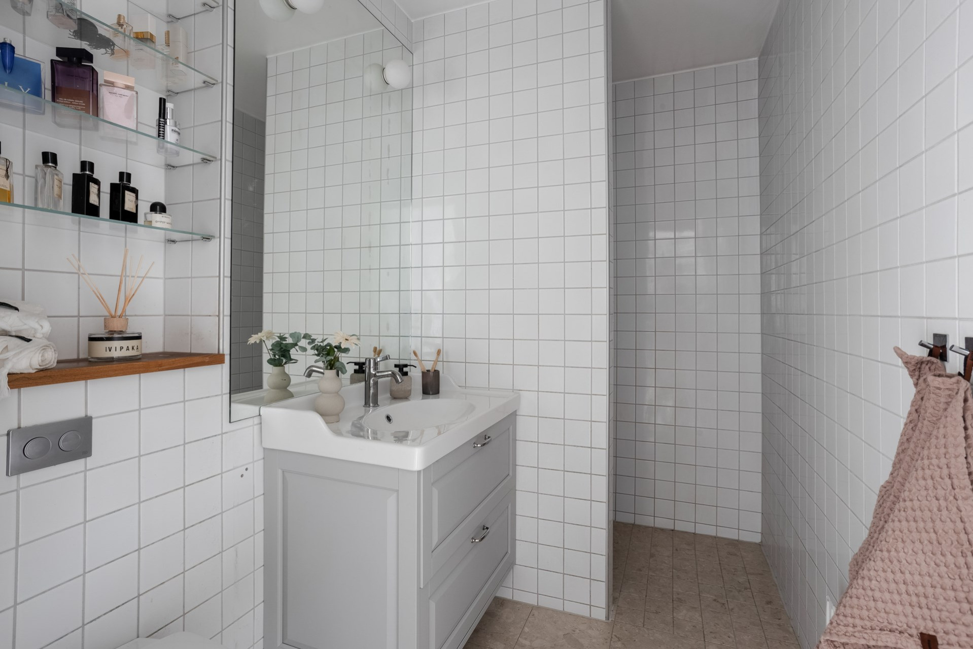 Helkaklat badrum med stilren inredning som harmonierar med kökets materialval.