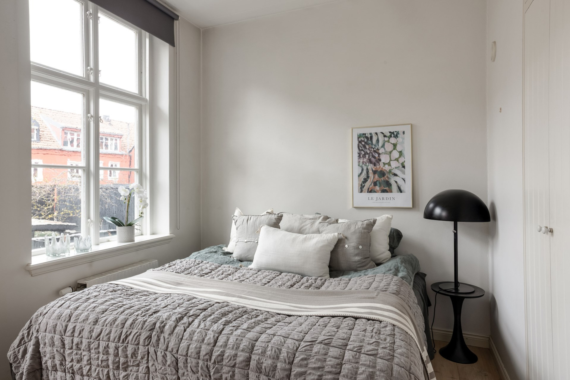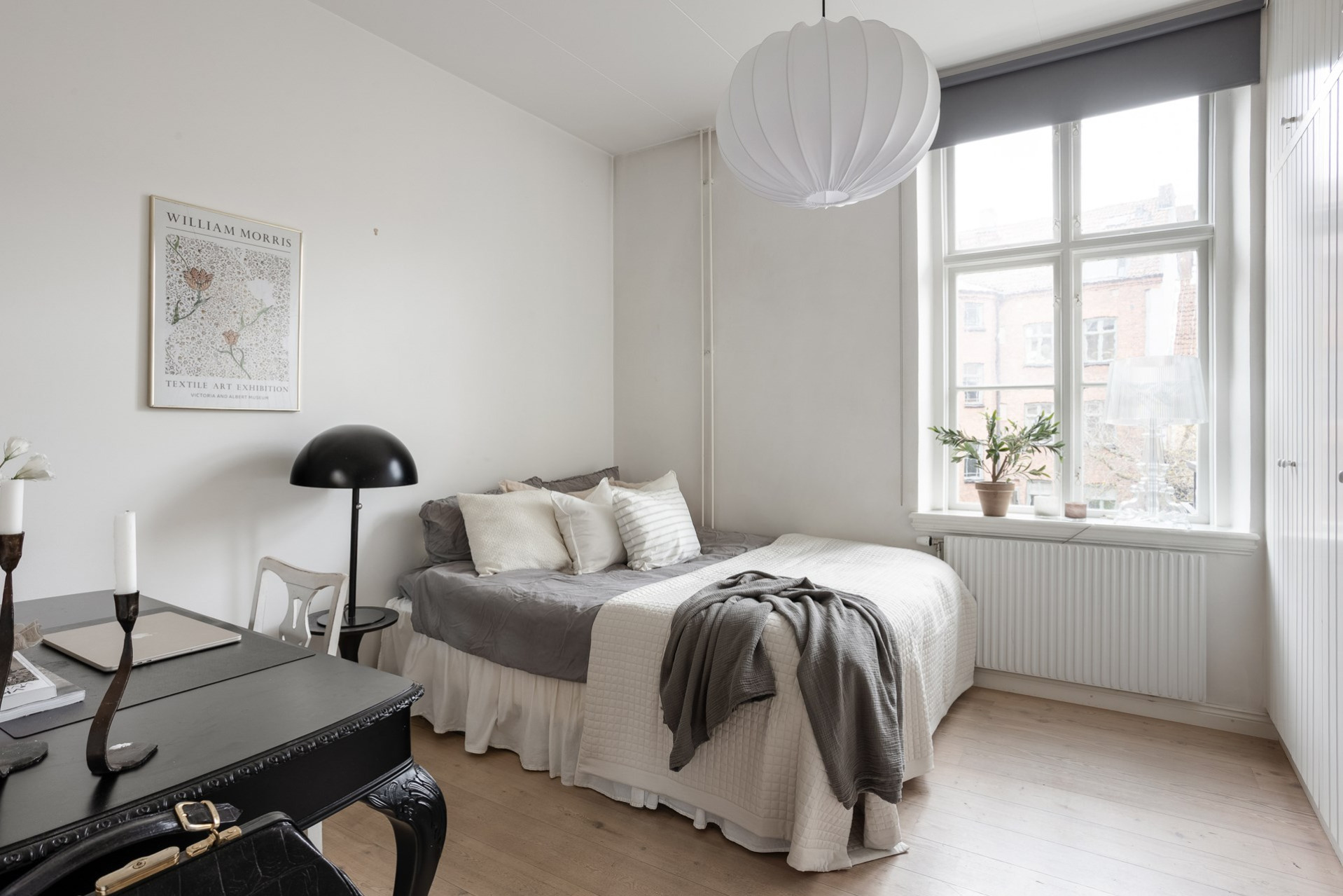 Stort sovrum med goda förvaringsmöjligheter i rymliga garderober. Plats för både större säng och skrivbord. Direkt utgång till balkongen, en perfekt morgon- och kvällsplats med fantastiskt ljusinsläpp och utsikt mot innergården.