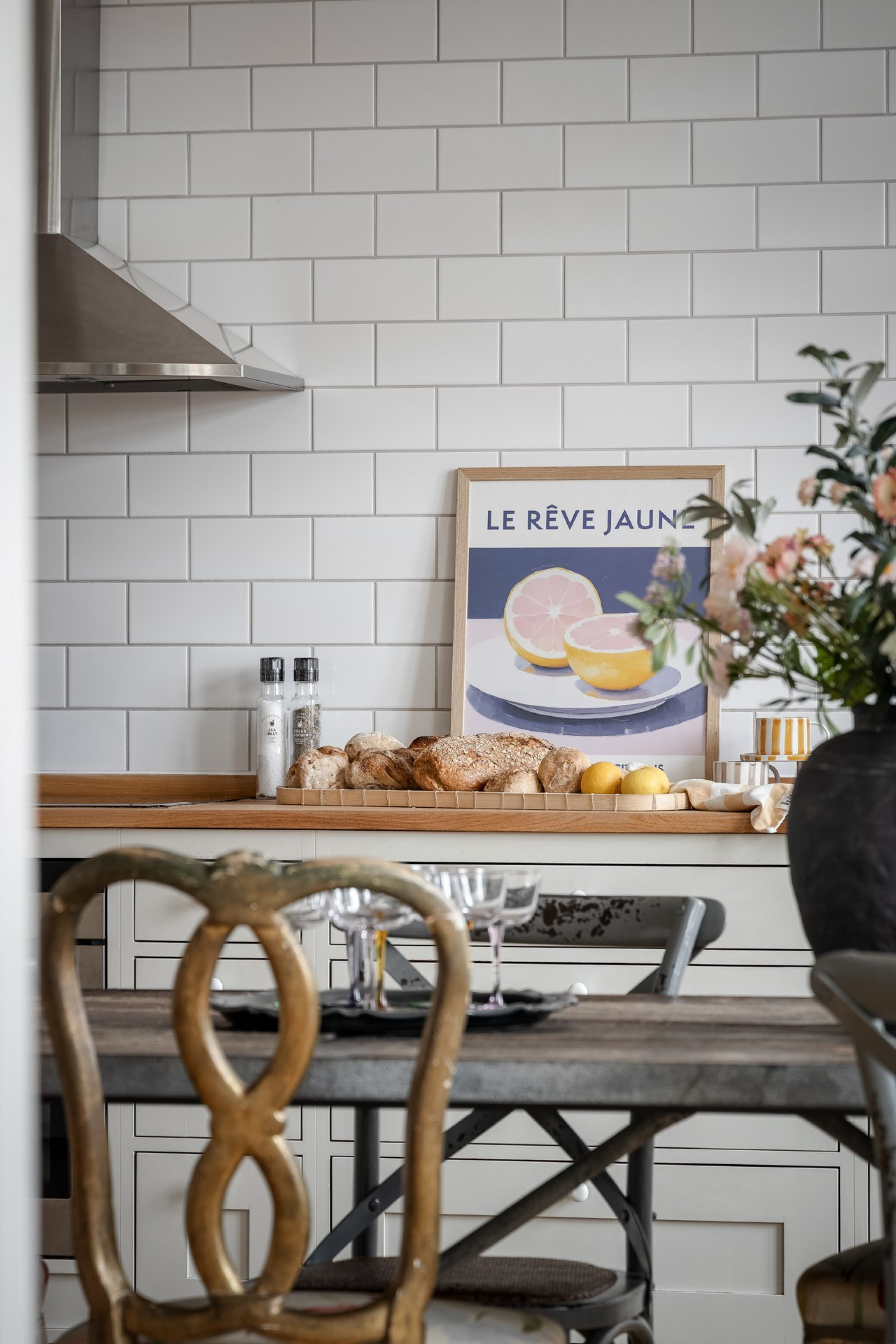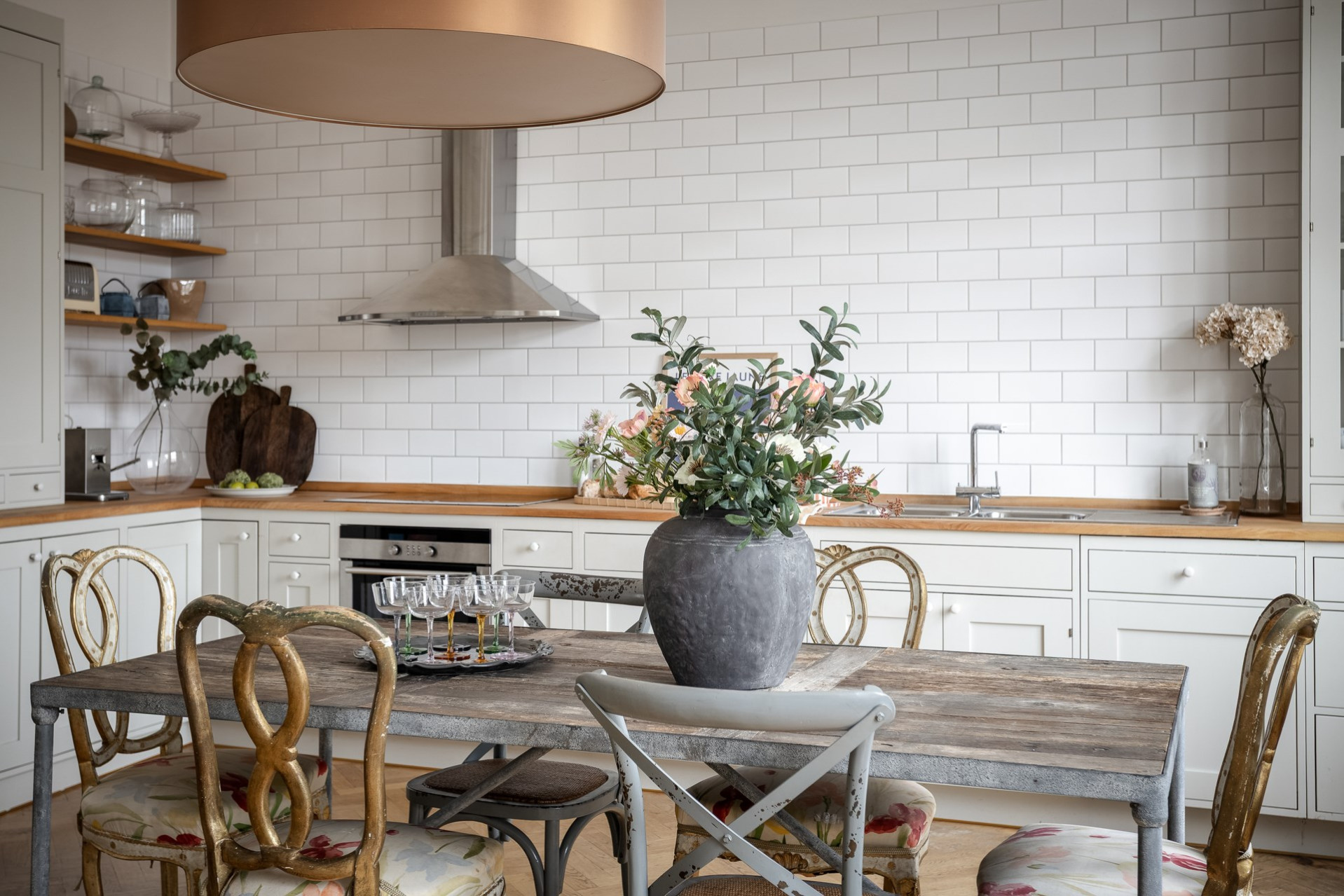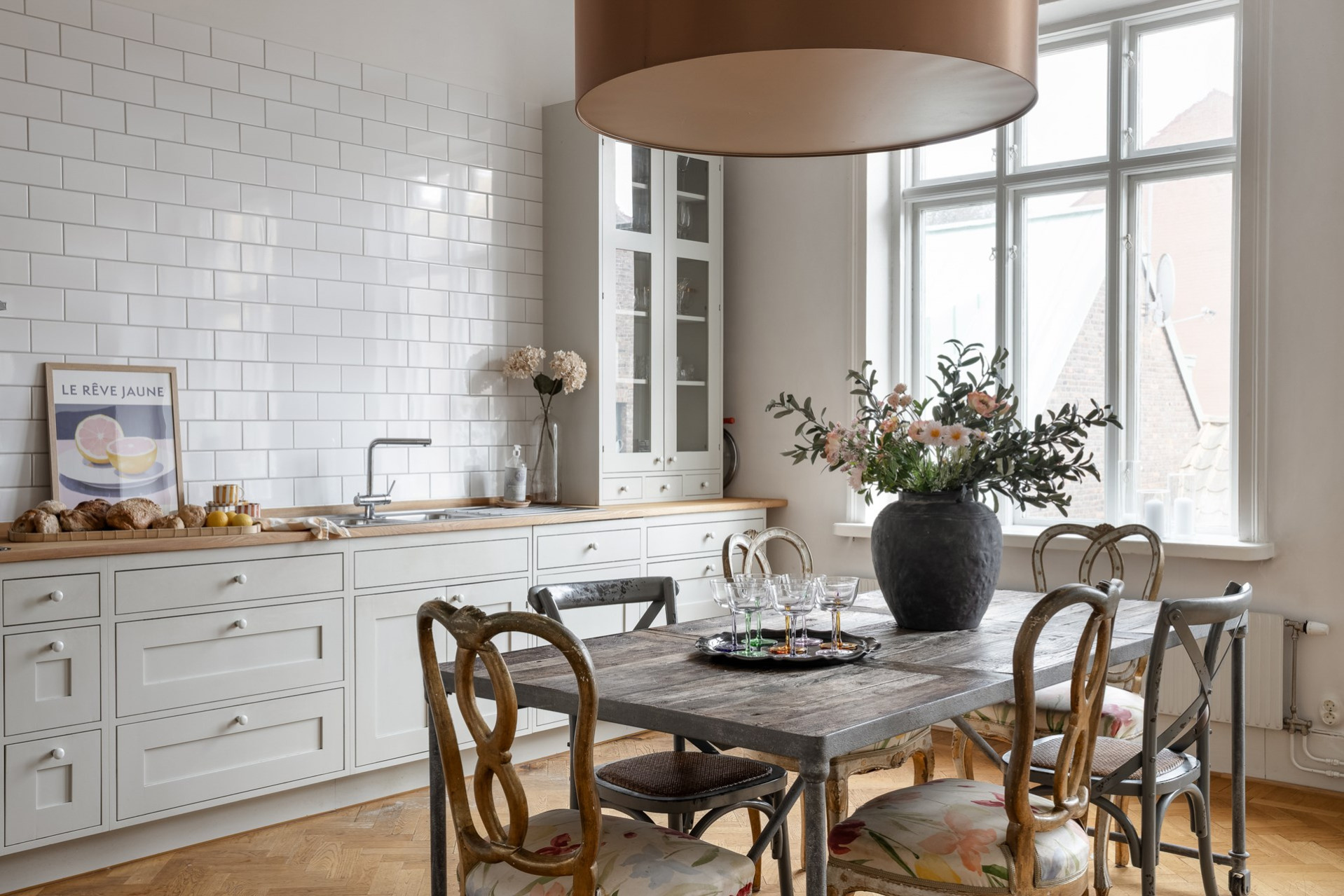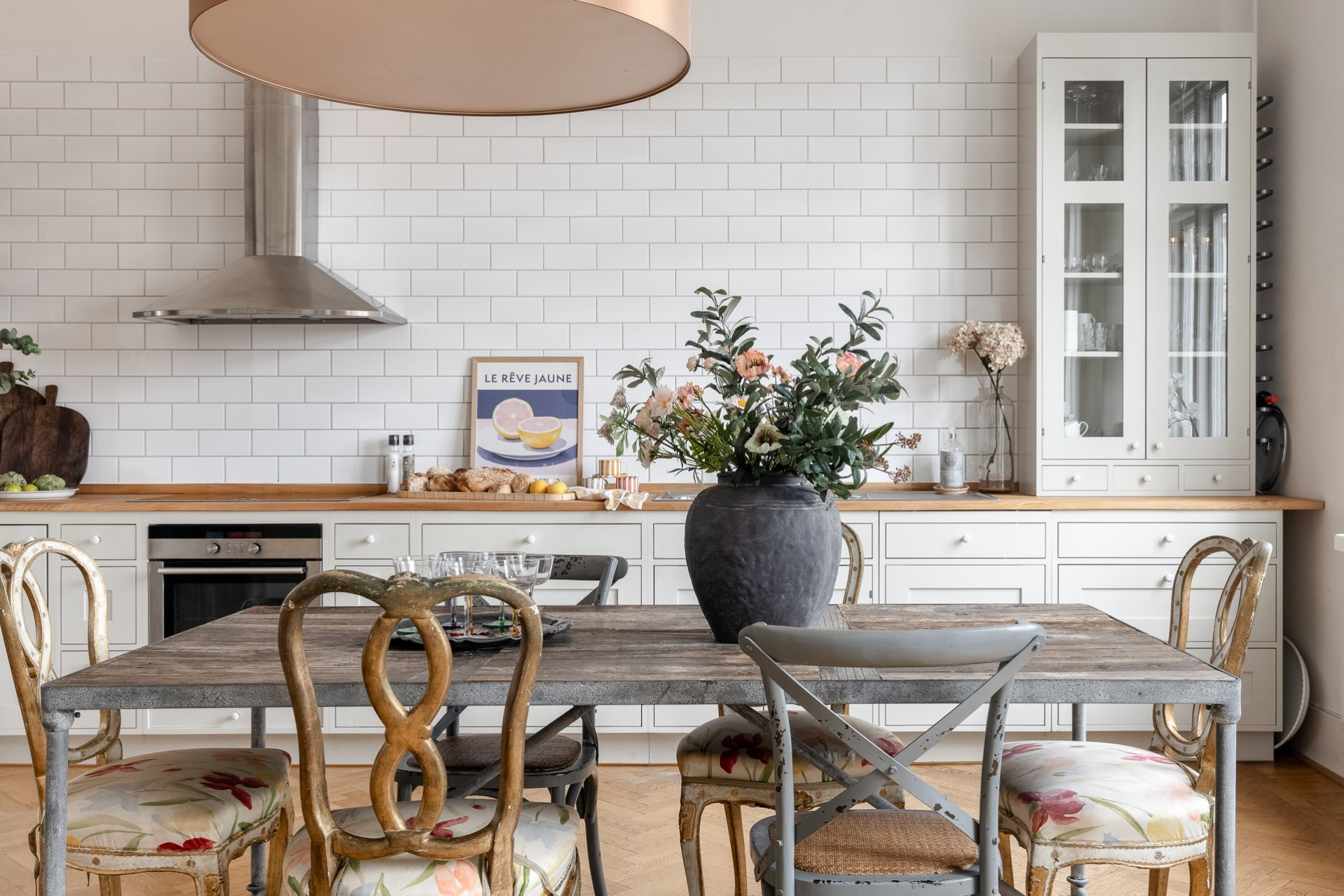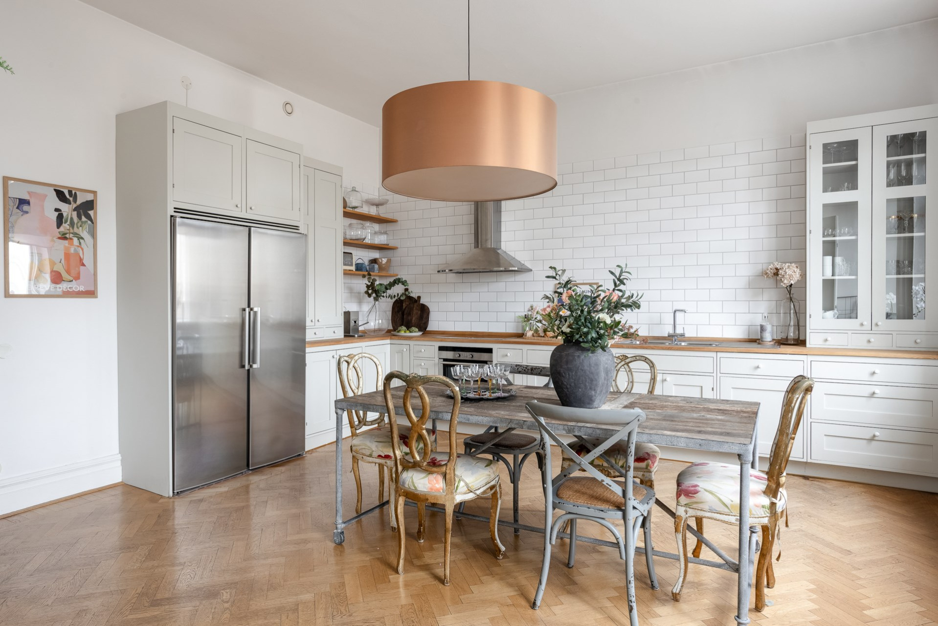 Platsbyggt kök med omsorgsfullt utvalda material och tidlös design. Den vackra fiskbensparketten löper genom köket och skapar en elegant och sammanhållen yta där matlagning och umgänge möts. Maskinpark består av kyl, frys, diskmaskin, ugn, häll och fläkt. TVÄTTMASKIN finns i köket!