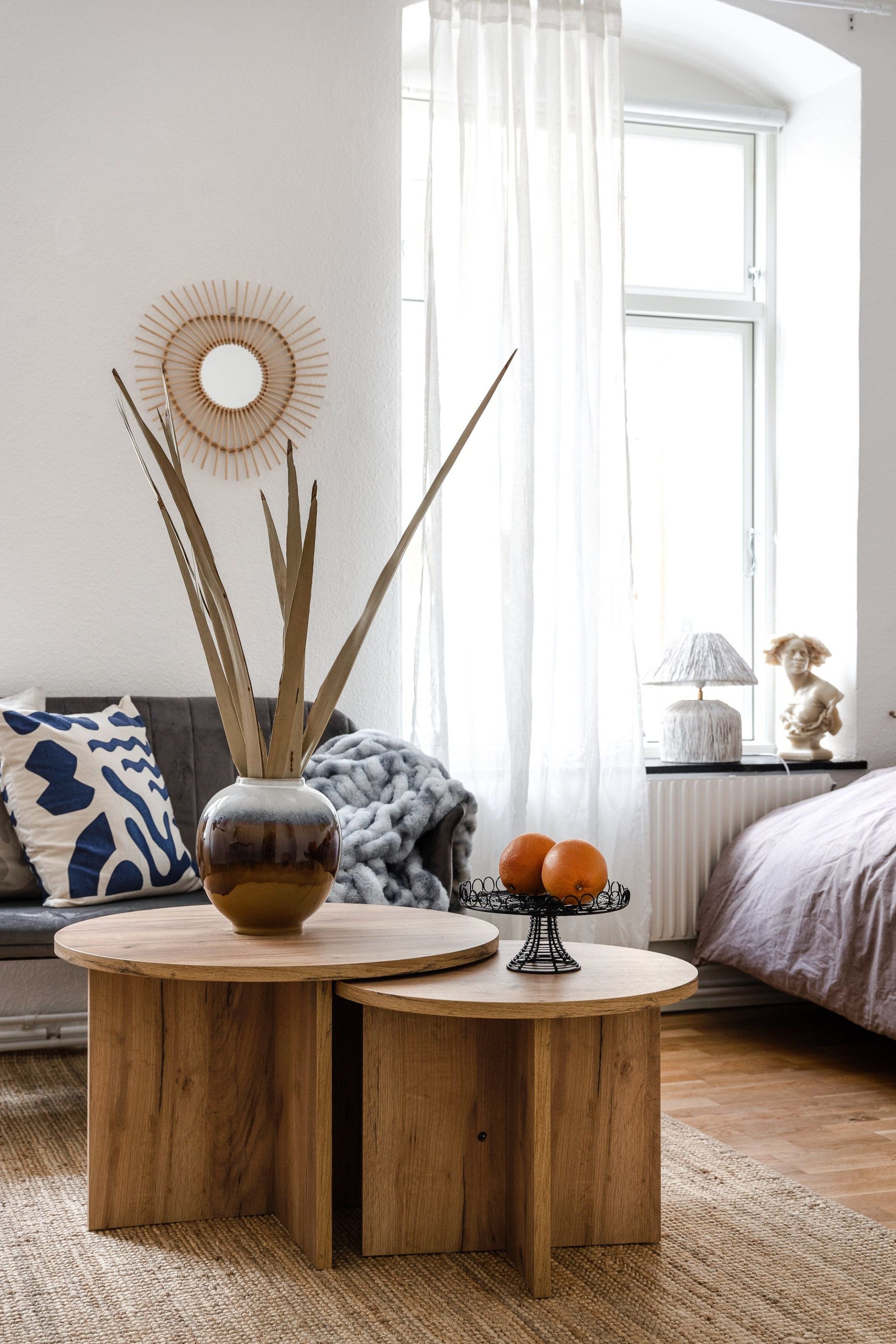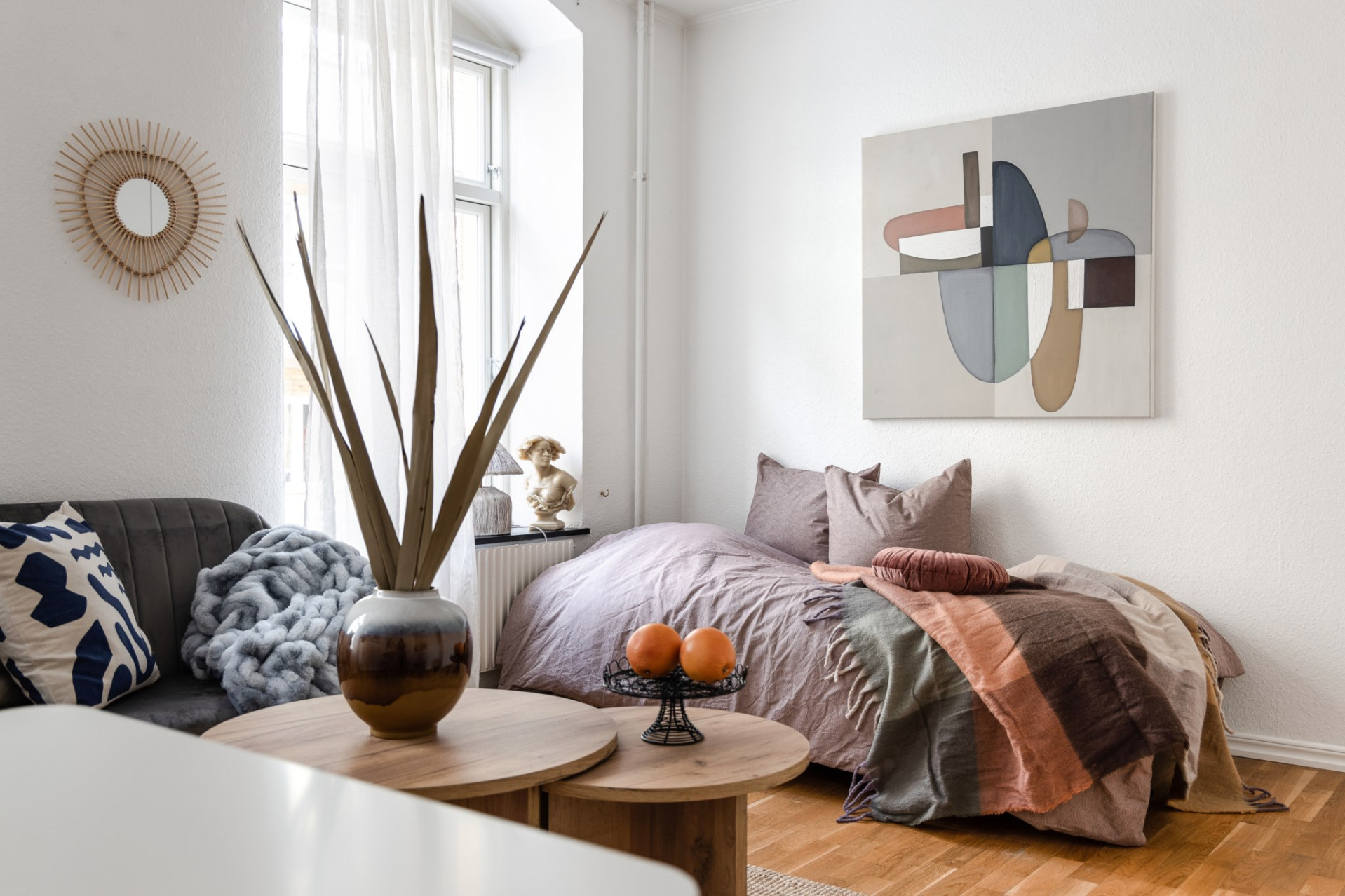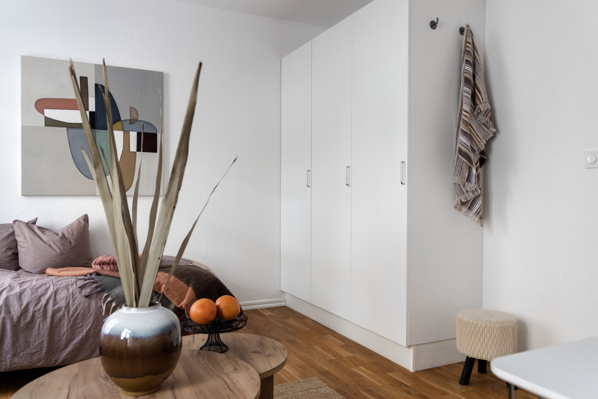 Sovrum/allrum: Trivsamt allrum med rikt ljusinsläpp från rummets 2 stora fönster. Rummet rymmer såväl sovdel, mindre matplats och liten soffhörna. Dessutom finns 3 garderober till förvaring längs ena väggen.