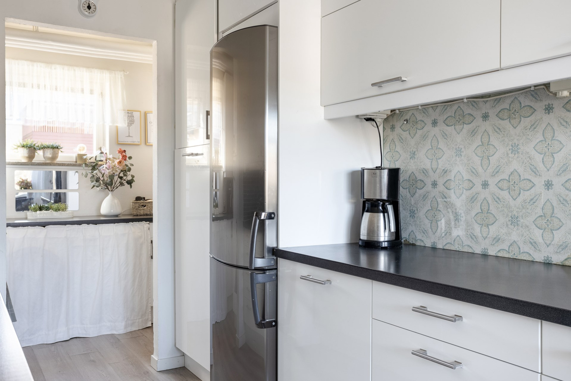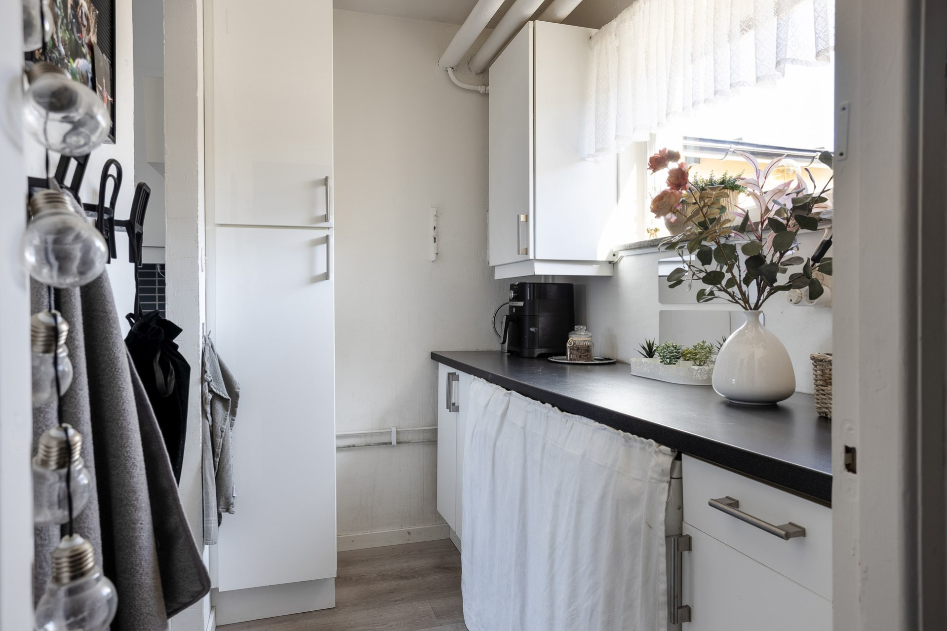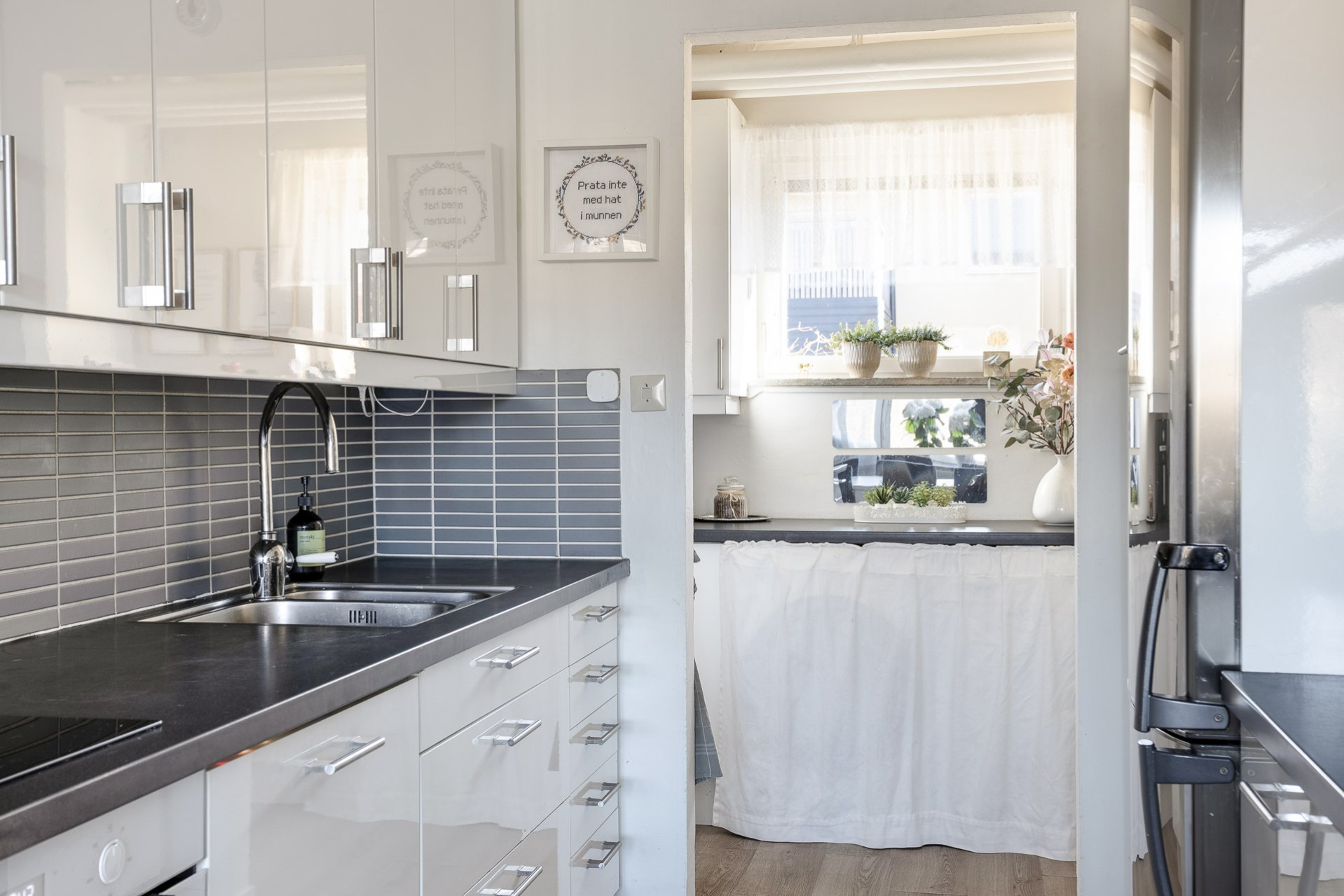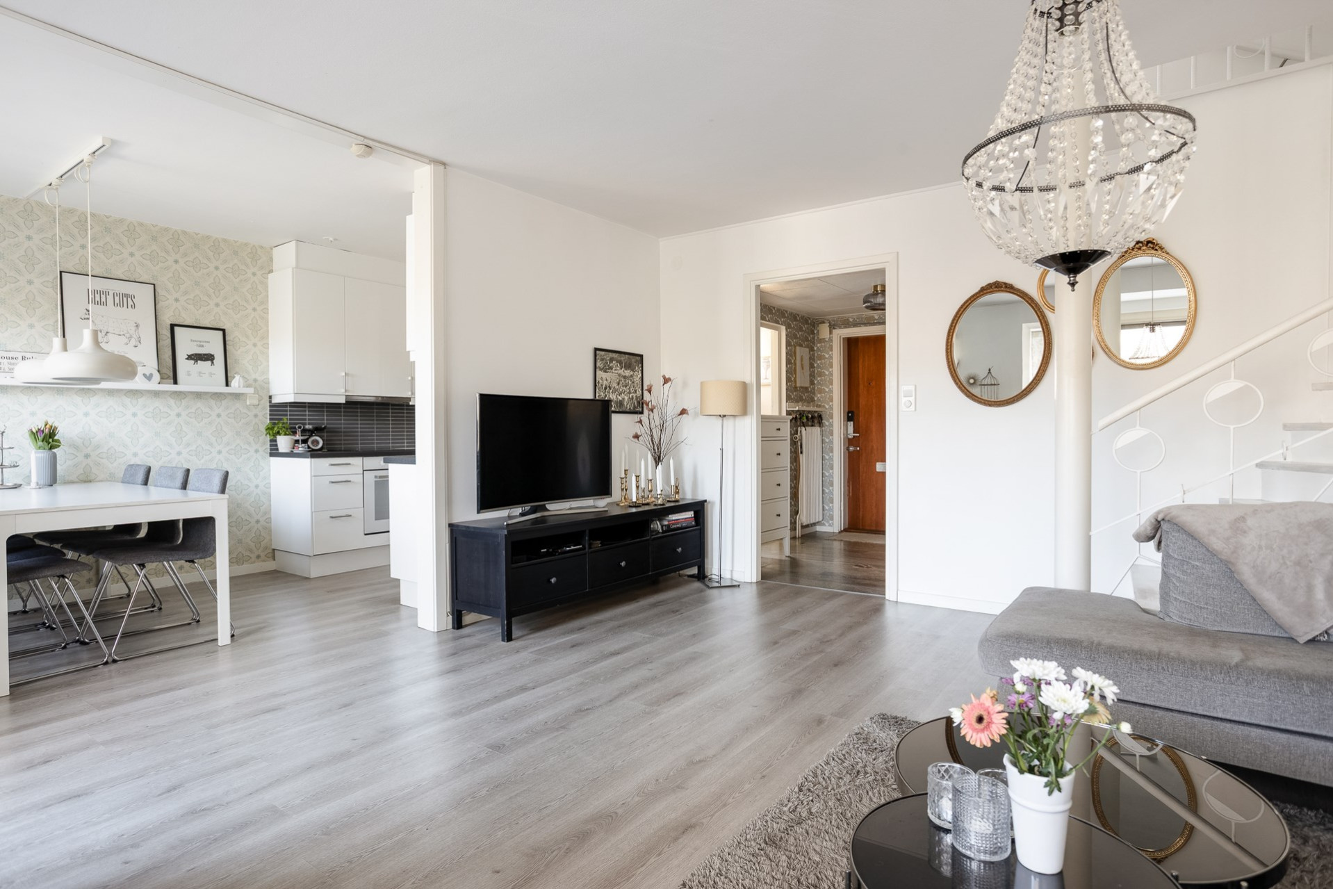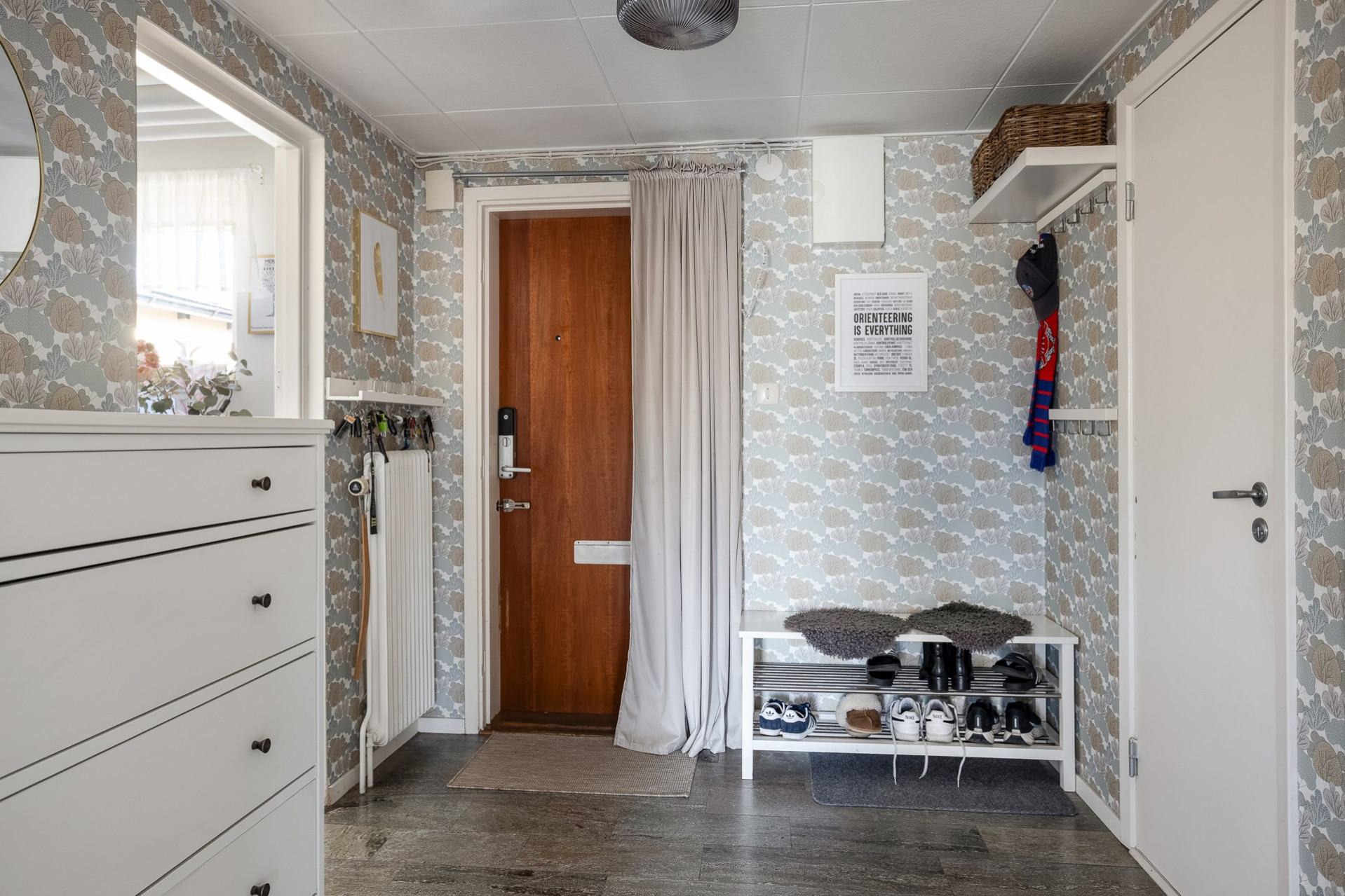 Vi välkomnas in till en stor och öppen hall med möjlighet till både förvaring och avhängning, dels via en klädkammare. I entrén ligger originalgolvet i sten kvar som är både praktiskt och snyggt. Gäst-wc nås från hallen med och hallen är öppen in till allrummet där de stora fönstren mot trädgården ger ett härligt ljusflöde till hela entréplanet. På entréplan kan hela familjen umgås i det generösa vardagsrummet som är byggt i öppen planlösning mot den rymliga matplatsen vid köket. Köket som sattes in 2008 och är från IKEA ligger i anslutning till vardagsrummet med matplatsen emellan. Maskinparken i köket består av: diskmaskin -25, kyl/frys -08, induktionshäll -15, ugn -23, fläkt -08. Intill köket finns grovköket med tvättmaskin från -25. Vi tar oss en trappa upp via den läckert utformade trappan i klassisk 60-talsstil! Väl uppe finns tre bra sovrum samt ett helkaklat duschrum som renoverades 2010. I hela bostaden ligger ett ljust och slittåligt golv som lades in -21.