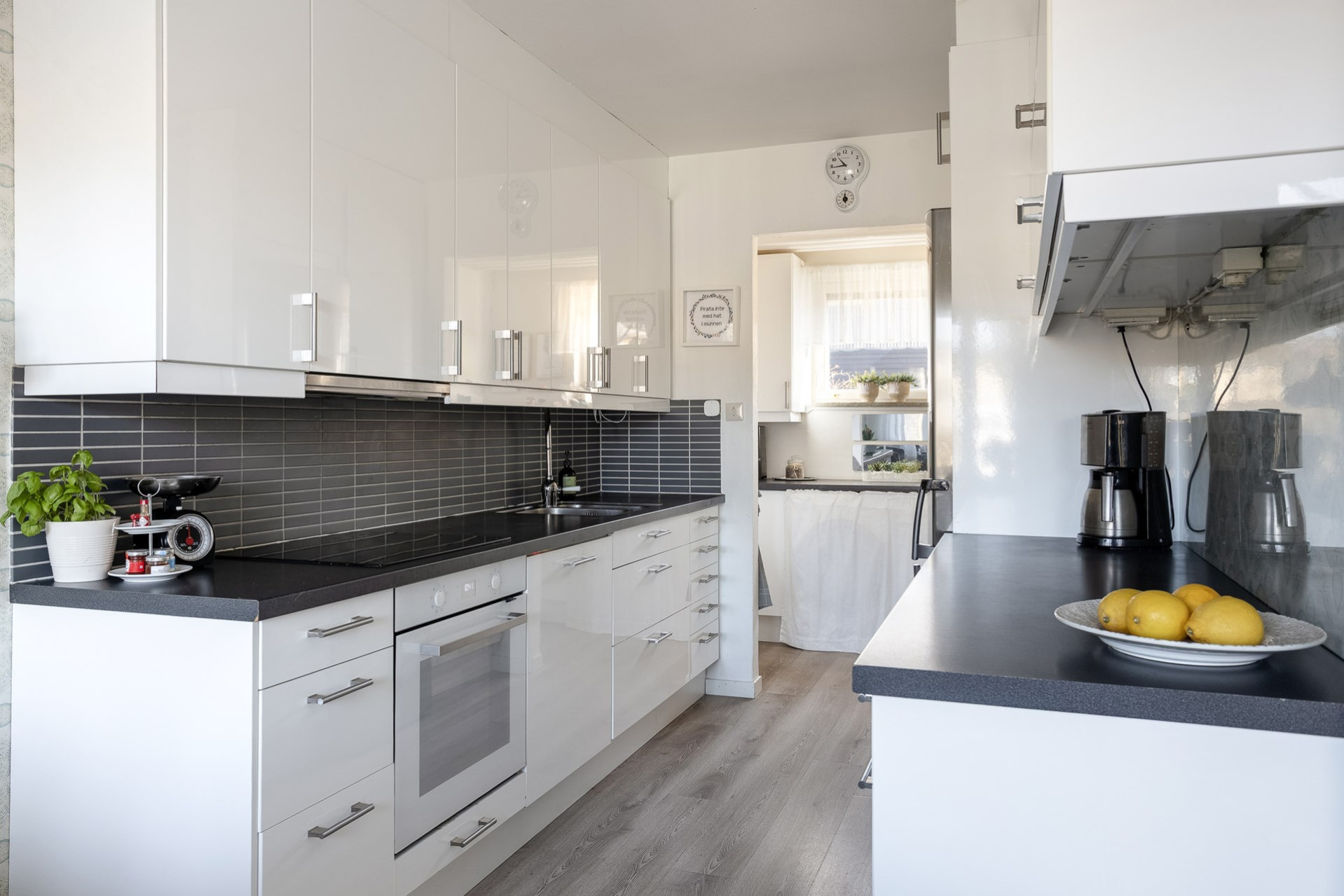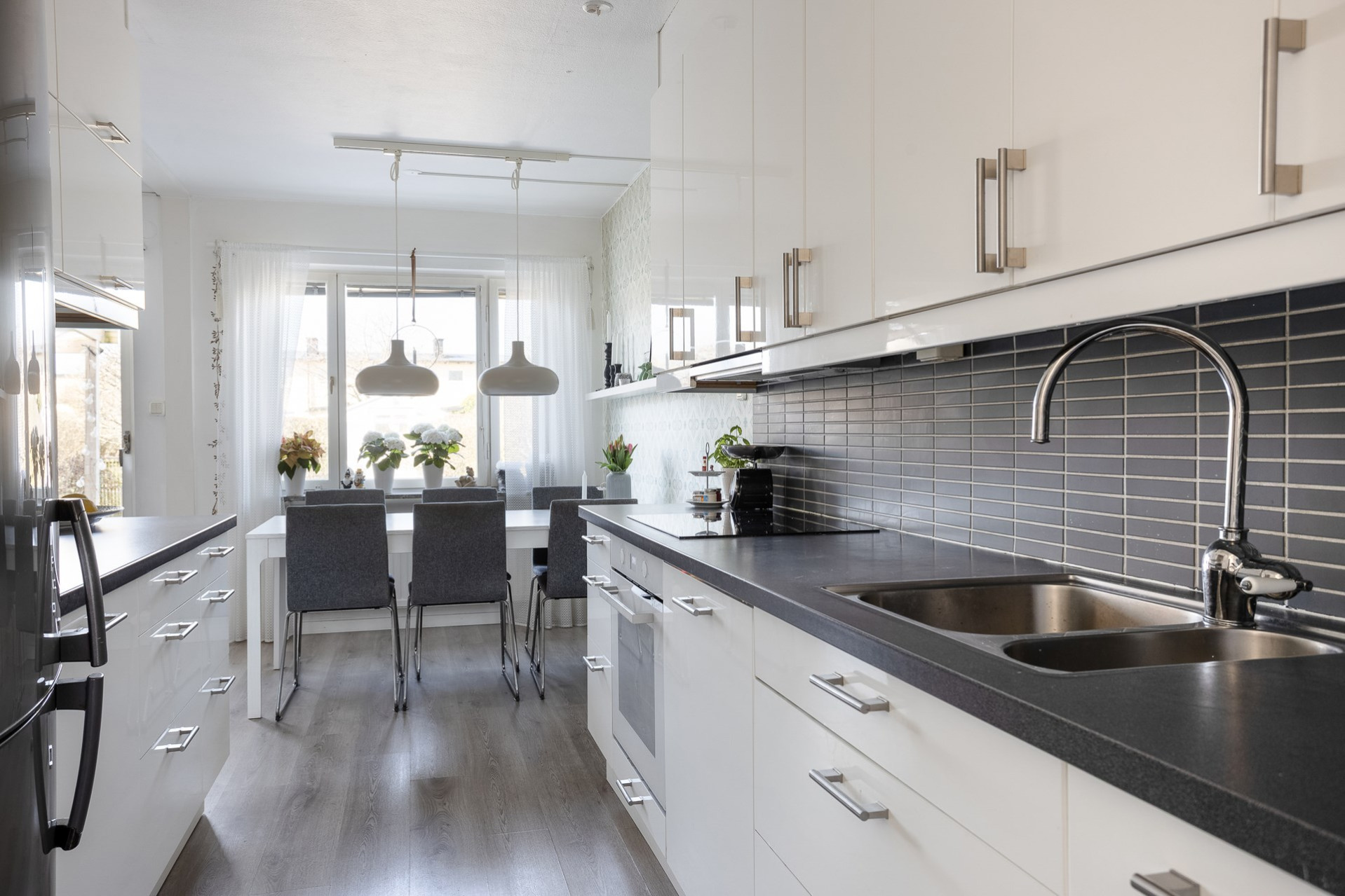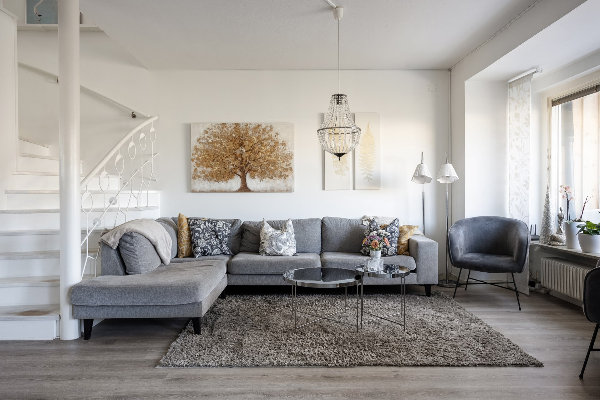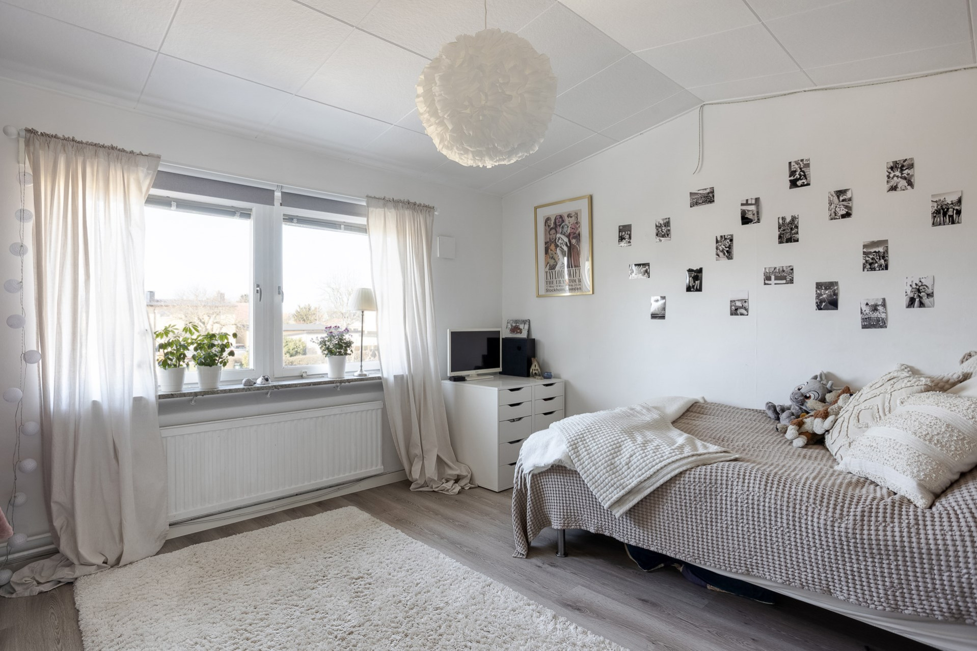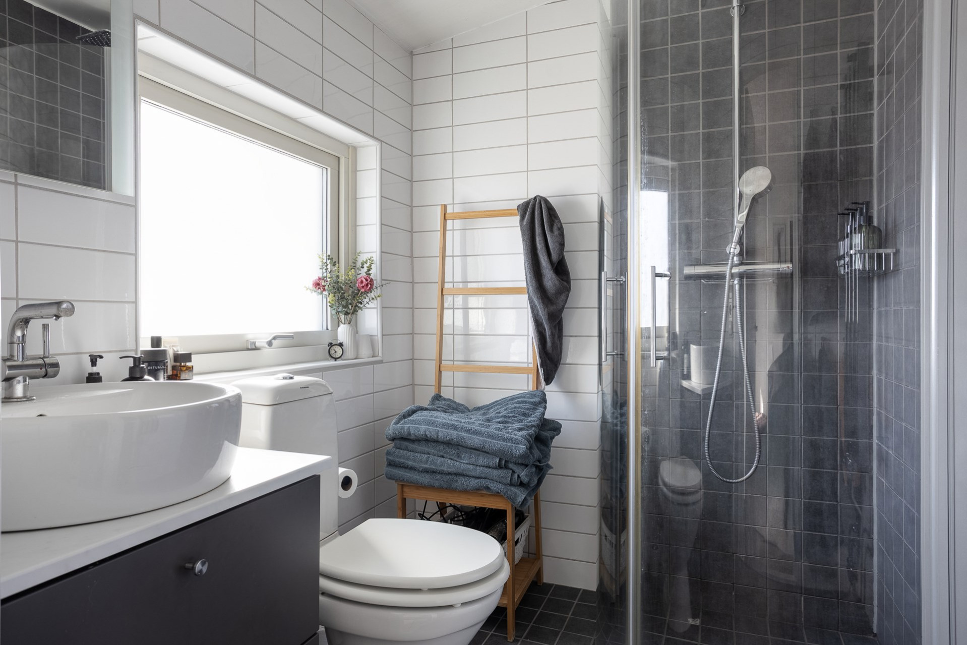 Vi välkomnas in till en stor och öppen hall med möjlighet till både förvaring och avhängning, dels via en klädkammare. I entrén ligger originalgolvet i sten kvar som är både praktiskt och snyggt. Gäst-wc nås från hallen med och hallen är öppen in till allrummet där de stora fönstren mot trädgården ger ett härligt ljusflöde till hela entréplanet. På entréplan kan hela familjen umgås i det generösa vardagsrummet som är byggt i öppen planlösning mot den rymliga matplatsen vid köket. Köket som sattes in 2008 och är från IKEA ligger i anslutning till vardagsrummet med matplatsen emellan. Maskinparken i köket består av: diskmaskin -25, kyl/frys -08, induktionshäll -15, ugn -23, fläkt -08. Intill köket finns grovköket med tvättmaskin från -25. Vi tar oss en trappa upp via den läckert utformade trappan i klassisk 60-talsstil! Väl uppe finns tre bra sovrum samt ett helkaklat duschrum som renoverades 2010. I hela bostaden ligger ett ljust och slittåligt golv som lades in -21.