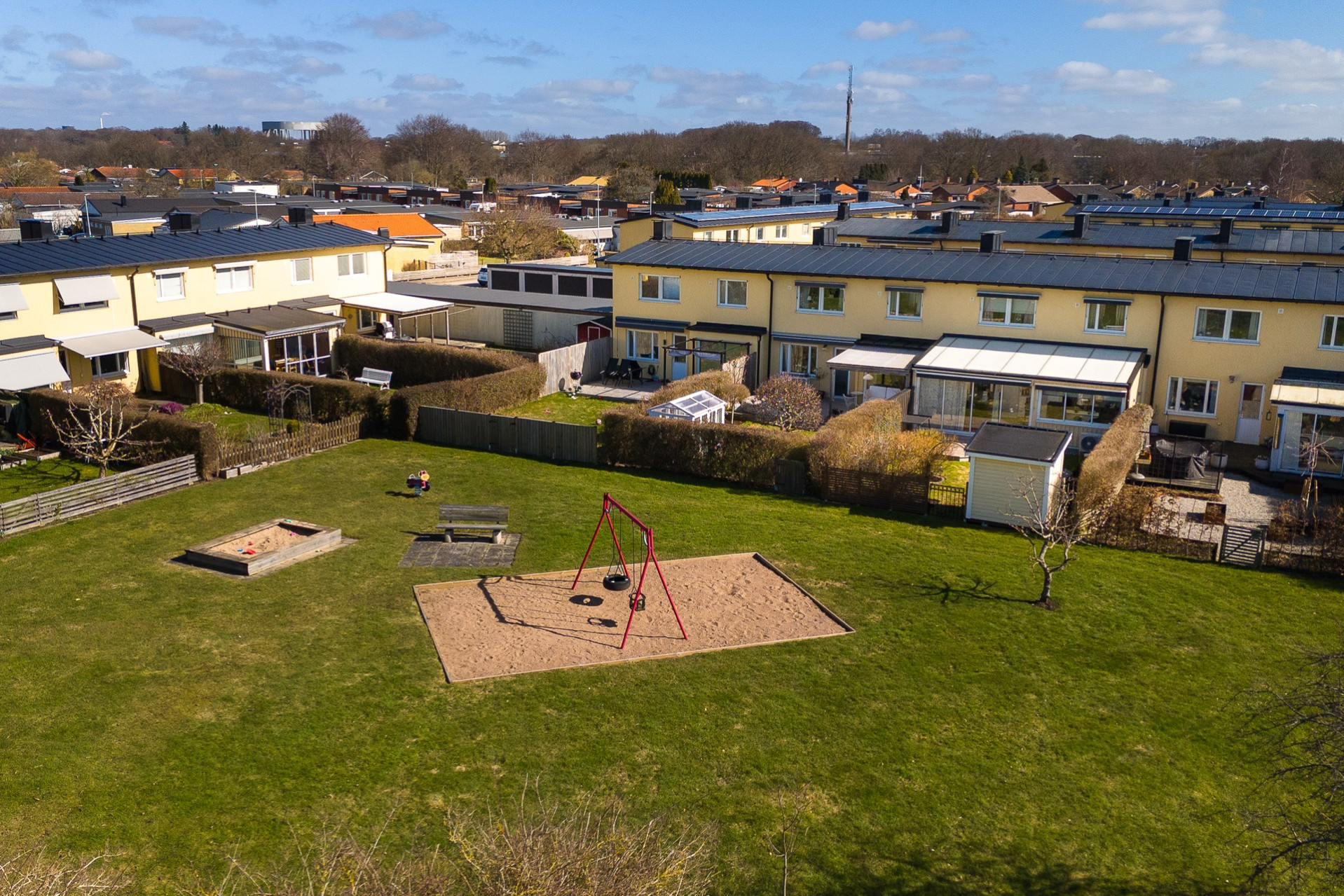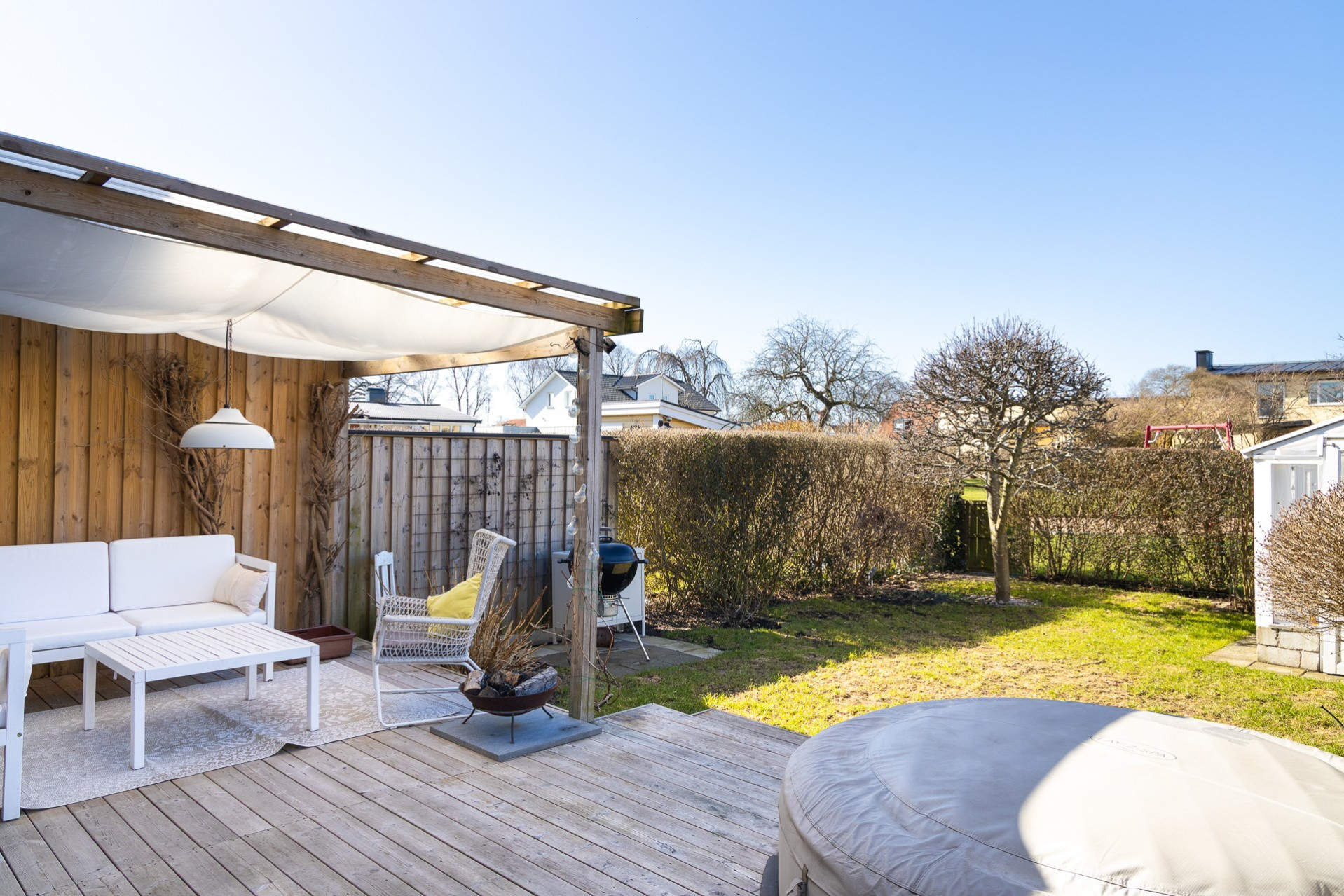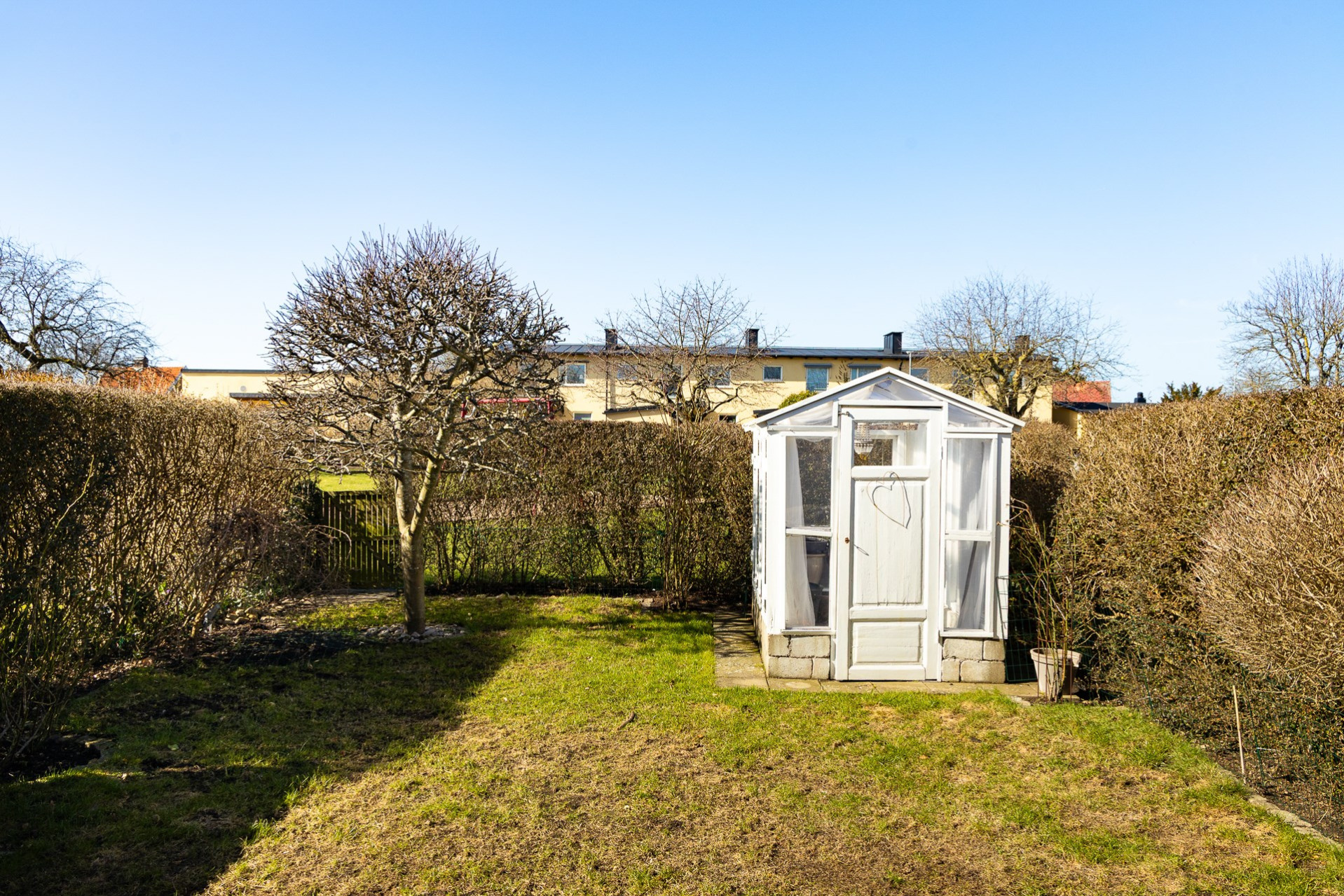 Trädgården ligger i perfekt och soligt västerläge och nås från vardagsrummet, här har man valt att bygga ett stort trädäck närmst huset -21 och resterande del är en lättskött grästäppa med diverse buskar som avgränsning ut mot föreningens gemensamma gård med välskött gräsmatta och lekplats. Ett mindre växthus byggdes -17 där man med gröna fingrar kan odla smått o gott.