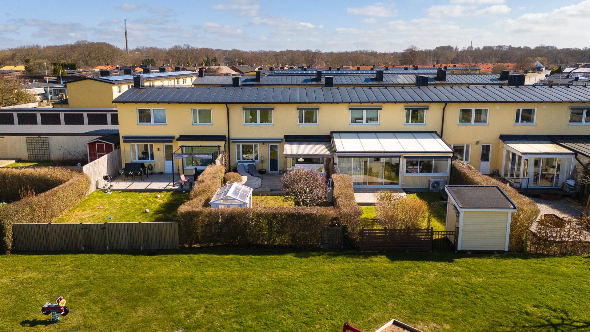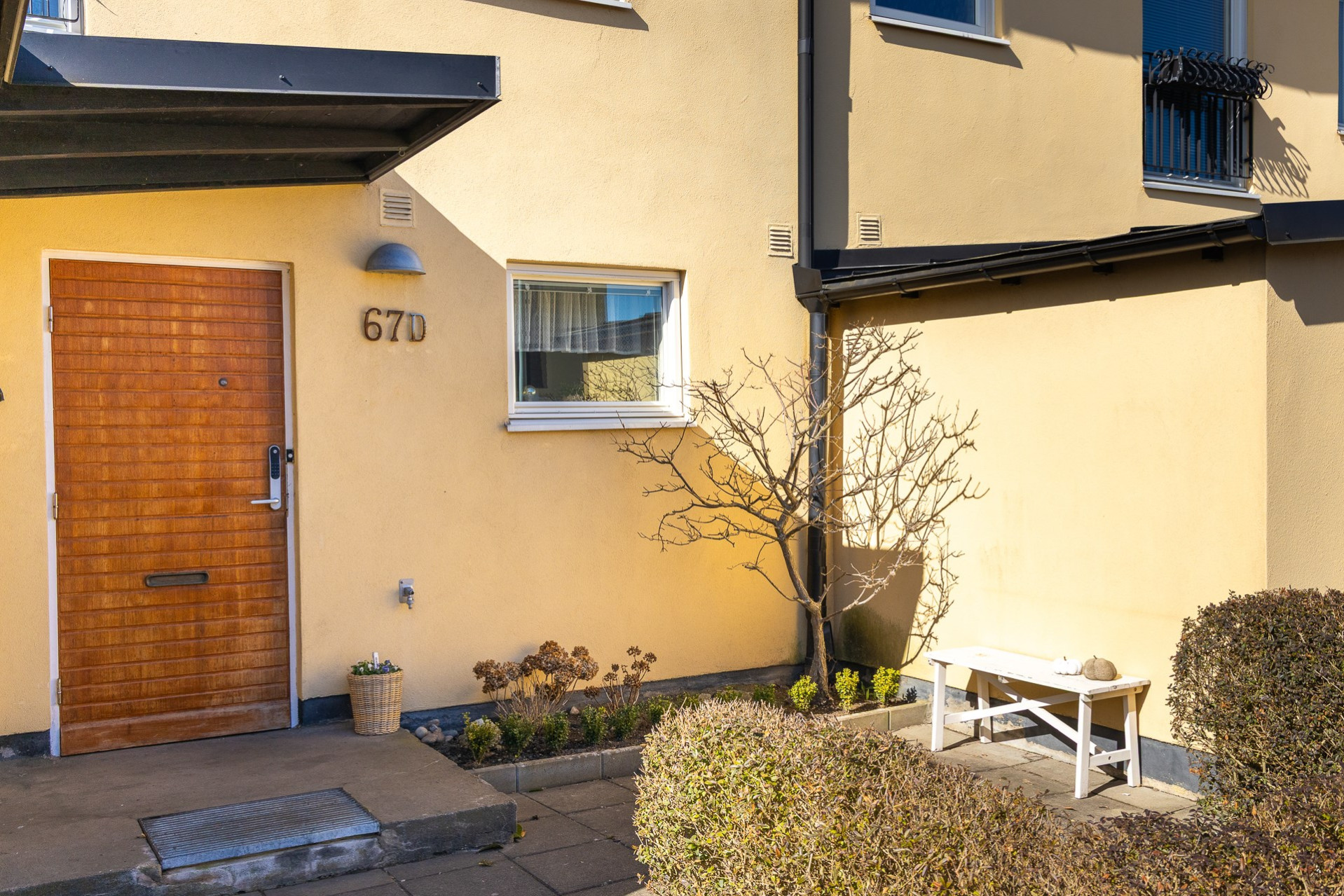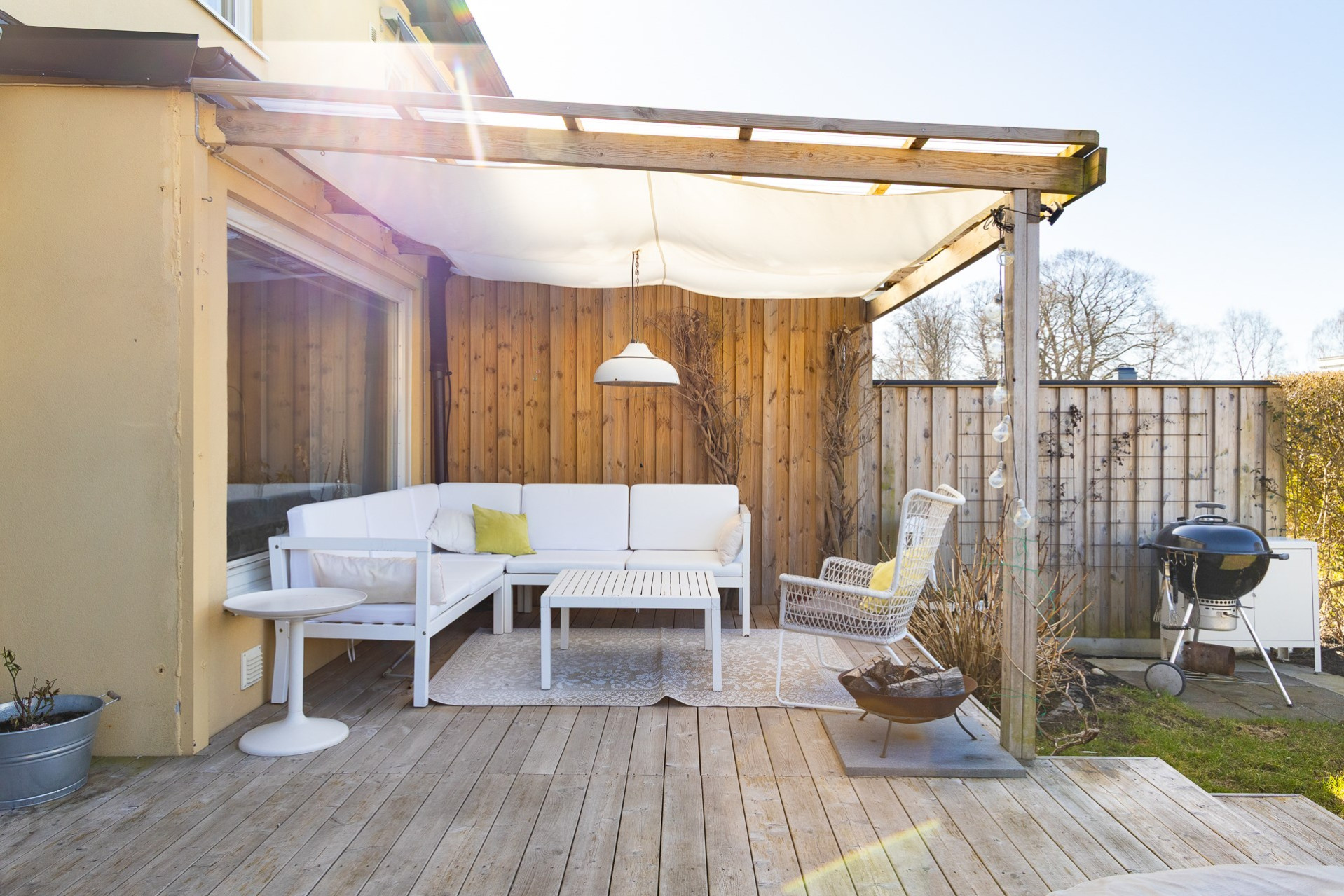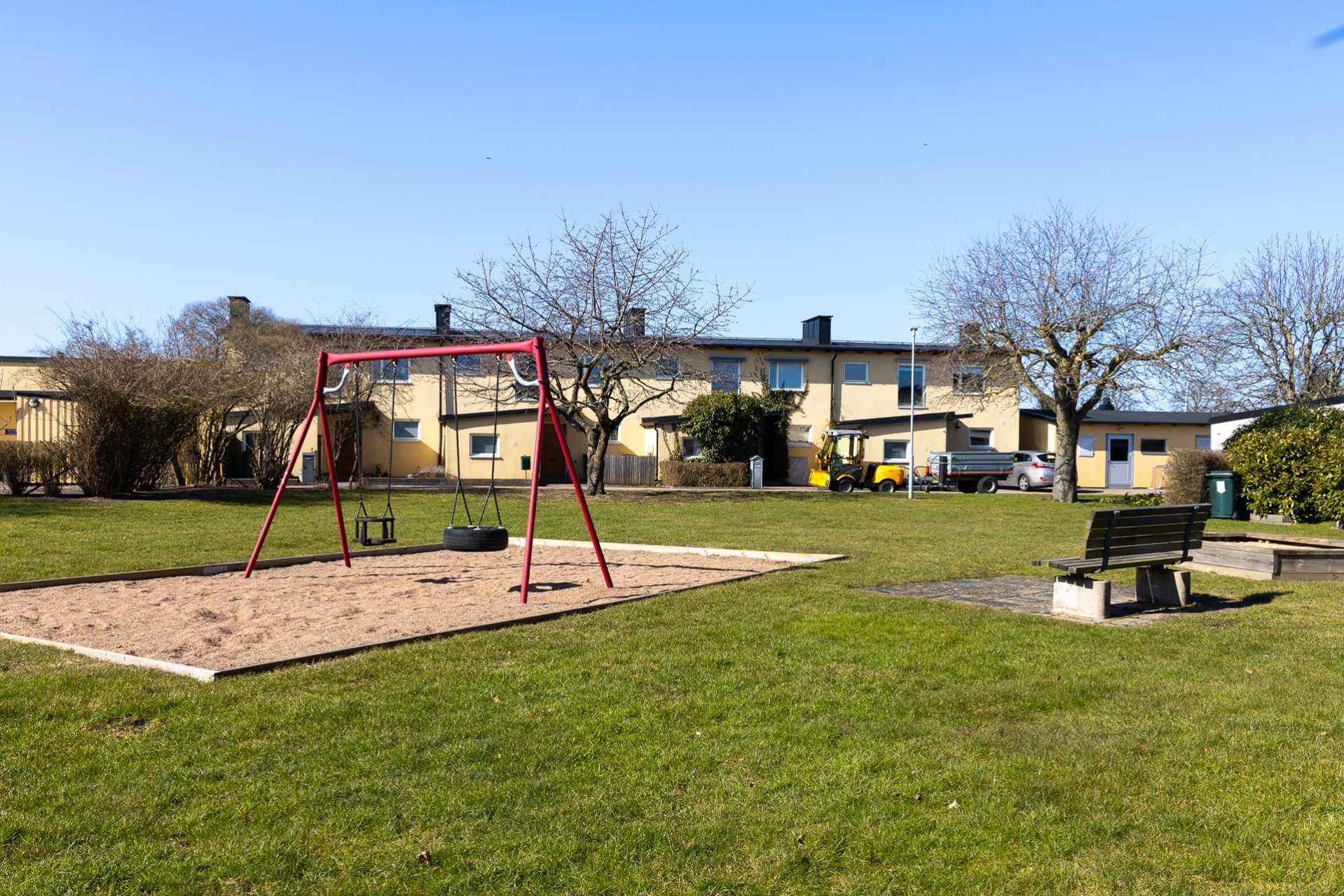 Trädgården ligger i perfekt och soligt västerläge och nås från vardagsrummet, här har man valt att bygga ett stort trädäck närmst huset -21 och resterande del är en lättskött grästäppa med diverse buskar som avgränsning ut mot föreningens gemensamma gård med välskött gräsmatta och lekplats. Ett mindre växthus byggdes -17 där man med gröna fingrar kan odla smått o gott.