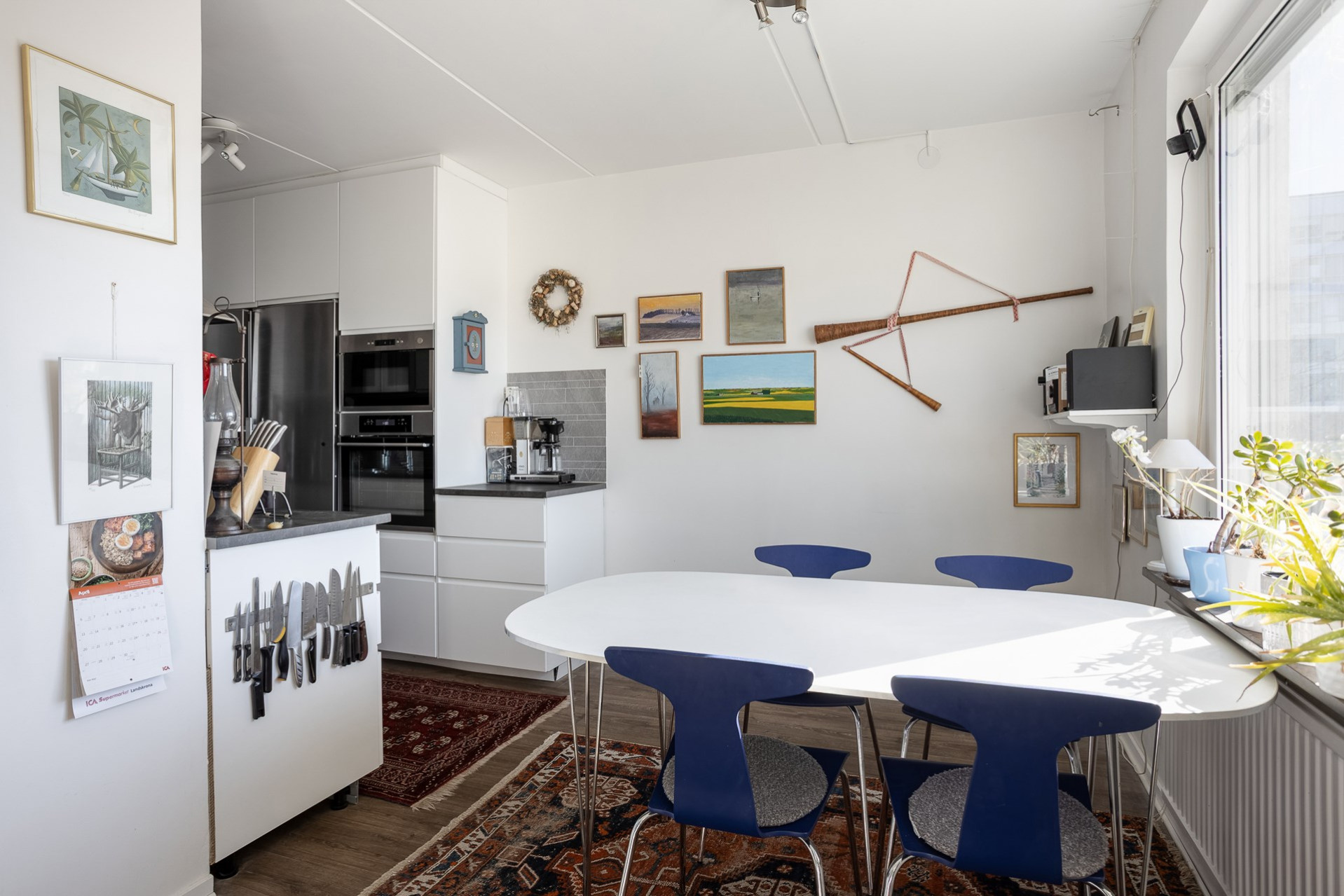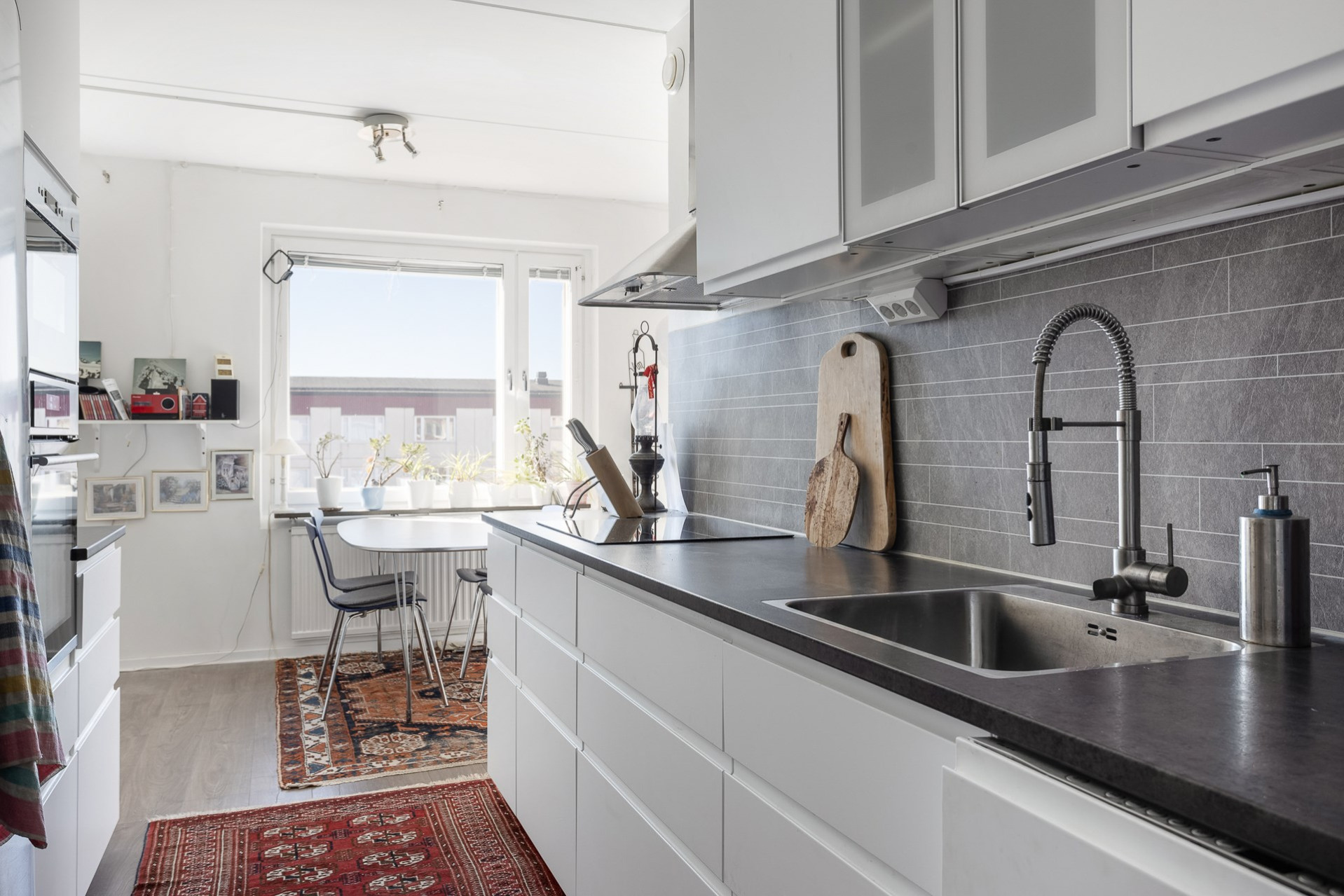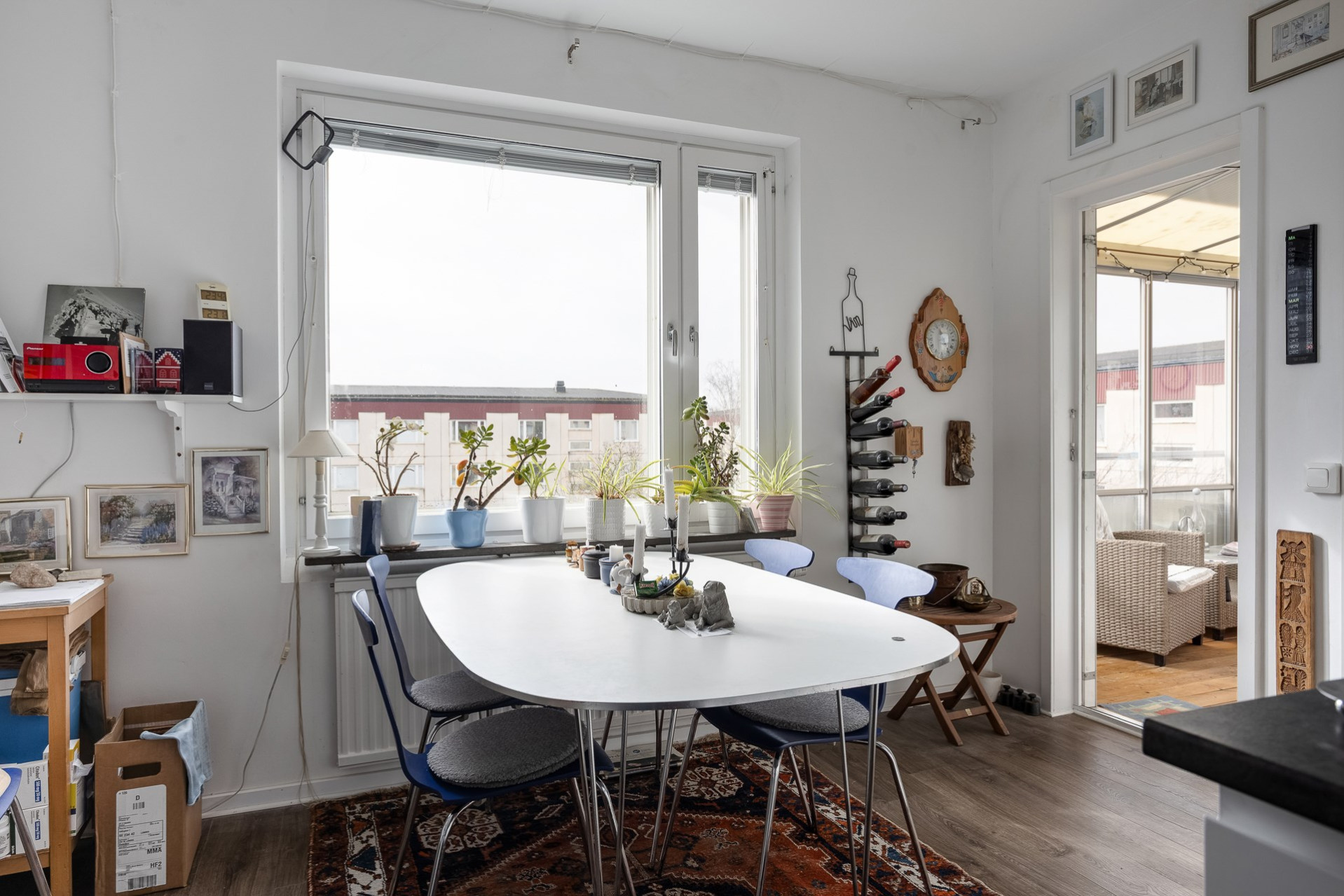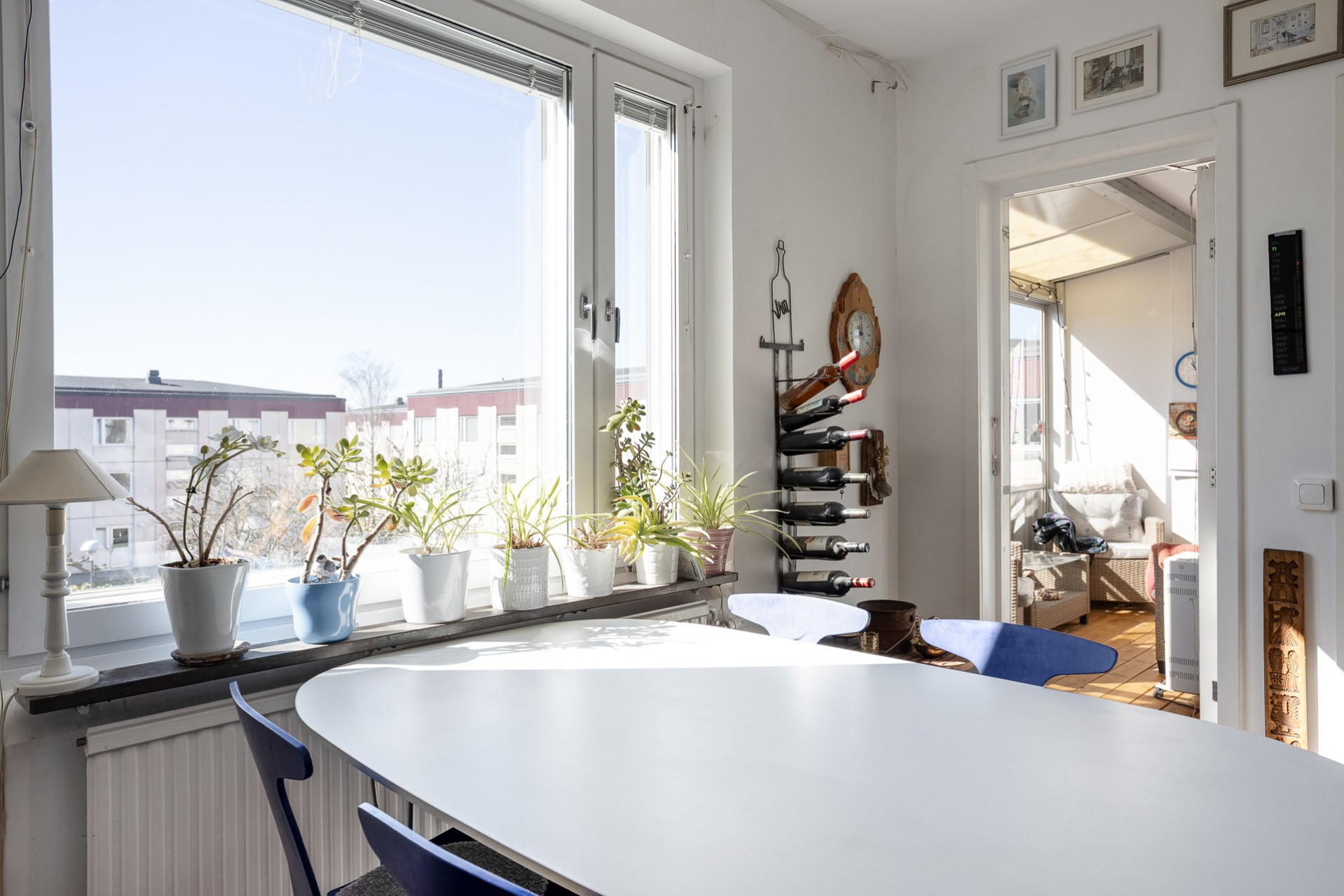 Ett modernt kök som erbjuder både goda förvaringsmöjligheter i skåp och lådor samt god arbetsyta. Köket är utrustat med kyl & frys, diskmaskin, spisugn och spisfläkt. Matplats för 6 personer vid fönstret. Från köket når man även den uppskattade och inglasade balkongen med utsikt över den fina innergården. Balkongen blir en naturlig förlängning av bostaden.