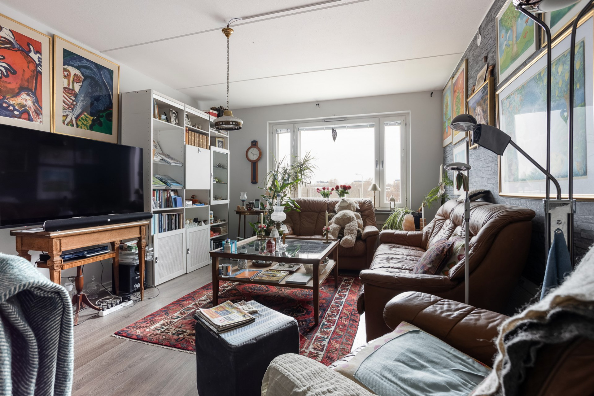 Rymligt vardagsrum med plats för både soffgrupp och matbord. Stora fönsterpartier som släpper in rikligt med ljus. Laminatgolv och ljusa väggar.