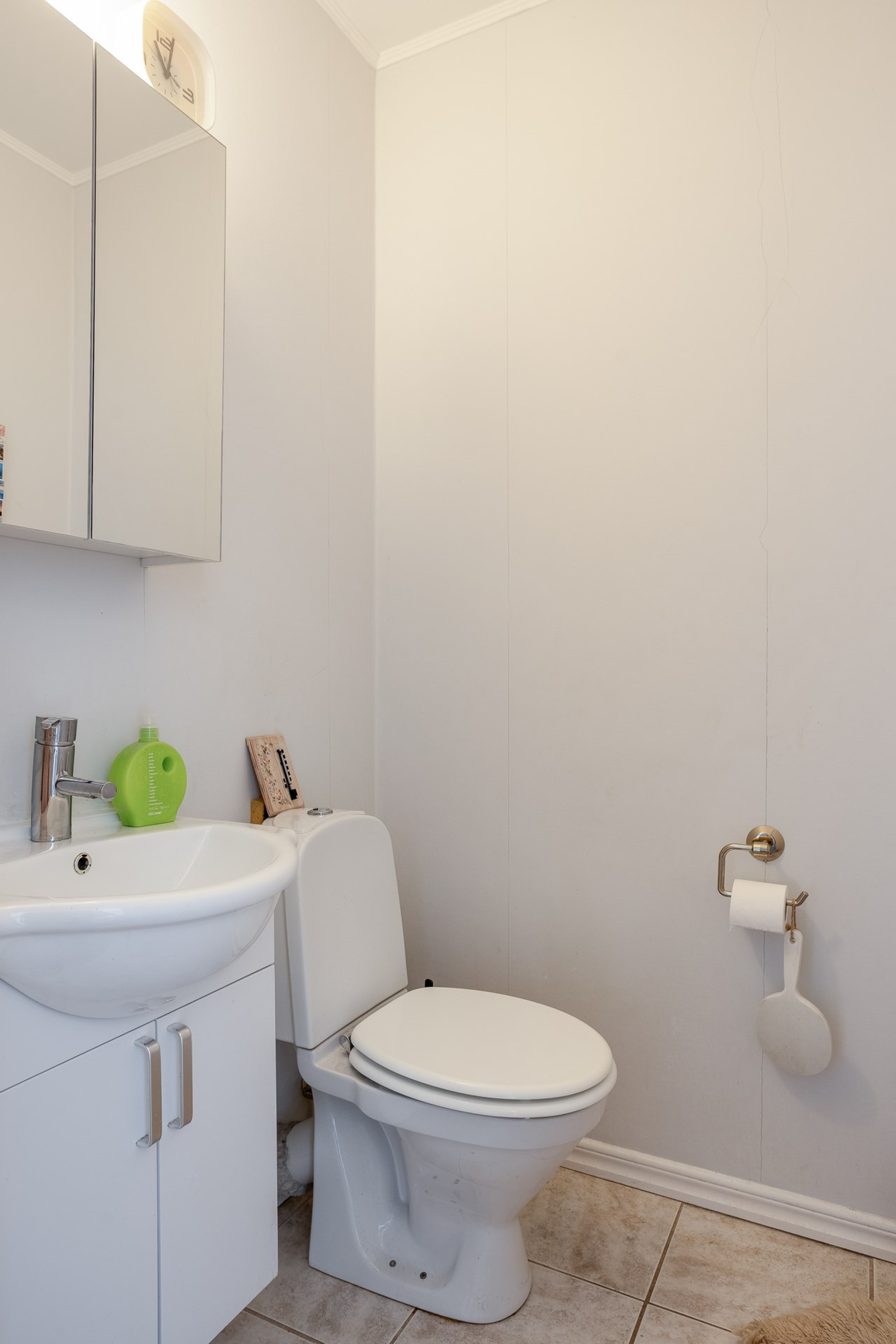 En praktisk gäst-wc med vask och kommod undertill samt spegelskåp som erbjuder förvaring. Ljusa väggar och ljust klinker på golvet.