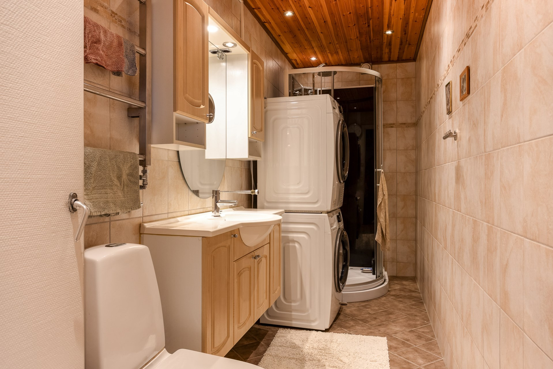 Generöst och helkaklat badrum utrustat med duschkabin, vask med kommod undertill samt spegelskåp som erbjuder förvaring, wc samt tvättmaskin och torktumlare för extra komfort. Spotlights i taket.