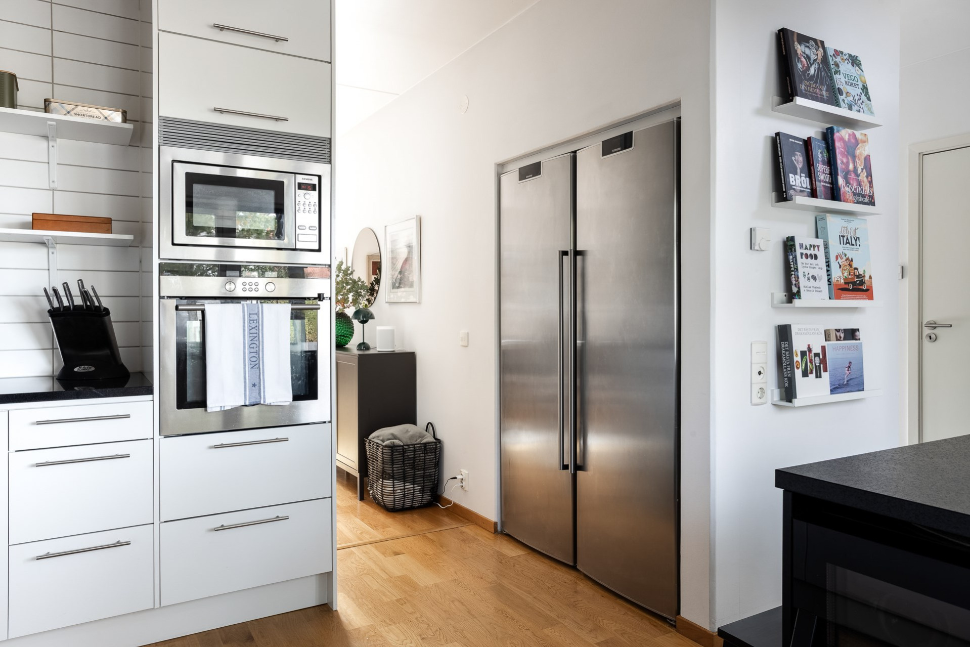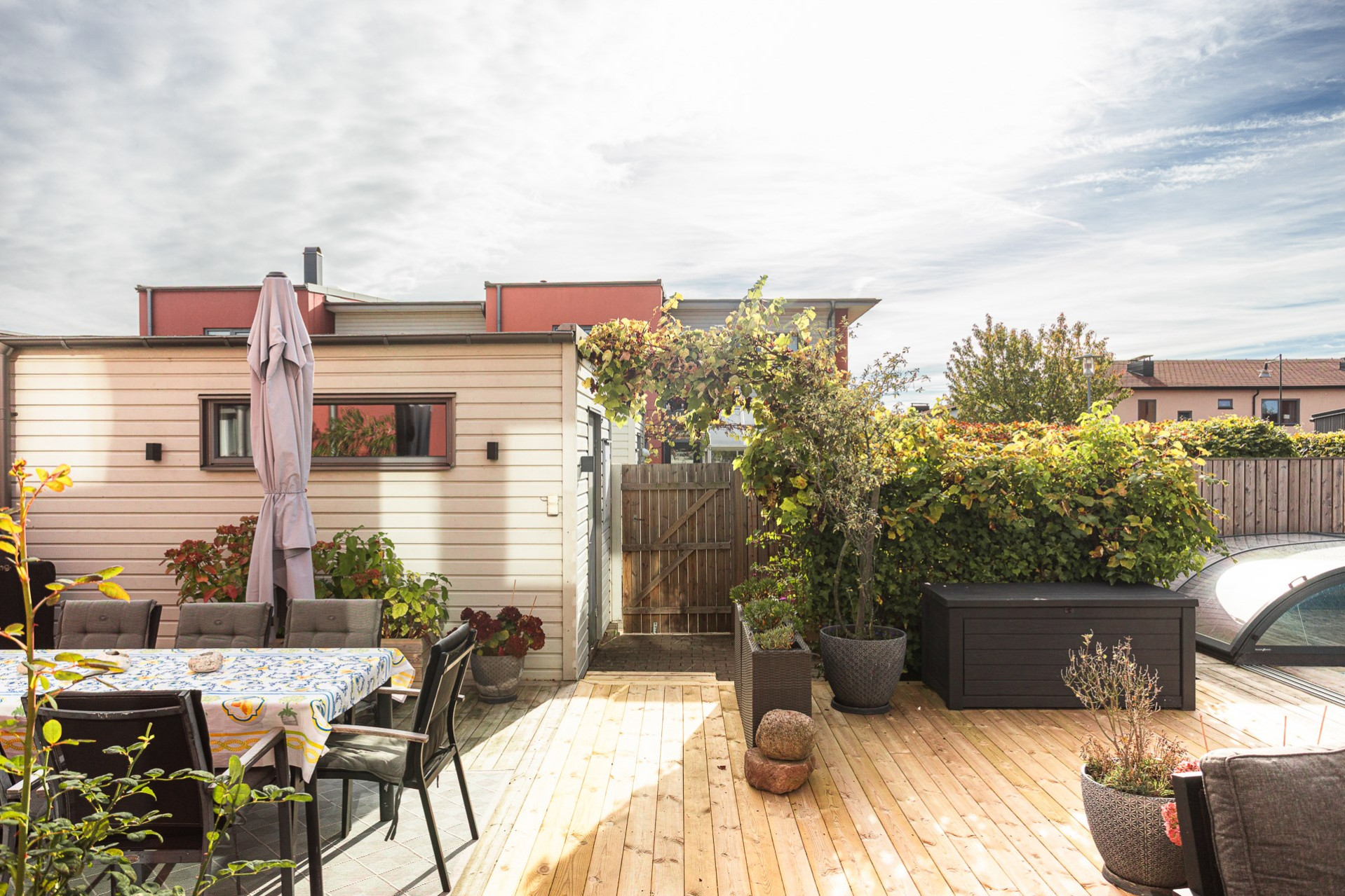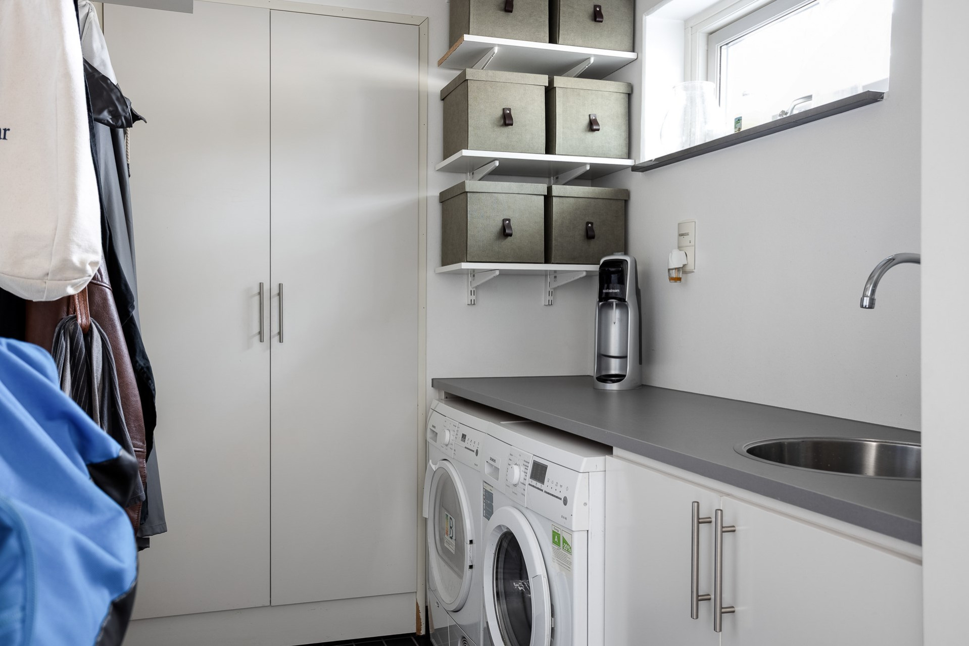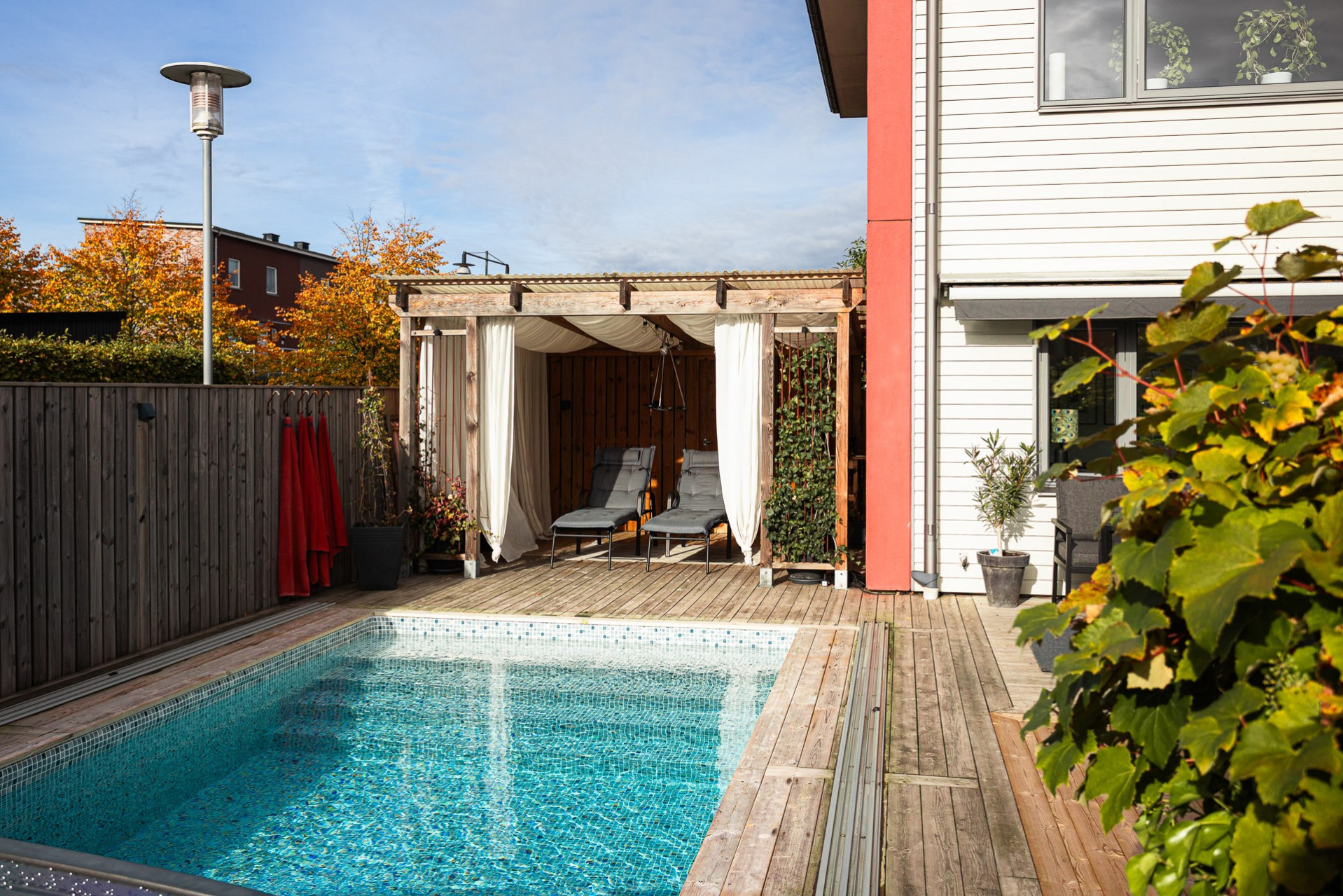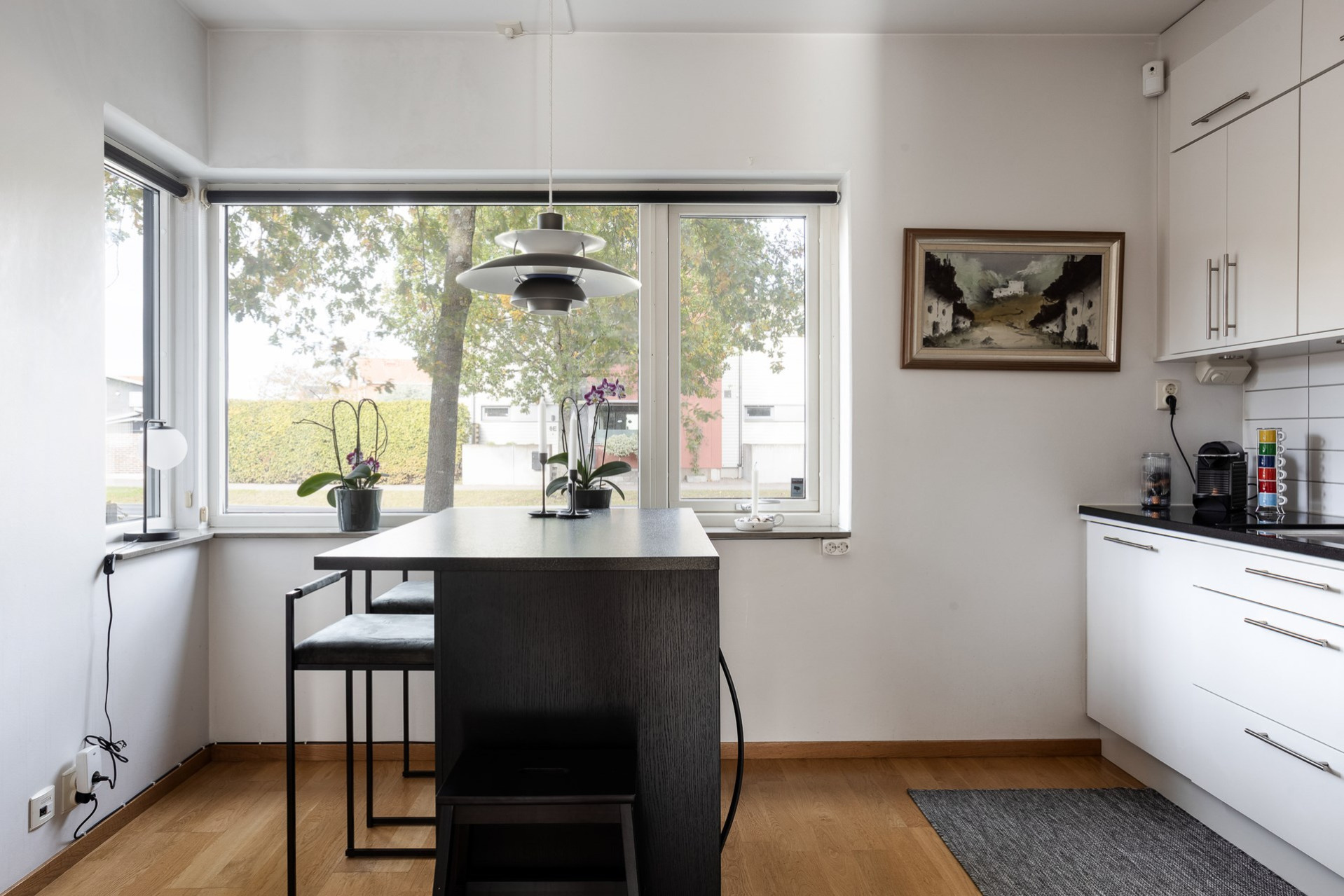 Hall med klinkergolv, gott om avhängning samt förvaring via passage mot duschrummet. Helkaklat snyggt duschrum med fönster. Tvättstuga/grovkök med tvättho samt tvättmaskin och torktumlare. Klinkergolv. L-format Myresjökök som går i vitt med svart granitskiva. Rostfri maskinpark från Siemens med kyl och frys i fullhöjd, inbyggnadsugn, inbyggnadsmicro, 90 cm bred induktionshäll, diskmaskin från -21 och fläkt. Köksö med vinkyl sattes in -21. Matsal/allrum som är ljust med stora glaspartier mot trädgården. Går att dela av till sovrum om så önskas. Från allrummet nås den fantastiska trädgården som är en lättskött oas med stor pool. Eftersom trädgården ligger i söderläge har man sol merparten av dagen samt kvällen.