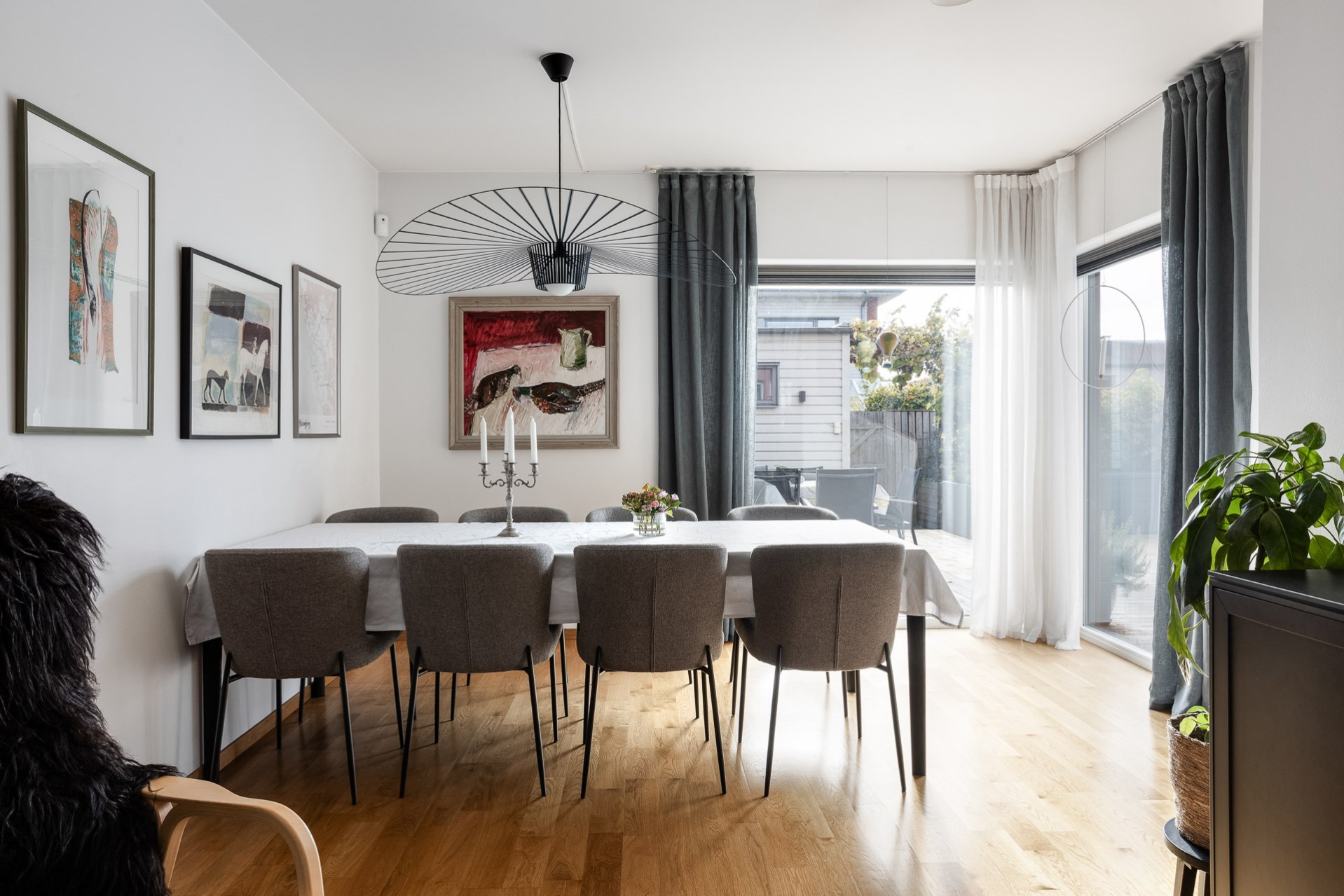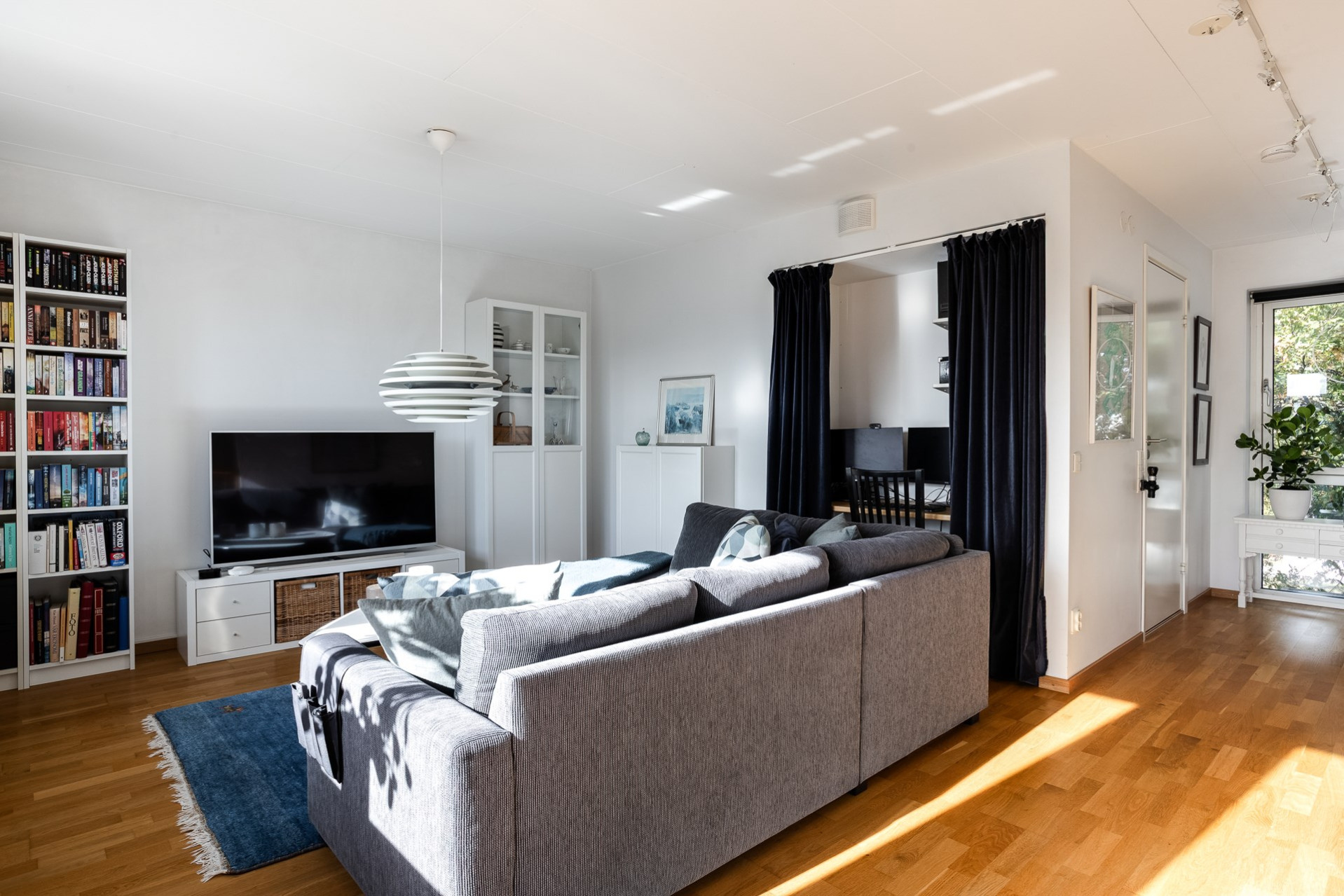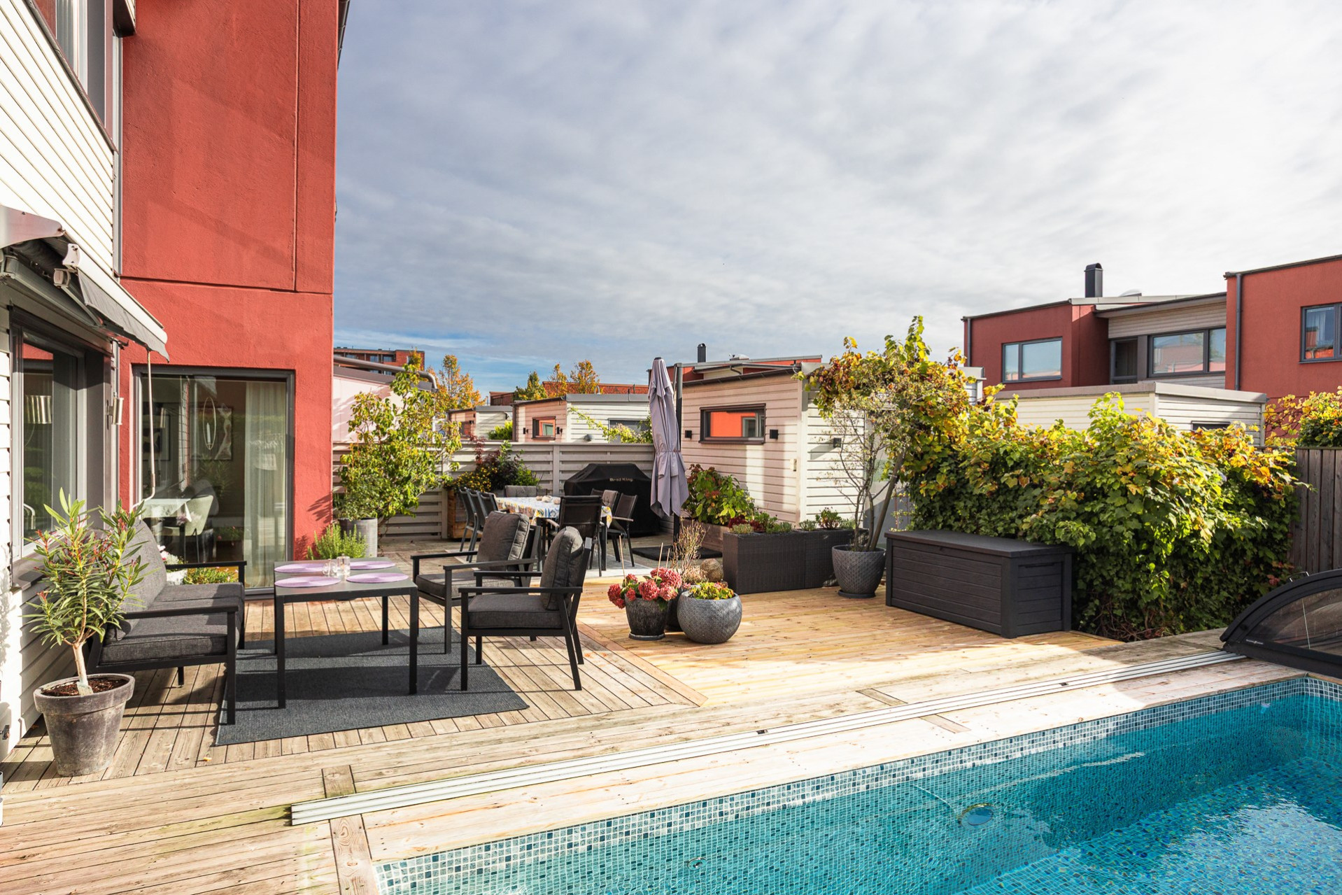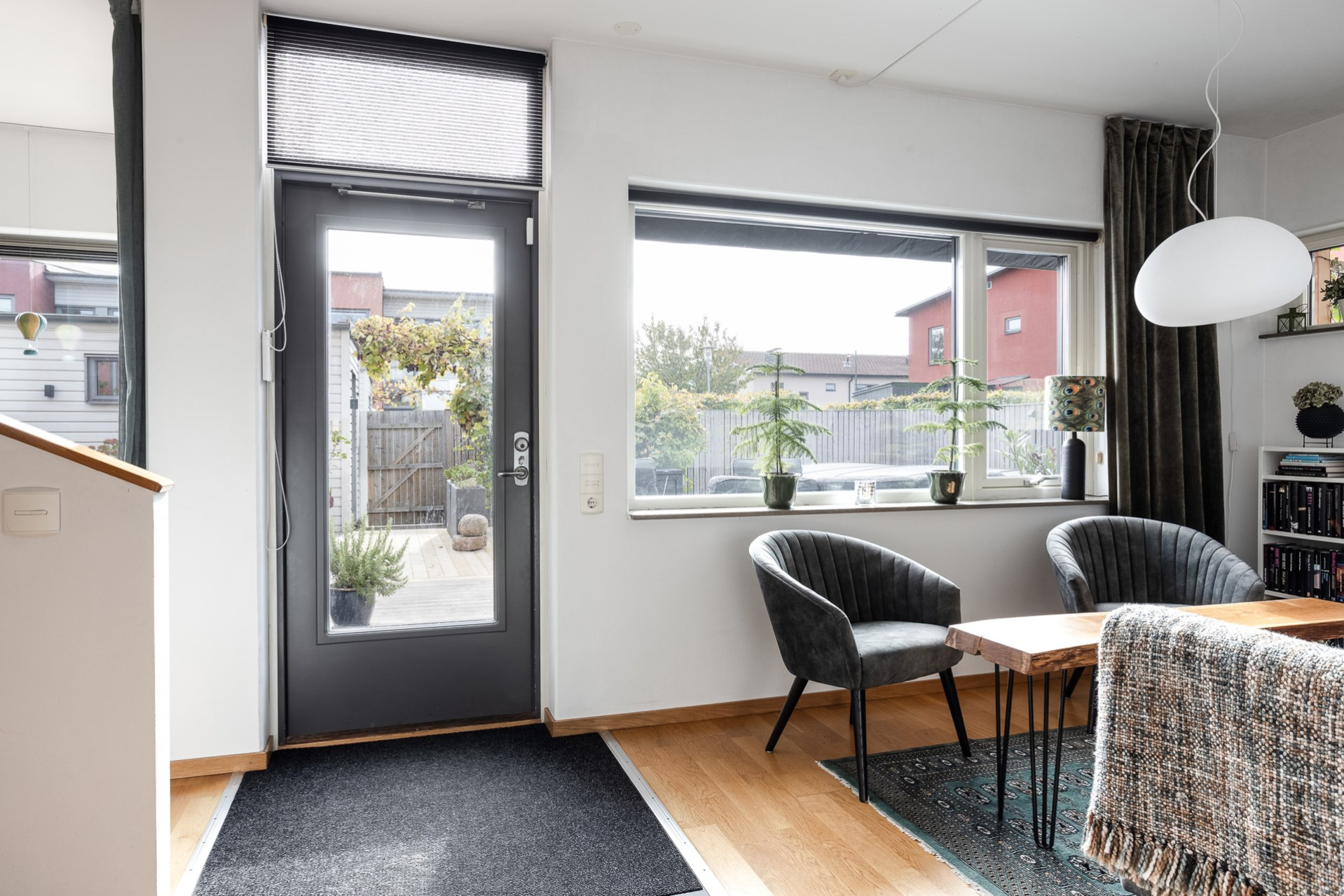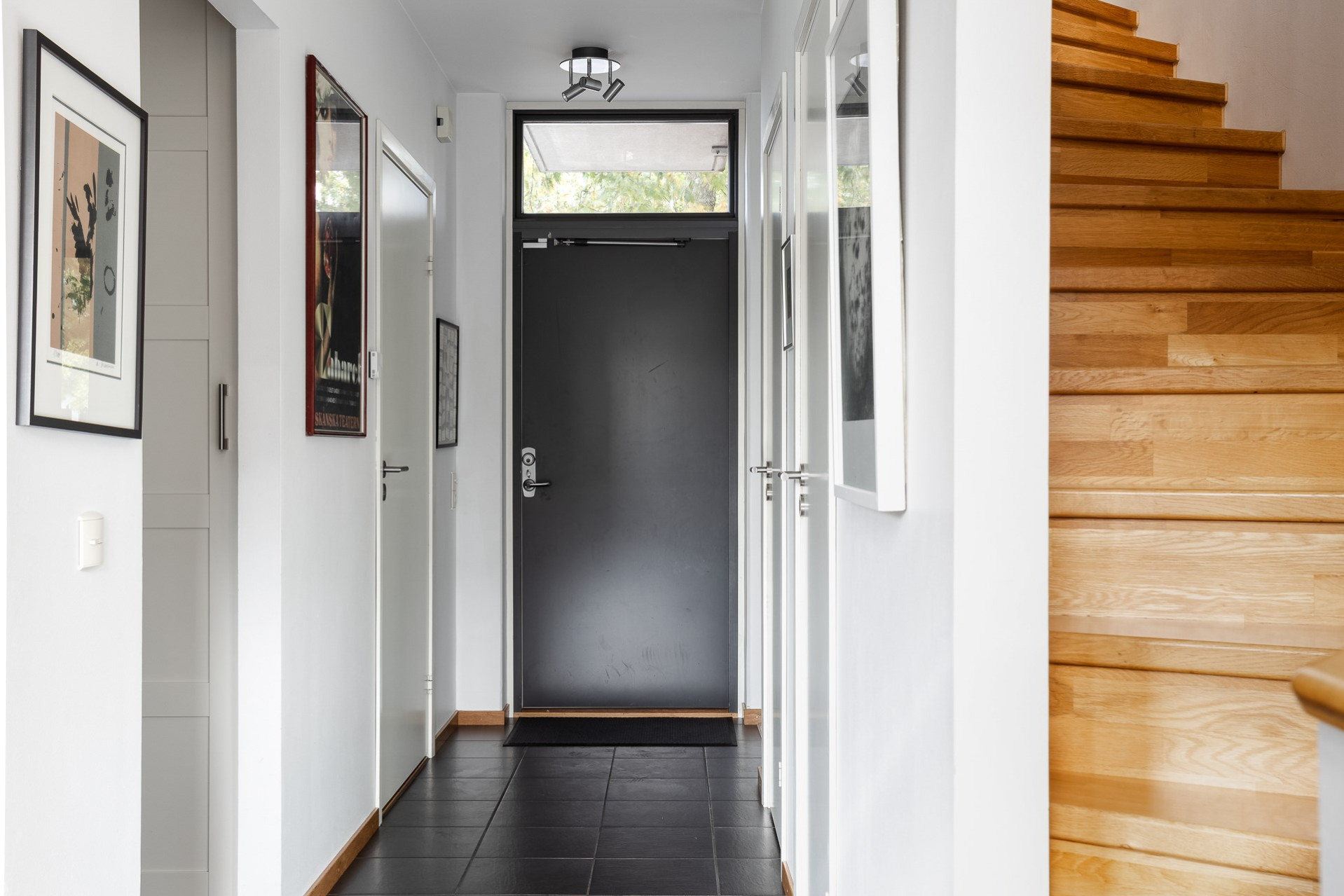 Hall med klinkergolv, gott om avhängning samt förvaring via passage mot duschrummet. Helkaklat snyggt duschrum med fönster. Tvättstuga/grovkök med tvättho samt tvättmaskin och torktumlare. Klinkergolv. L-format Myresjökök som går i vitt med svart granitskiva. Rostfri maskinpark från Siemens med kyl och frys i fullhöjd, inbyggnadsugn, inbyggnadsmicro, 90 cm bred induktionshäll, diskmaskin från -21 och fläkt. Köksö med vinkyl sattes in -21. Matsal/allrum som är ljust med stora glaspartier mot trädgården. Går att dela av till sovrum om så önskas. Från allrummet nås den fantastiska trädgården som är en lättskött oas med stor pool. Eftersom trädgården ligger i söderläge har man sol merparten av dagen samt kvällen.