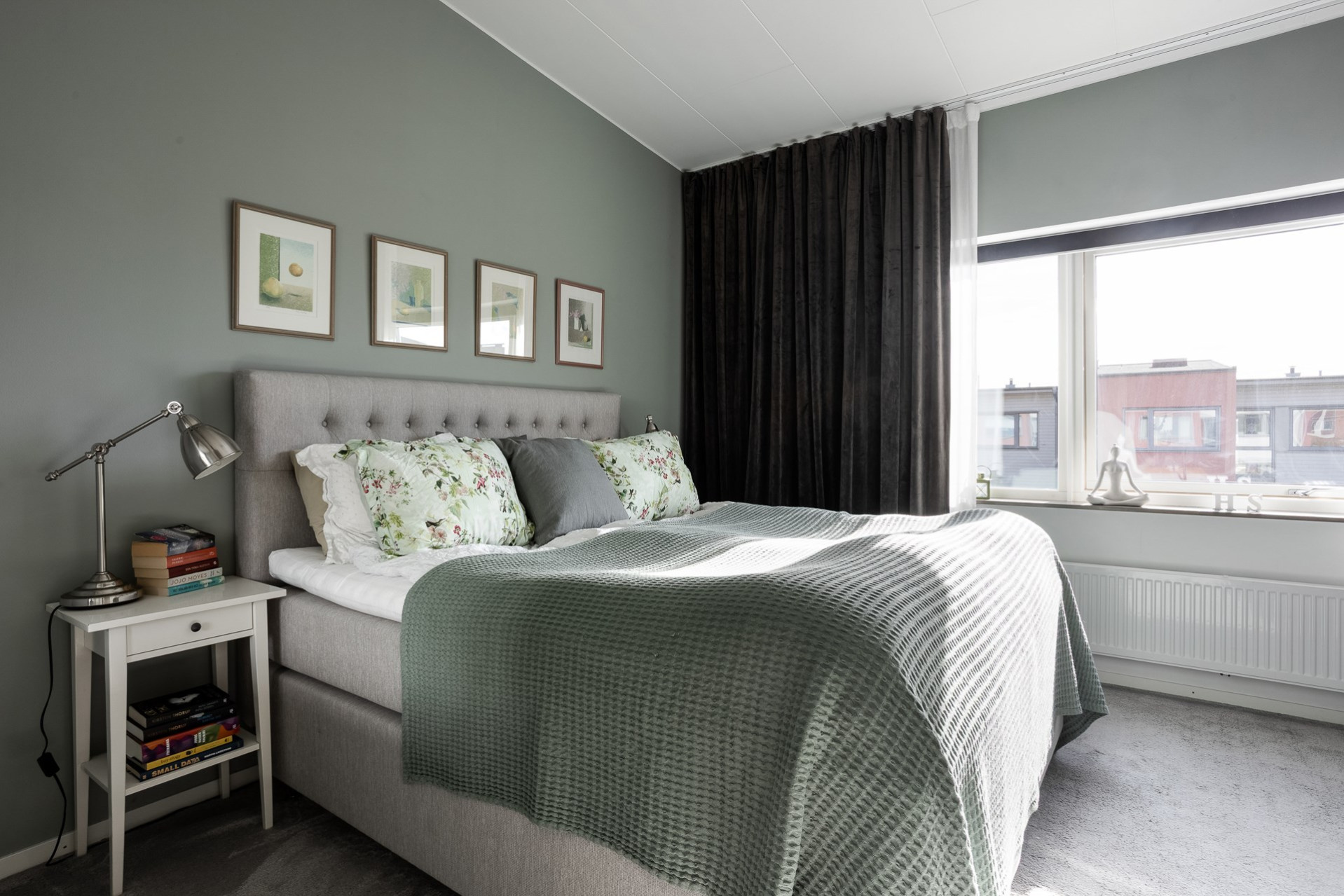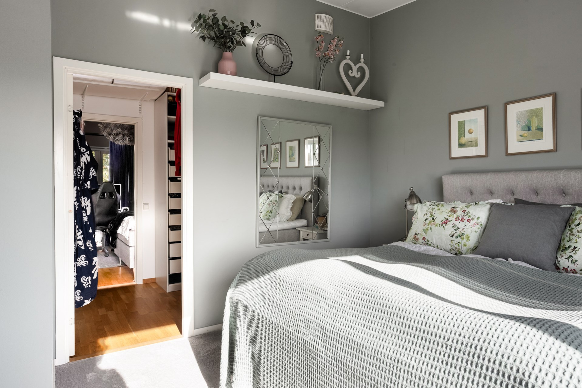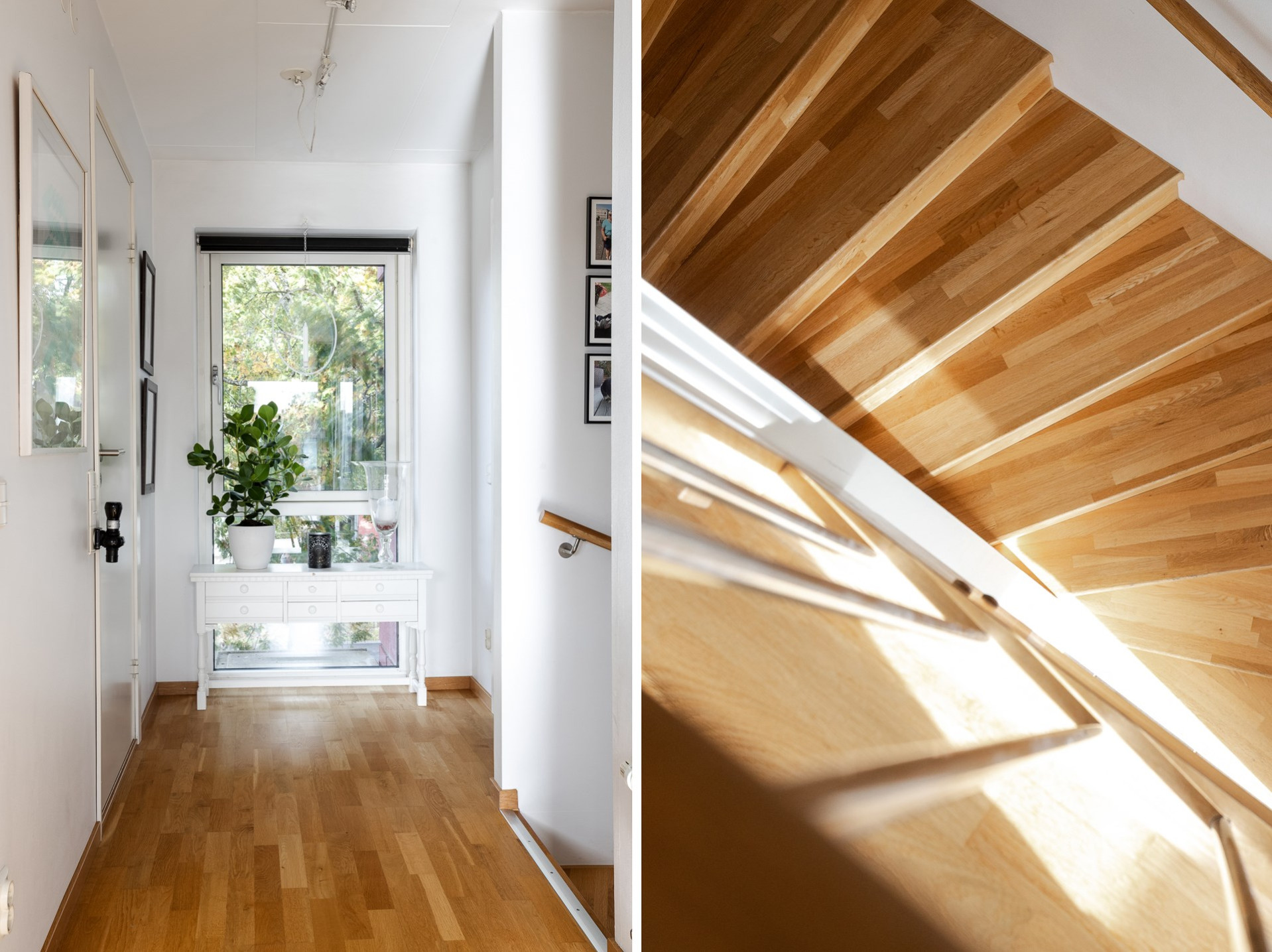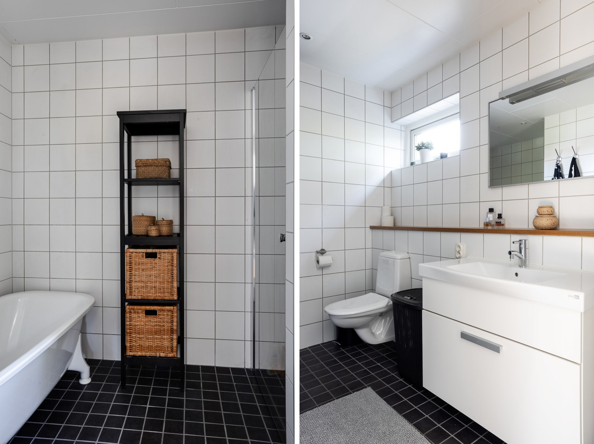 Väl uppe för trappan kommer vi till ett allrum (som lätt delas av till ett sovrum) två sovrum samt ett badrum. Sovrummen är i snarlik storlek samt med gemensam och rymlig klädkammare. Det ligger ekparkett i alla rum. Badrummet på ovanvåningen är helkaklat och innehåller både badkar och duschhörna. Vardagslyx och väldigt praktiskt. Ett fönster även här.