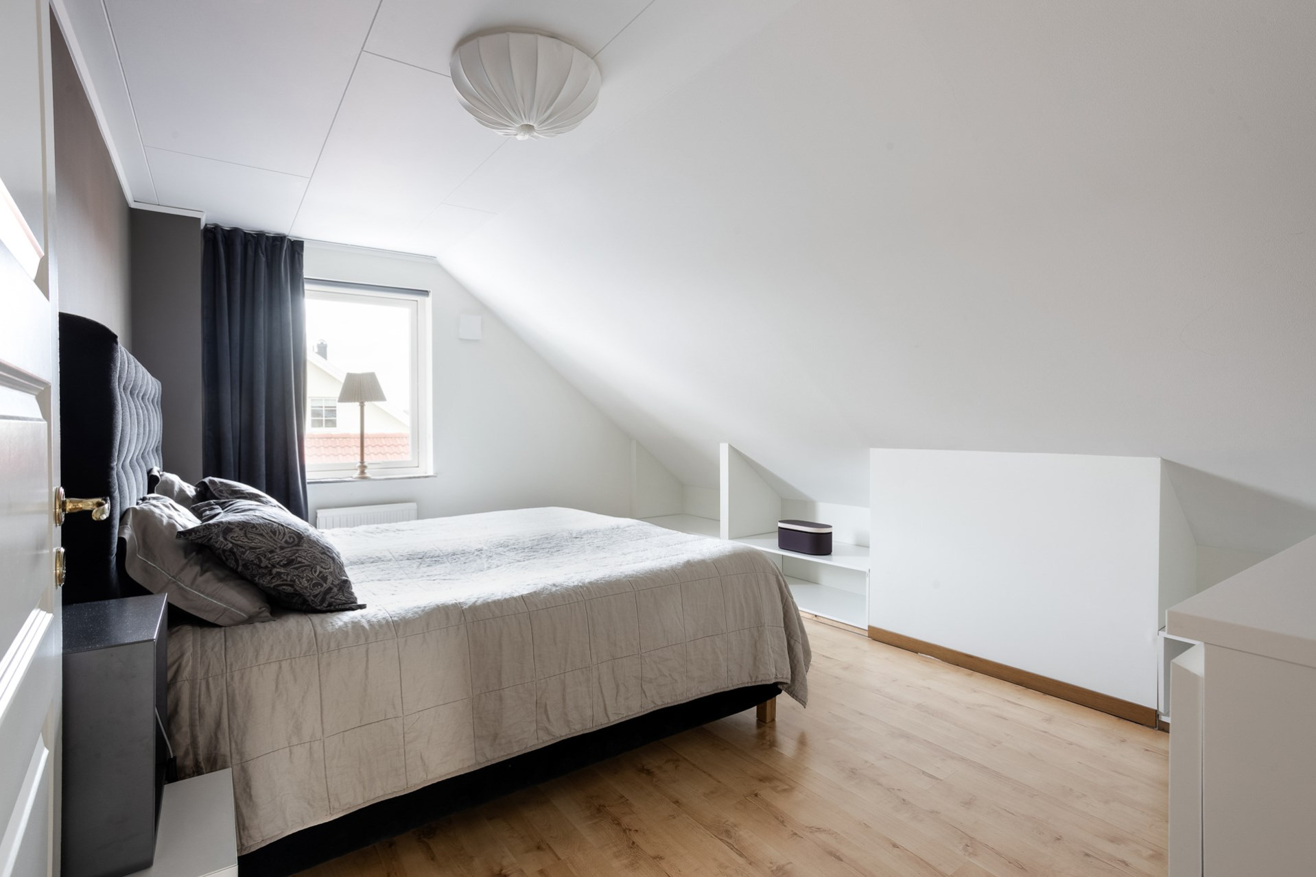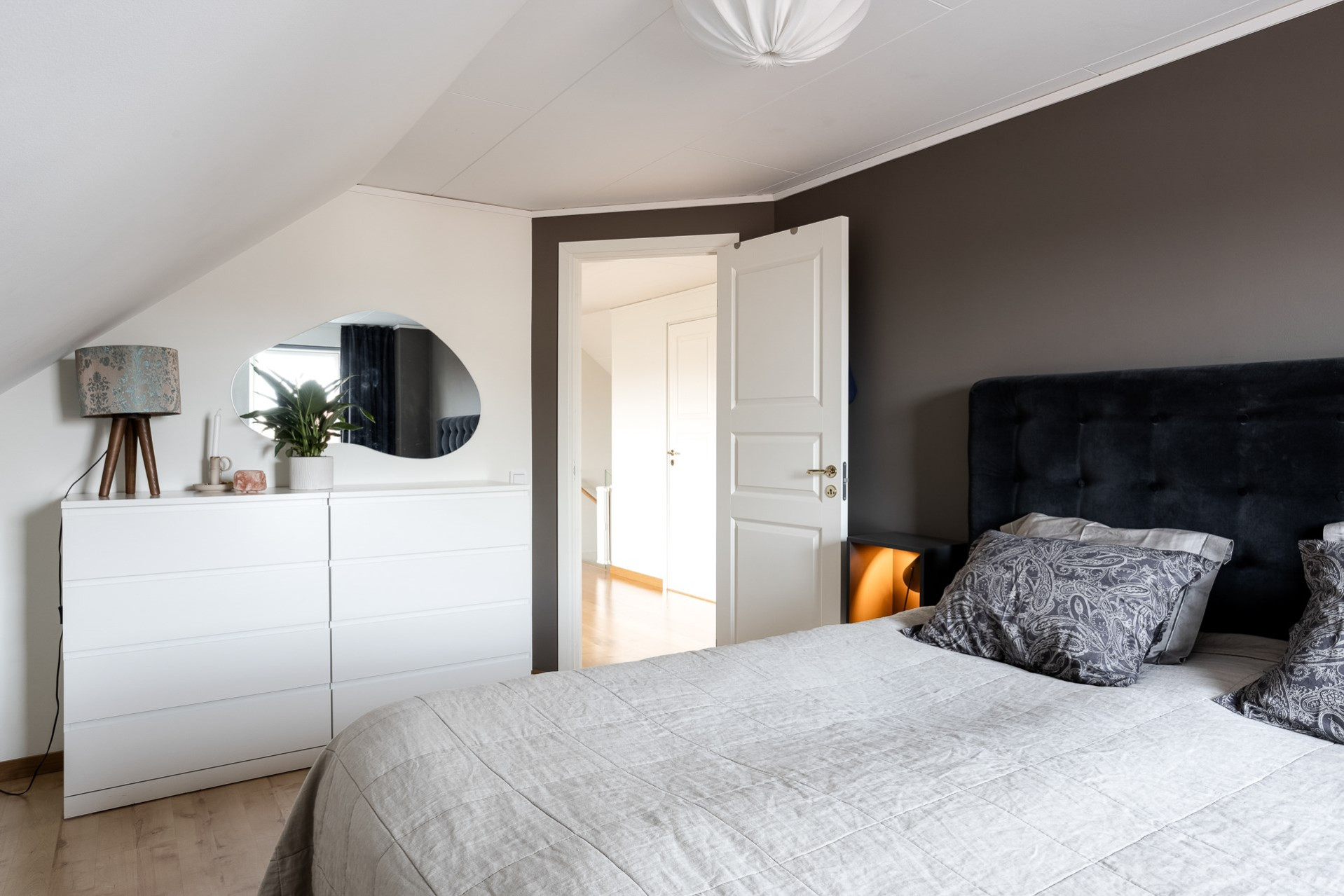 Sovrum 2 - Väl tilltaget sovrum med plats för dubbelsäng och sängmöbler. Släta målade väggar och laminatgolv. Kattvind som öppnades upp 2021 bidrar med extra rymd och goda förvaringsmöjligheter.