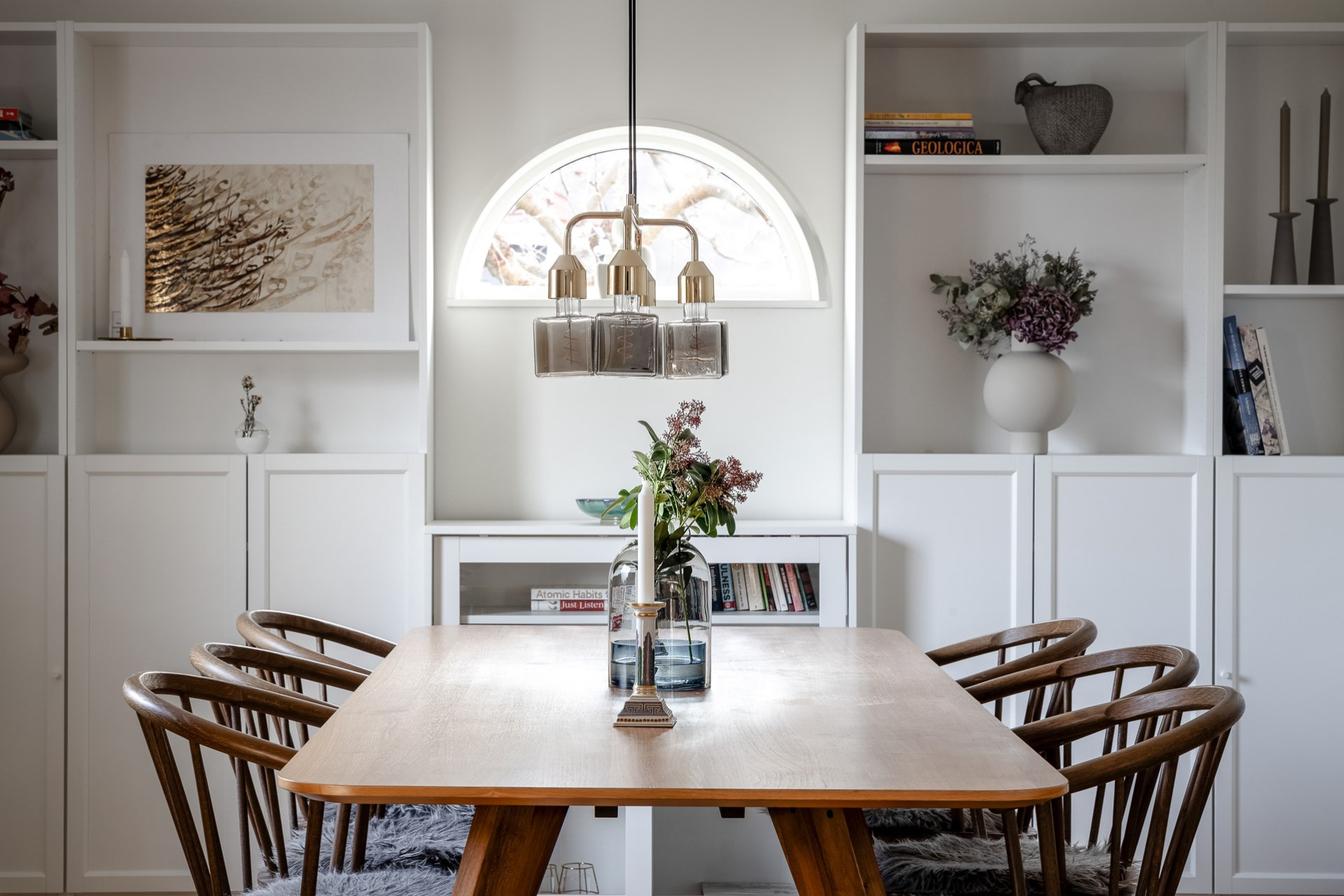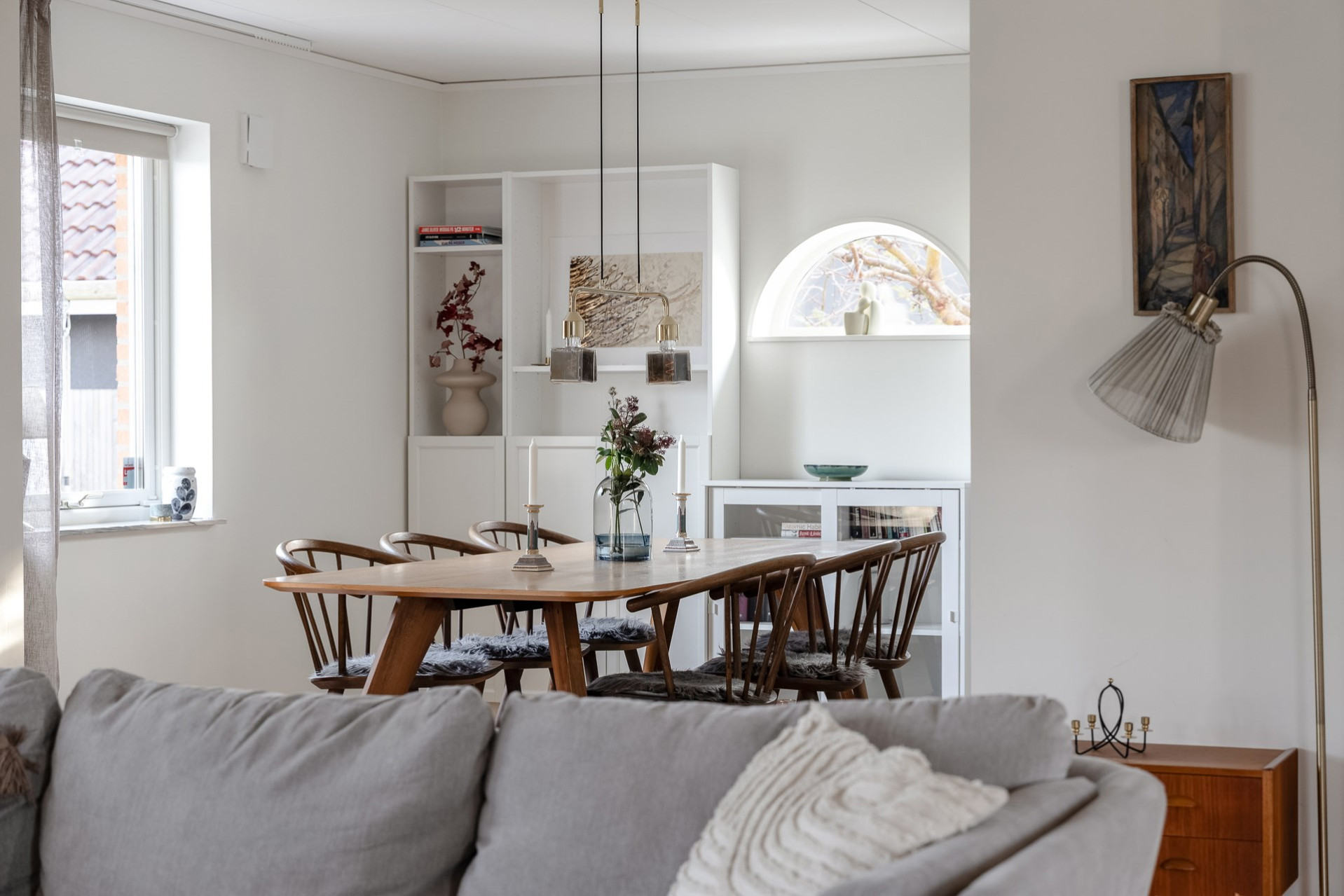 Matplats/Sovrum 5 - Rymlig och trivsam matplats med plats för större matgrupp, i öppen anslutning till vardagsrummet. Rummet kan enkelt anpassas till sovrum vid behov. Släta målade väggar och trägolv Kährs Cornwall Mattlackad Borstad Ek 1-stav från 2021.