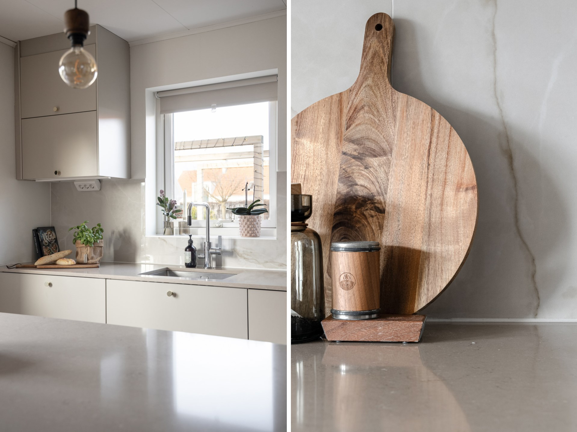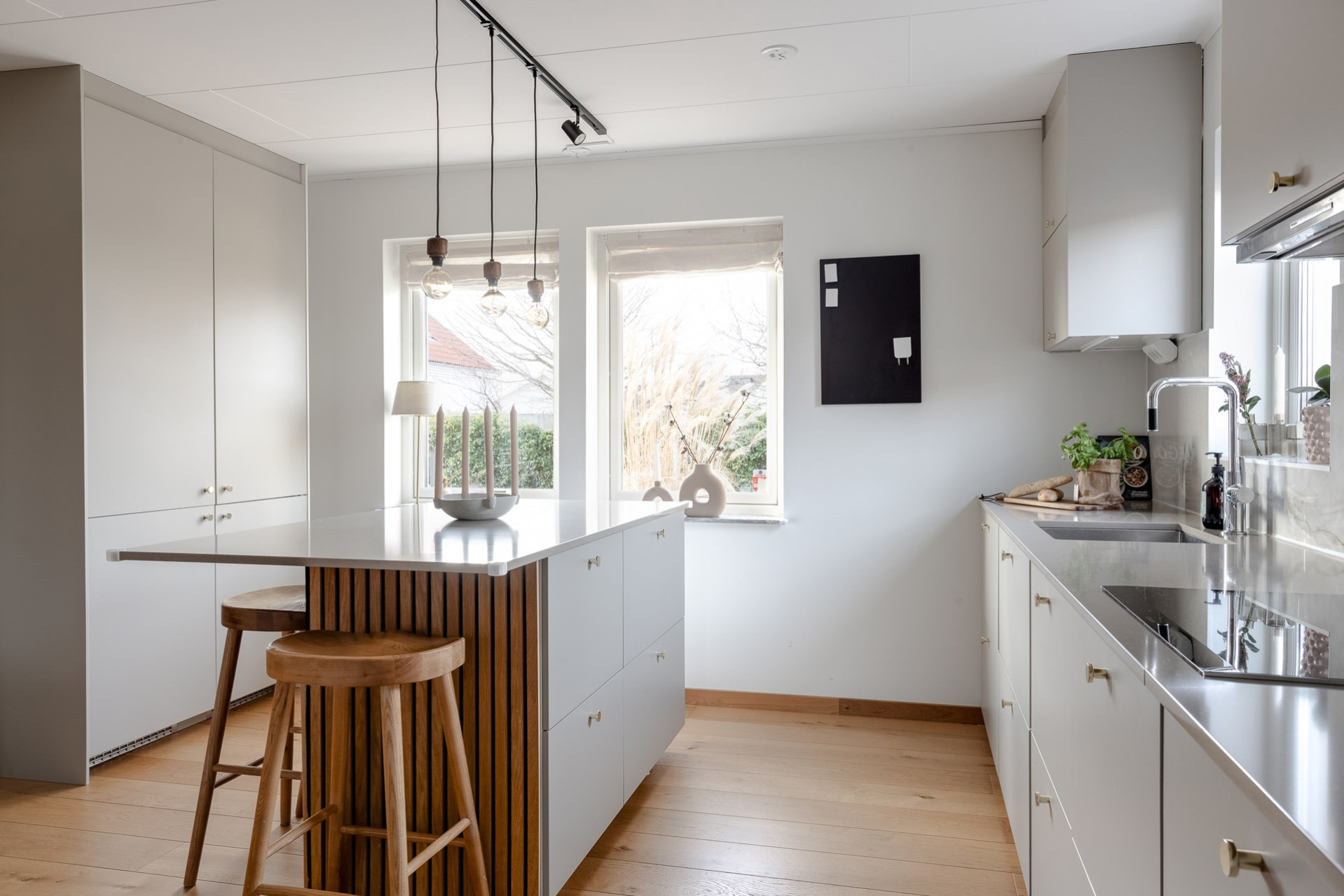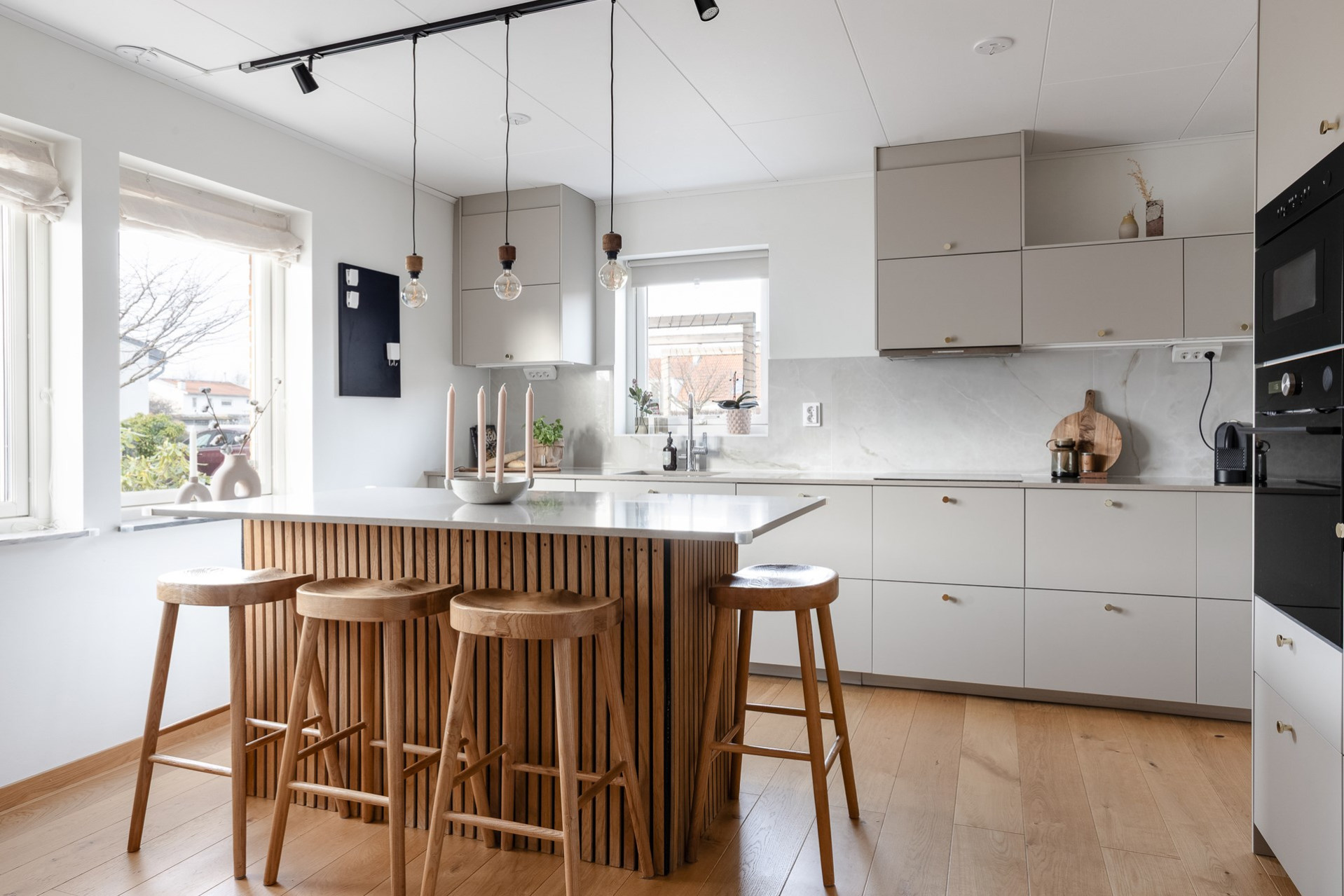 Kök - Stilrent och exklusivt Ikeakök (Havstorp) som renoverades 2021 och badar i naturligt ljus. Köket är öppet mot vardagsrummet och köksön skapar en social och funktionell yta. Beiga släta köksluckor kombineras med kakel ovan Silestone kvarts bänkskiva. Utrustningen består av fläkt (Miele), induktionshäll, inbyggd ugn, inbyggd mikro, inbyggd diskmaskin, inbyggd kyl samt inbyggd frys.
