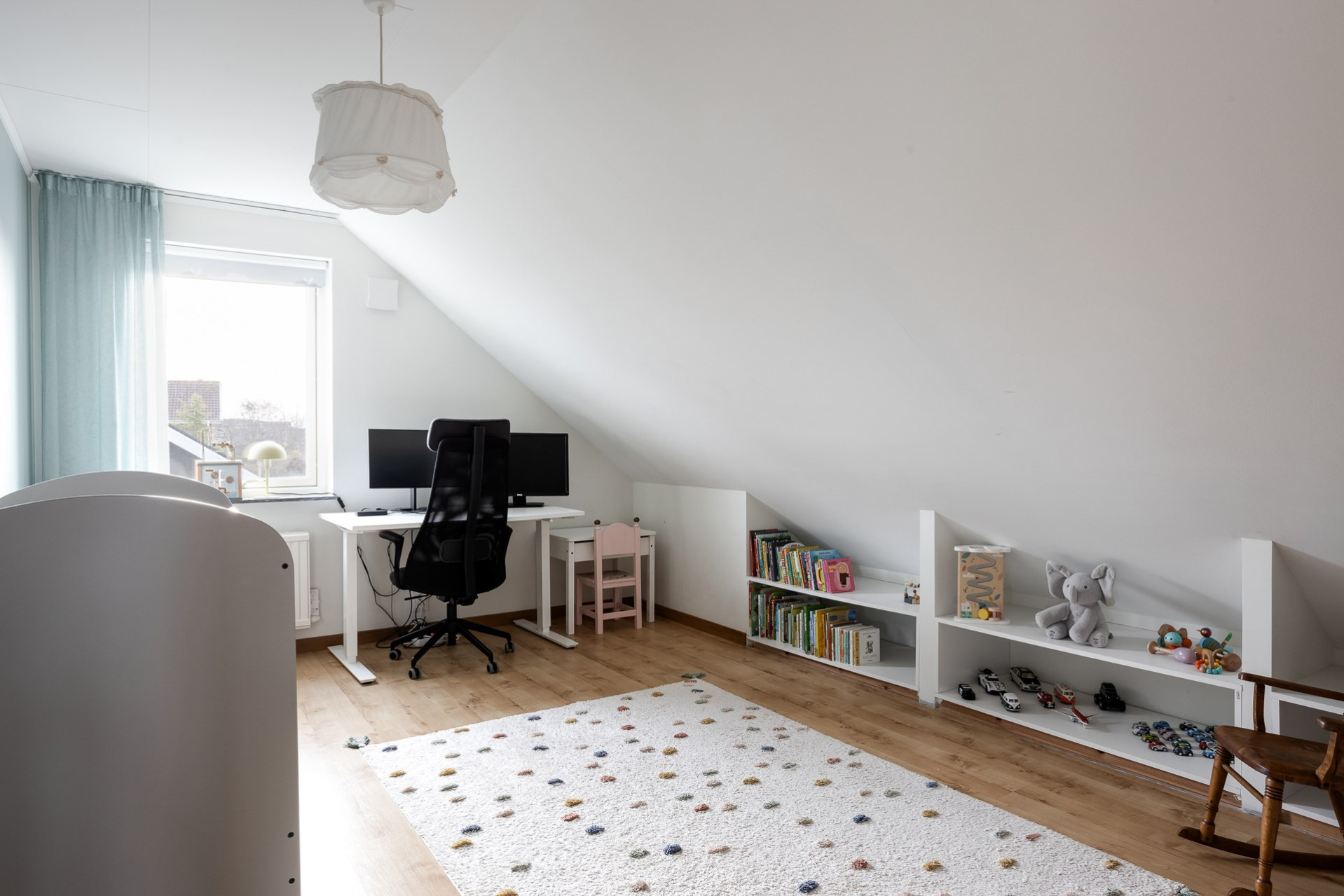 Sovrum 4 - Ytterligare ett sovrum eller barnrum med flexibel användning. Släta målade väggar och laminatgolv. Kattvind som öppnades upp 2021 skapar extra rymd och praktisk förvaring.