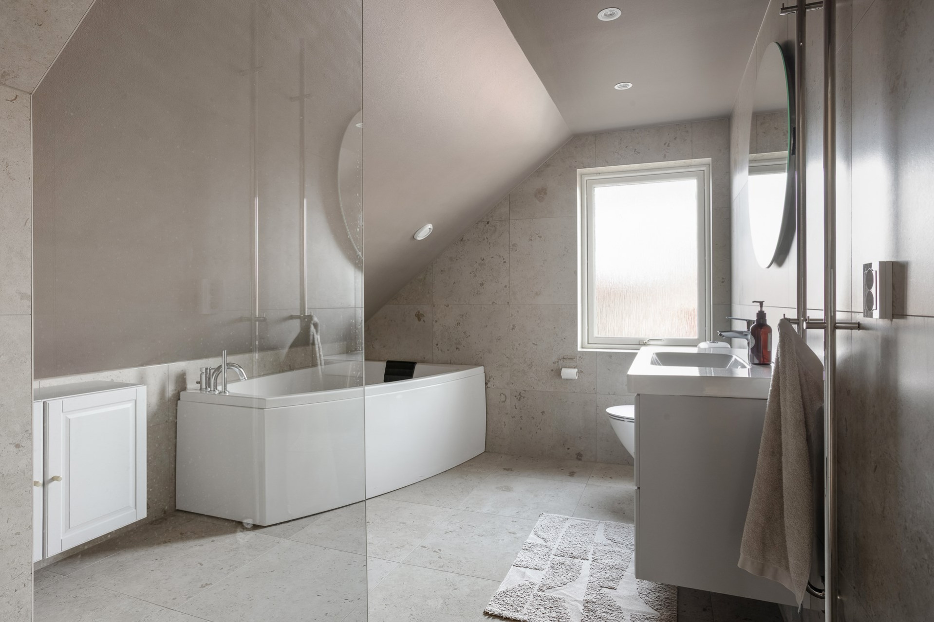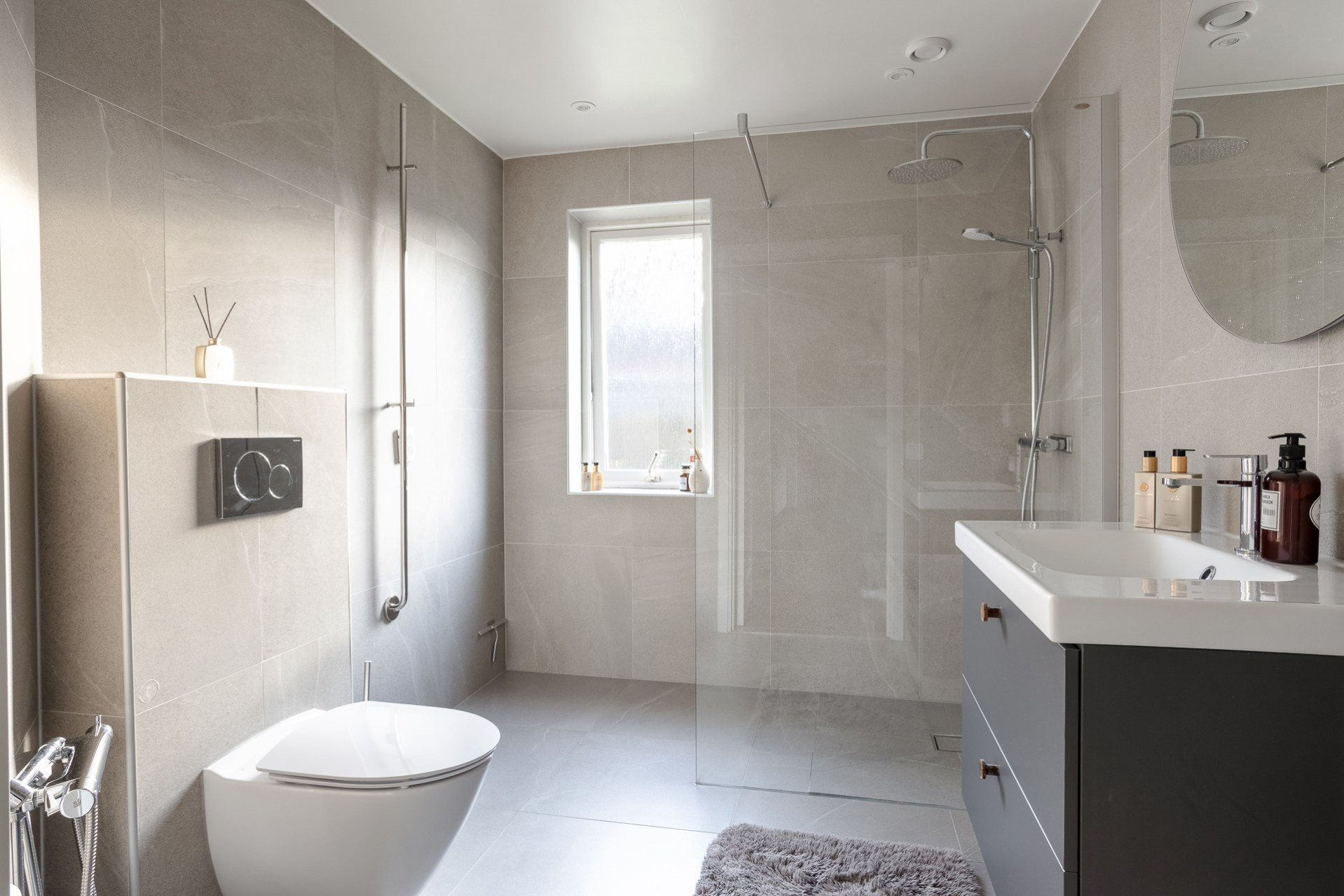 Badrum - Smakfullt och exklusivt badrum som totalrenoverades 2021. Ljust kakel och klinker med vattenburen golvvärme, infällda spotlights i tak samt handdukstork (el). Utrustat med dusch, handfat med kommod med god förvaring samt toalett.